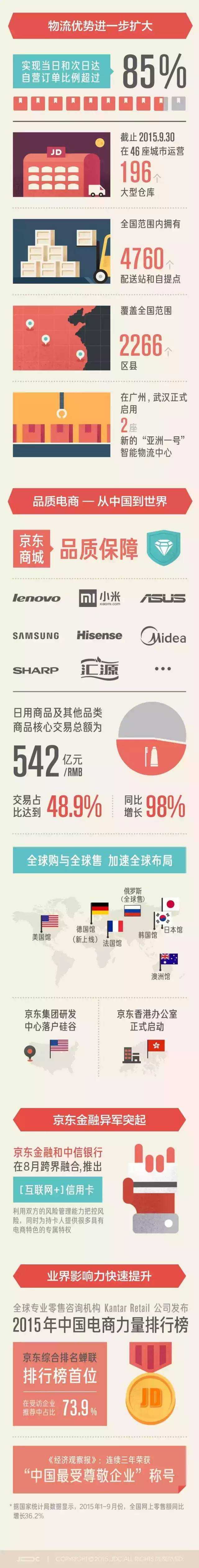 “京东在2015年三季度保持了健康的收入增长,用户数增长喜人,各品类业绩表现良好。”京东首席财务官黄宣德先生表示,“中国电商行业正在经历向自营电商的转型。作为自营B2C电商的领导者,京东从中获益良多。我们将继续对核心业务和快速增长的新业务进行战略性的投资。”