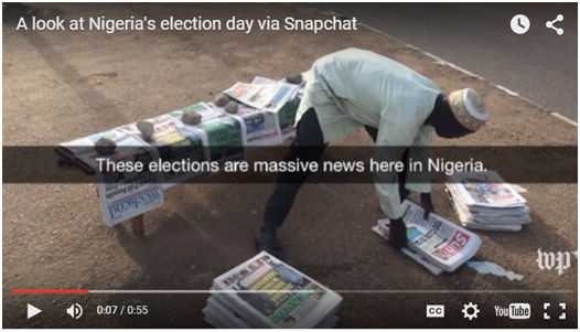 希尔福是第一次使用Snapchat,对尼日利亚三月的大选进行报道,但他人在农村的卡杜纳州西北部,感觉距离美国读者好几百万英里远的地方。他的照片获得了不少回应,虽然许多回应跟尼日利亚的大选根本无关,但是在艰困的报道日子中,还是获得了一些藉慰。