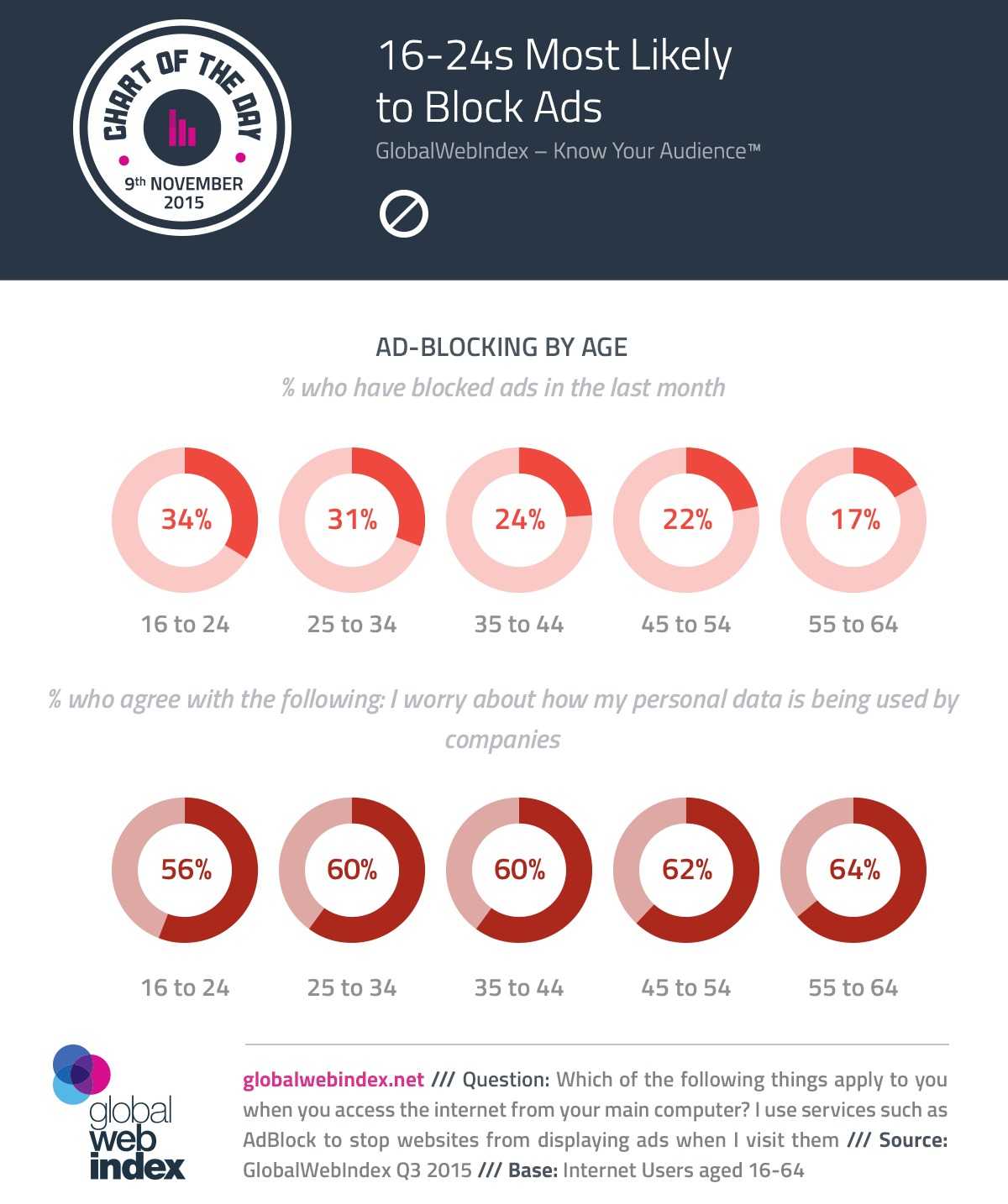2015年第三季度的数据显示年轻人仍然是最喜欢使用广告拦截软件的群体。每个月全球超过1/3的16到24岁网民表示使用广告拦截应用,尤其是在欧洲,比例达到42%。