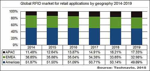 该题为“2015-2019年全球RFID零售应用市场”的报告,将市场按三个主要的地区进行划分。2014,美洲占52%,欧洲、中东和非洲(EMEA)市场占37%,亚太地区(APAC)大约有为11%。