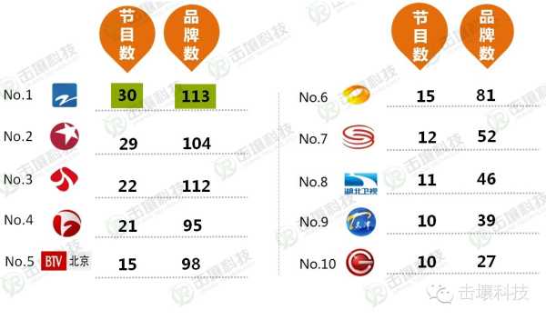 浙江卫视、东方卫视、江苏卫视名列前三,植入品牌数量均过百,节目数量也超过20档,安徽、北京卫视位居4、5位,湖南卫视排名第6,其余频道与排名前六卫视在节目数以及品牌数量均有一定差距。