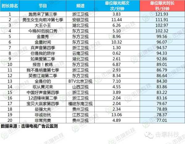 最新10月单位植入曝光中,《跑男来了第三季》虽节目时间有限,但给予客户的回报丝毫不减,单位植入曝光时长排名第一(121.93秒/分钟),第2、3位的为《男生女生向前冲第七季》(111.91秒/分钟)、《大王小王》(102.97秒/分钟),东方卫视的《今晚80后脱口秀》、《金星秀》、《金星时间》位居植入时长4-6位,其他节目植入时长也超过了60秒/分钟。