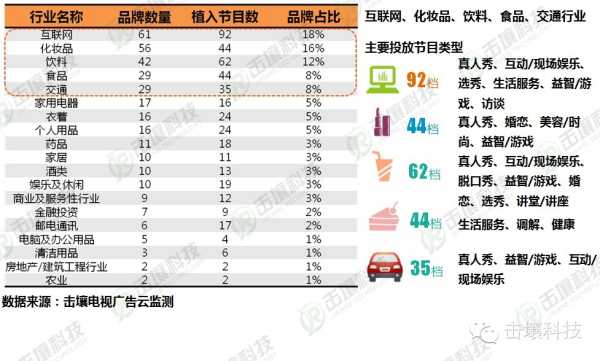互联网、化妆品、饮料、食品、交通行业更为热衷于软广植入,其主要投放的行业除真人秀外,互动/现场娱乐、益智游戏选择较多。
