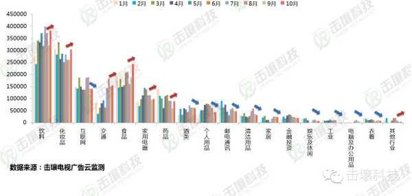 饮料、化妆品、交通、食品、家用电器、药品等植入时长较多的行业,10月环比上月基本均有上涨,其余植入量相对较少行业有不同程度下降。