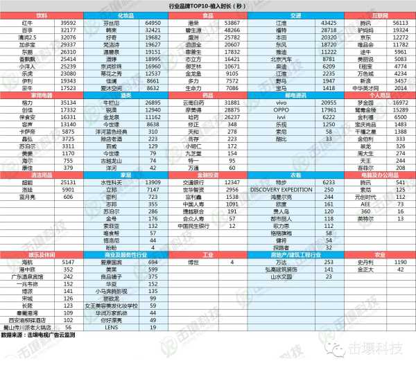 家用电器:格力依旧处于领先地位,保食安、容声、创佳植入量时长多万,其他国内驰名品牌,海尔、康佳也进入前十位;