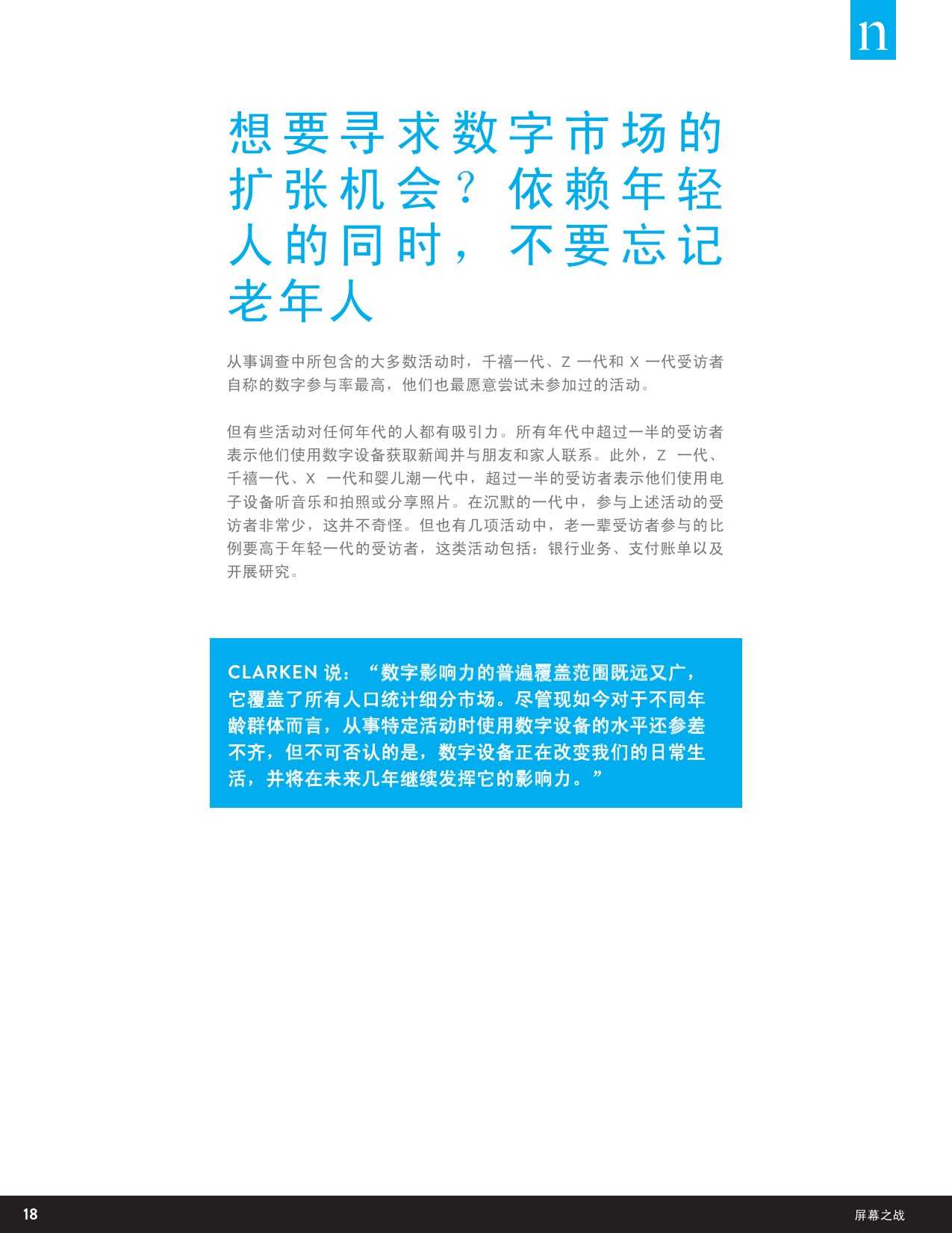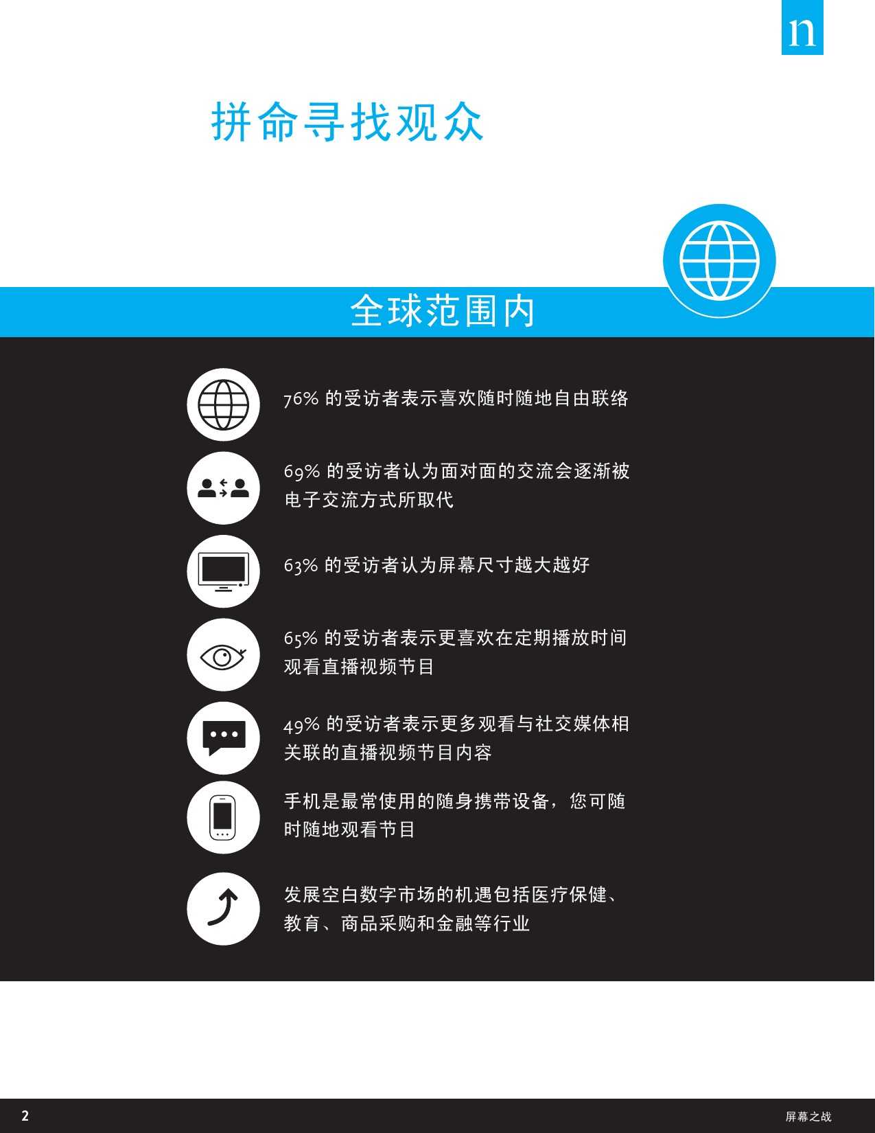 在一项尼尔森最新的全球调研中,78%的中国受访者认为电子设备正在取代人们面对面的交流。尼尔森最新发布的《屏幕之战:多屏时代的观众之争》报告显示,在如今,四分之三的全球受访者、86%的中国受访者正尽情享受随时随地被连接的自由,该报告通过对来自全球消费者的调研,试图揭秘正在迅速变化的全球数字化视频内容的生态格局,以及消费者如何调整自己观看视频内容的模式和习惯,从而适应不断变化的媒介市场。
