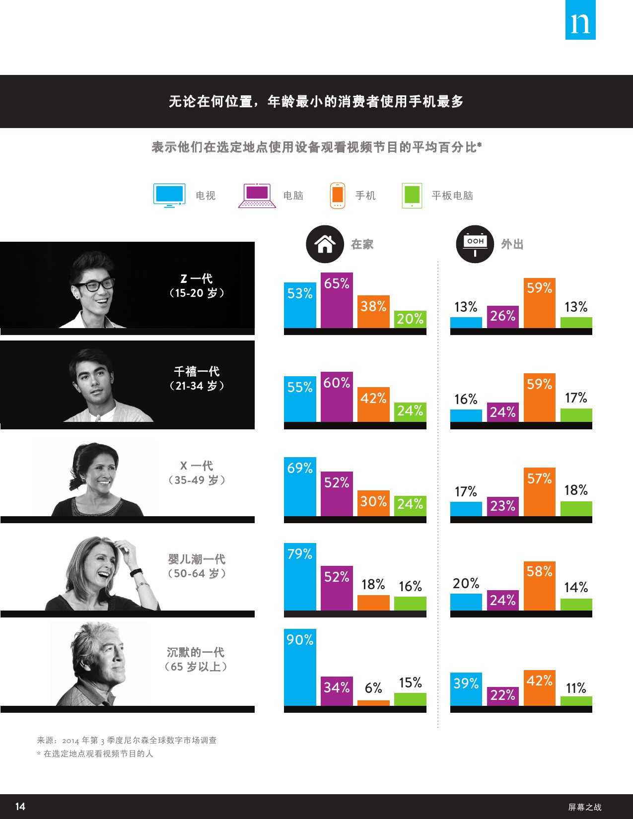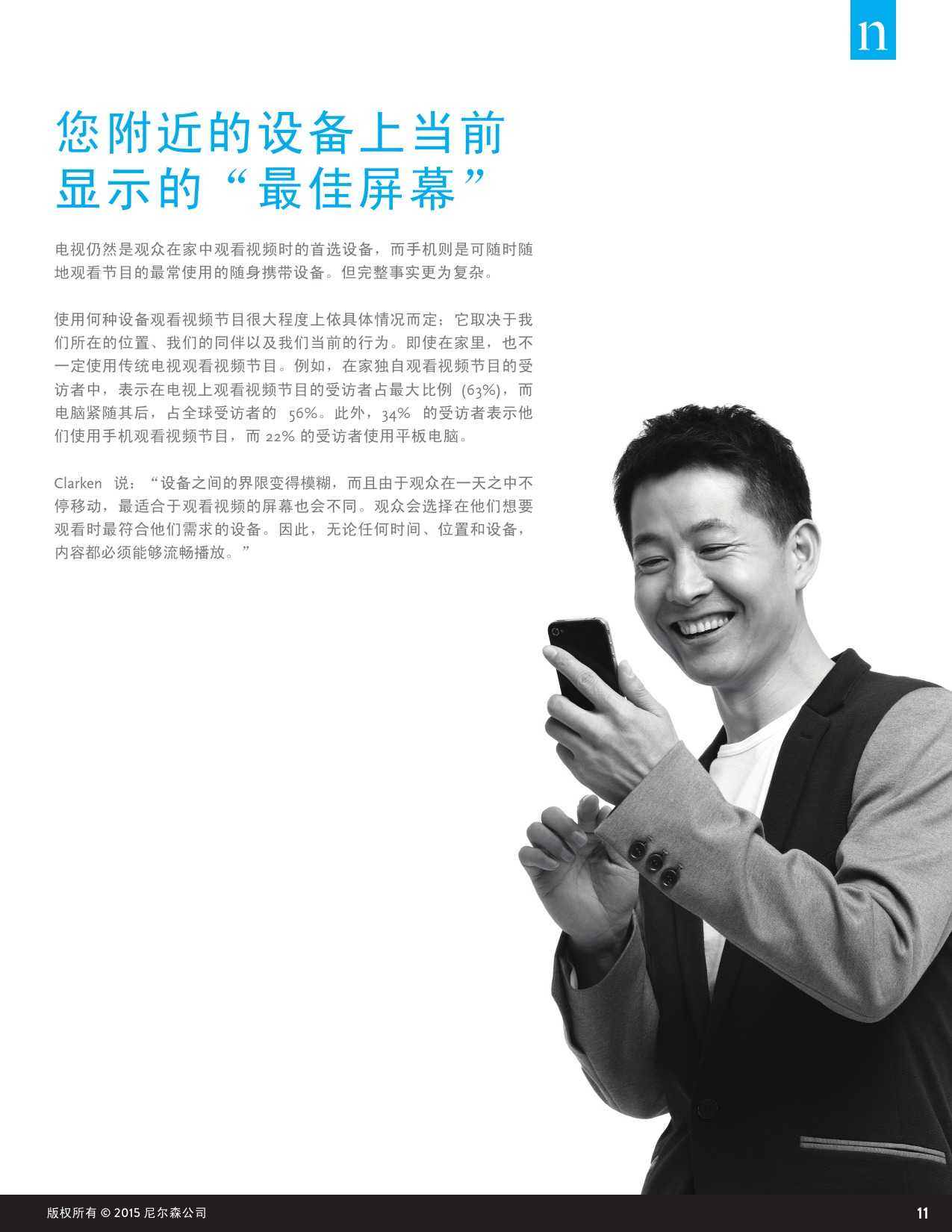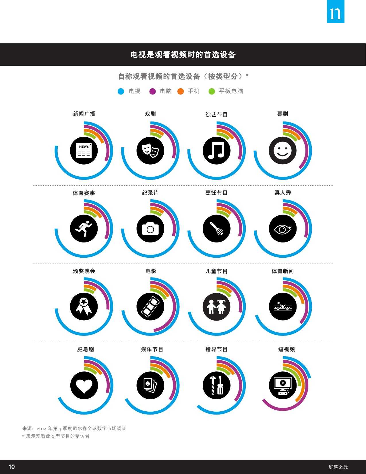 尼尔森“数字世界跨屏研究”力图研究不断变化的数字世界对人们观看视频内容的方式、平台的影响,以及背后的原因等。这里提到的视频节目是指电视节目、有线节目、专业视频以及用户原创视频等内容,播放平台包含电视、电脑以及手机、平板和电子阅读器等移动设备。此外,该调研也针对消费者对视频节目的观看偏好,包括对于特定类型的视频内容最常用的观看设备,以及在家中或在户外观看视频内容时 对不同设备的选择习惯等。