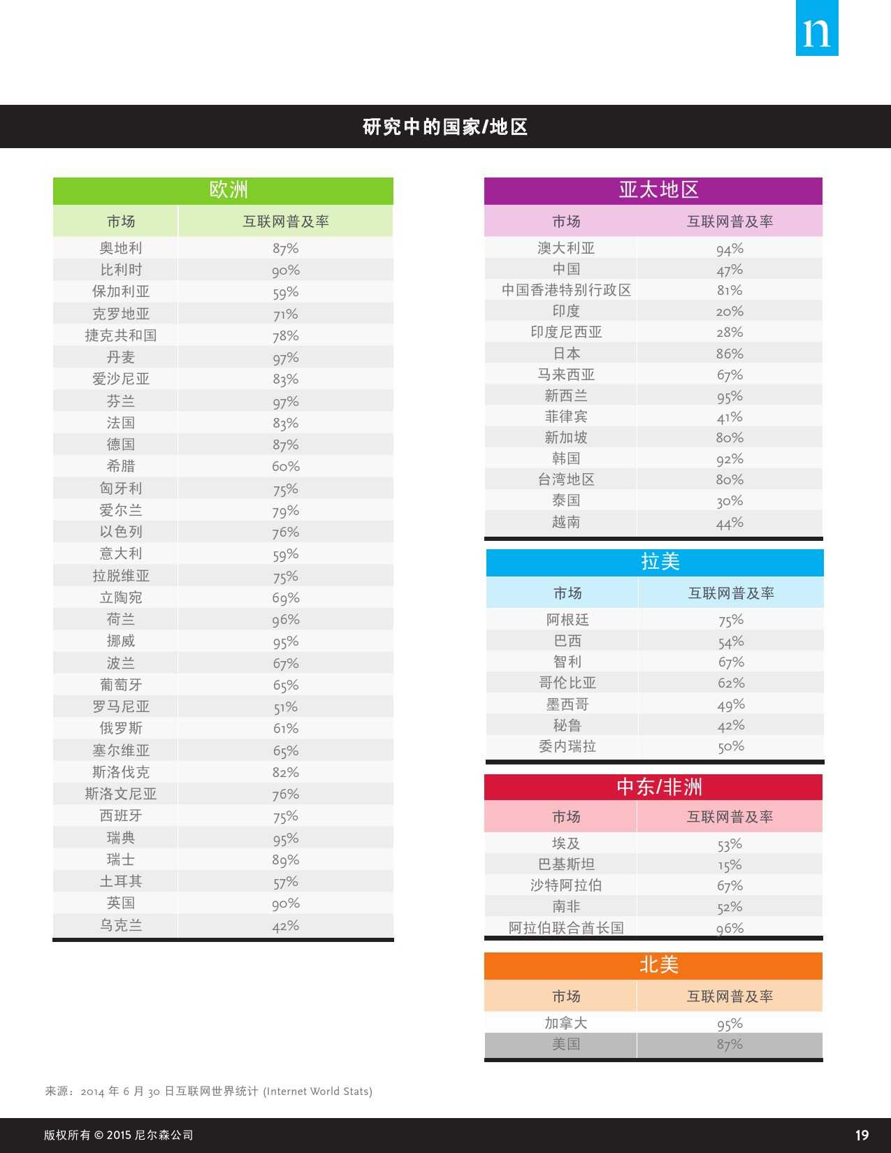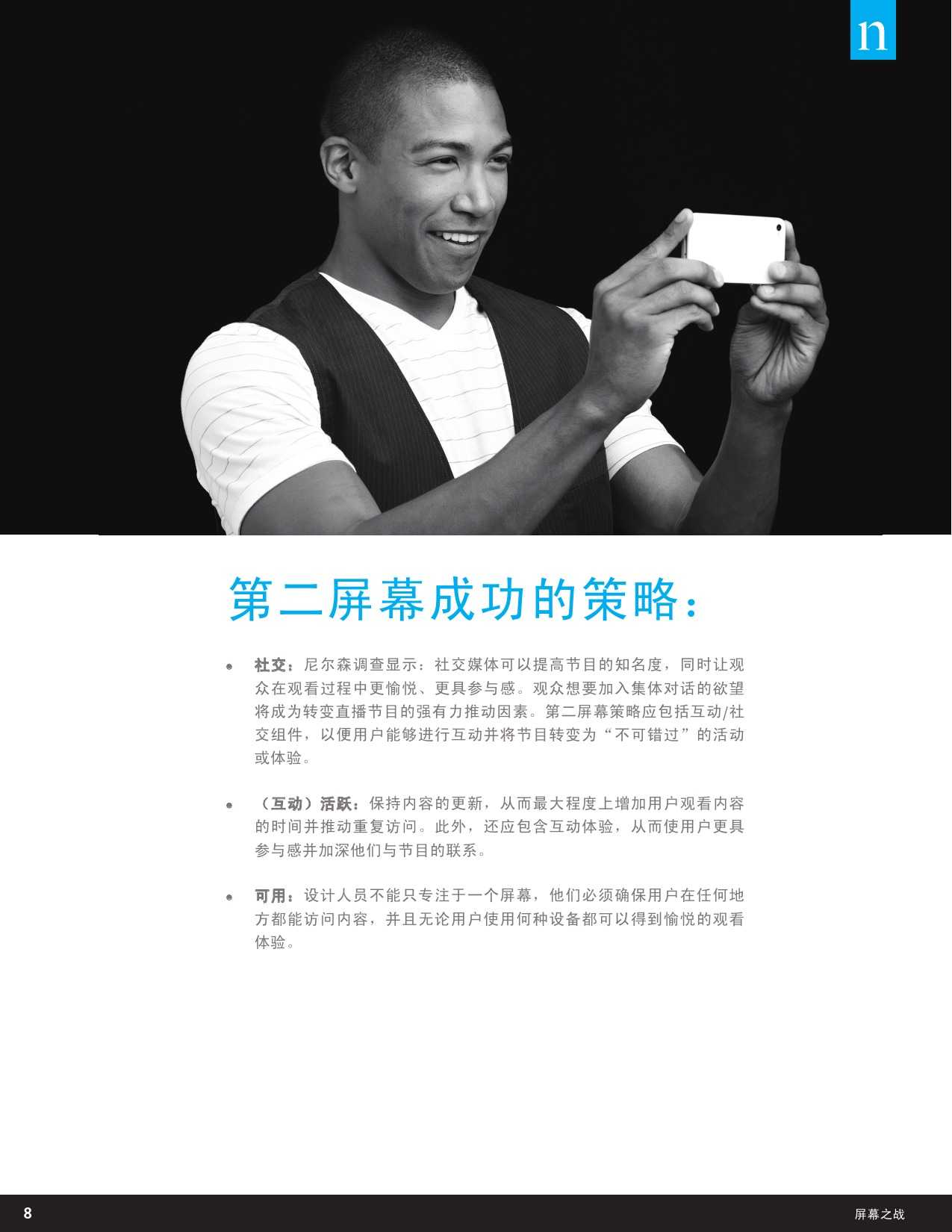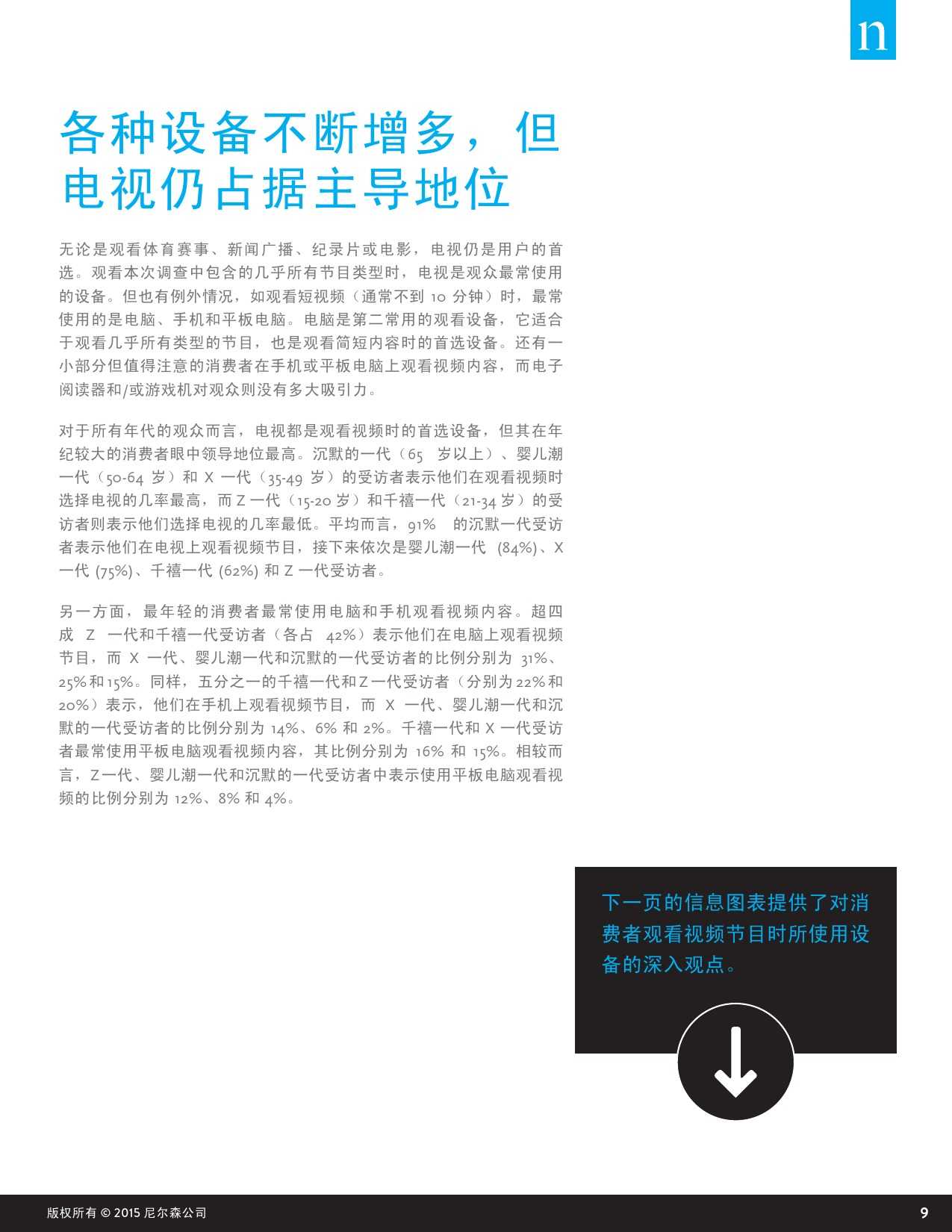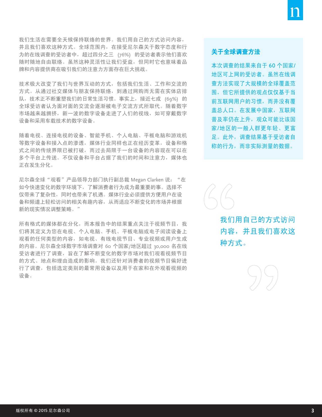 尼尔森“数字世界跨屏研究”力图研究不断变化的数字世界对人们观看视频内容的方式、平台的影响,以及背后的原因等。这里提到的视频节目是指电视节目、有线节目、专业视频以及用户原创视频等内容,播放平台包含电视、电脑以及手机、平板和电子阅读器等移动设备。此外,该调研也针对消费者对视频节目的观看偏好,包括对于特定类型的视频内容最常用的观看设备,以及在家中或在户外观看视频内容时 对不同设备的选择习惯等。