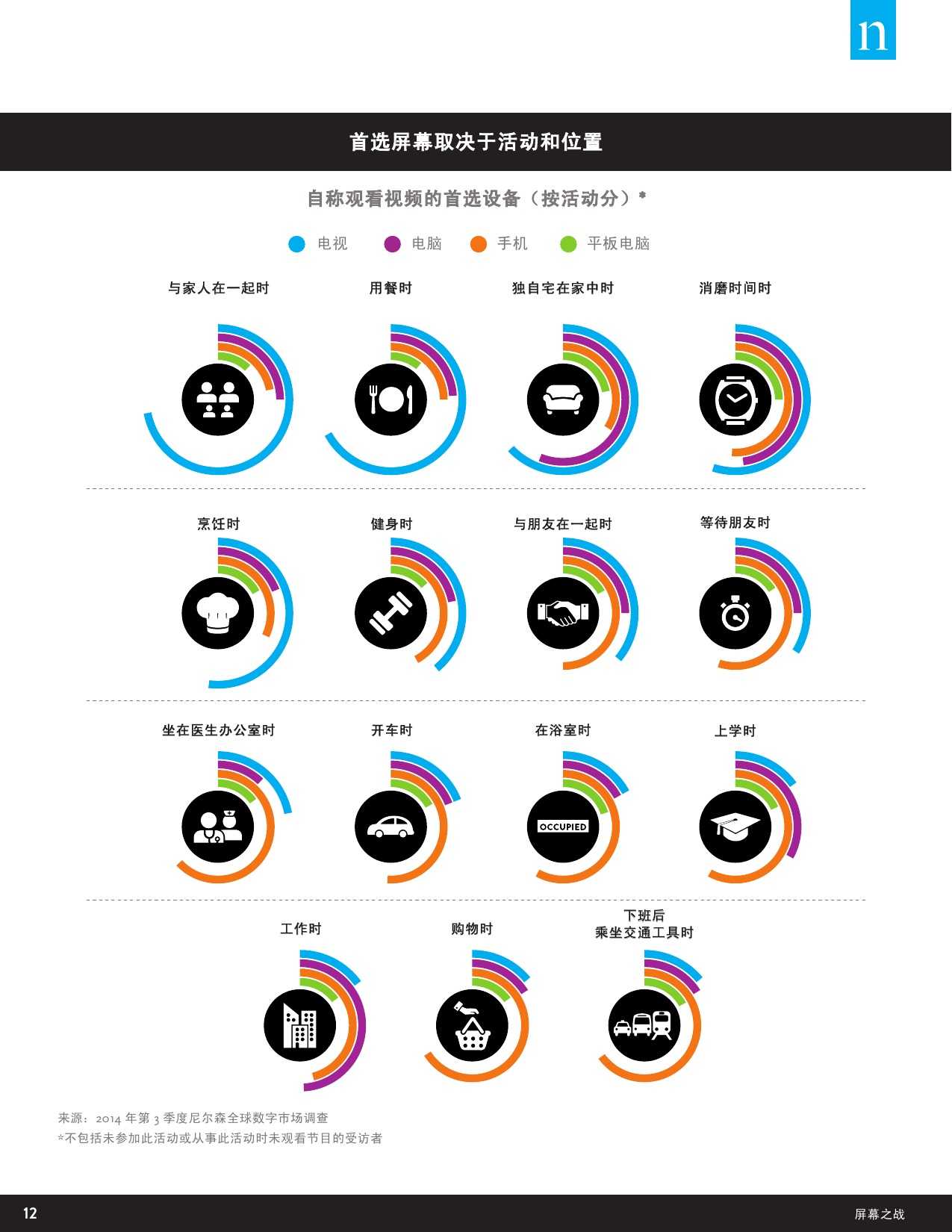 尼尔森的跨屏研究还指出设备的选择还因用户观看节目时的时间、地点以及正在做什么而异。与家人在一起时(54%)是中国消费者选择电视观看的最主要情况。独自在家时,64%的用户选择电脑,选择智能手机的比例是40%;为了消磨时光,50%和58%的用户会分别选择电脑和智能手机来观看视频。在一些碎片化的时间内,比如在等待朋友(62%)、等医生叫号(30%)、通勤(51%)、学校里(40%)、购物(41%)、运动时(30%)时,智能手机已经当之无愧成为用户观看视频的最重要媒介。