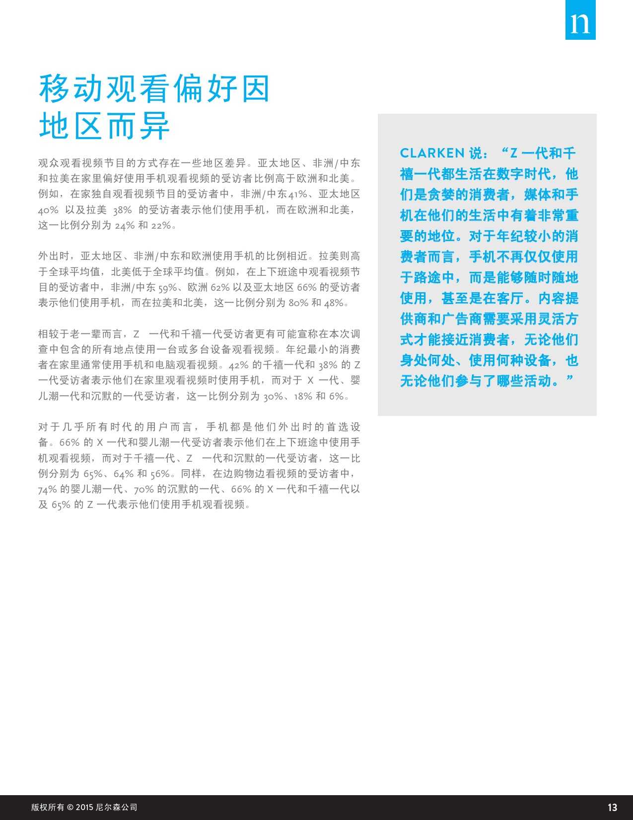 从年龄段差异性来看,电视在年龄偏大人群的主导性地位更明显,全球有大概90%的65岁以上老年人在家时,倾向于选择电视观看节目,仅有34%的老年人使用电脑、6%的人使用手机观看视频内容。相反,同样在家中时,有超过60%的年轻消费者(15-34岁)把电脑视作观看视频内容的最重要终端设备,其次才是电视及手机。