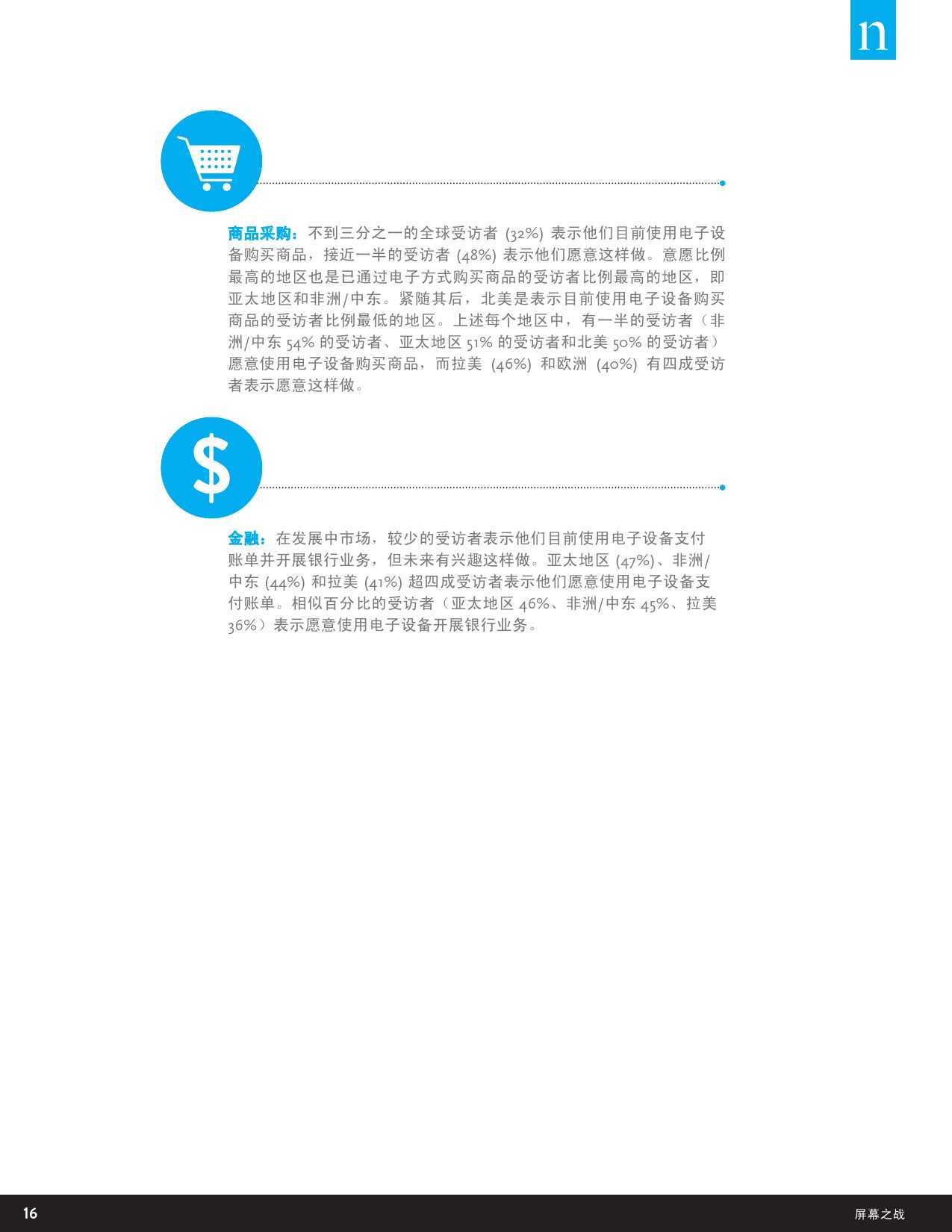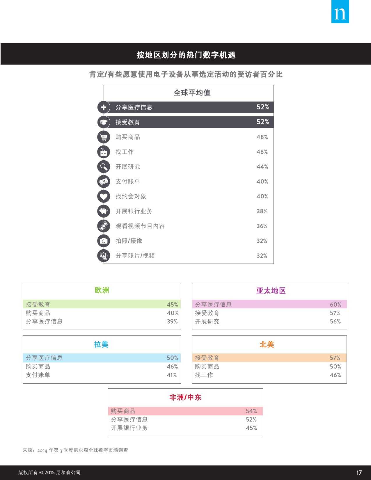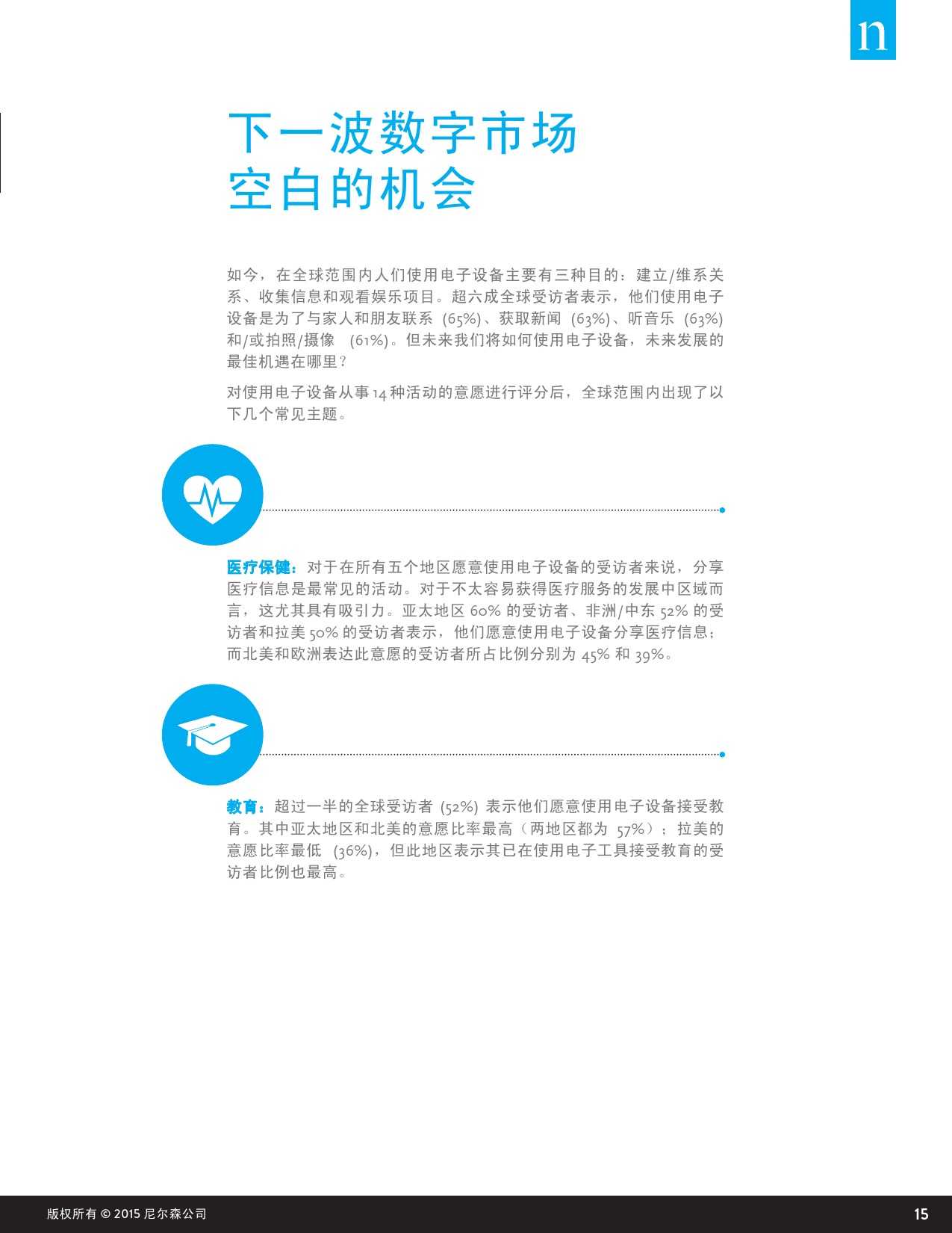 根据尼尔森的研究,今日的全球消费者使用电子设备的三大动机分别是建立或维系关系、信息搜集、休闲娱乐浏览。64%中国受访者选择用电子设备联系家人与朋友,听音乐(63%)、拍摄照片及视频(61%)、获取新闻(59%)等都是电子设备的重要功能。而就用户未来使用电子设备的使用倾向而言,在线教育、分享健康信息、职业选择等都将成为借助电子设备承载的新增长机遇。