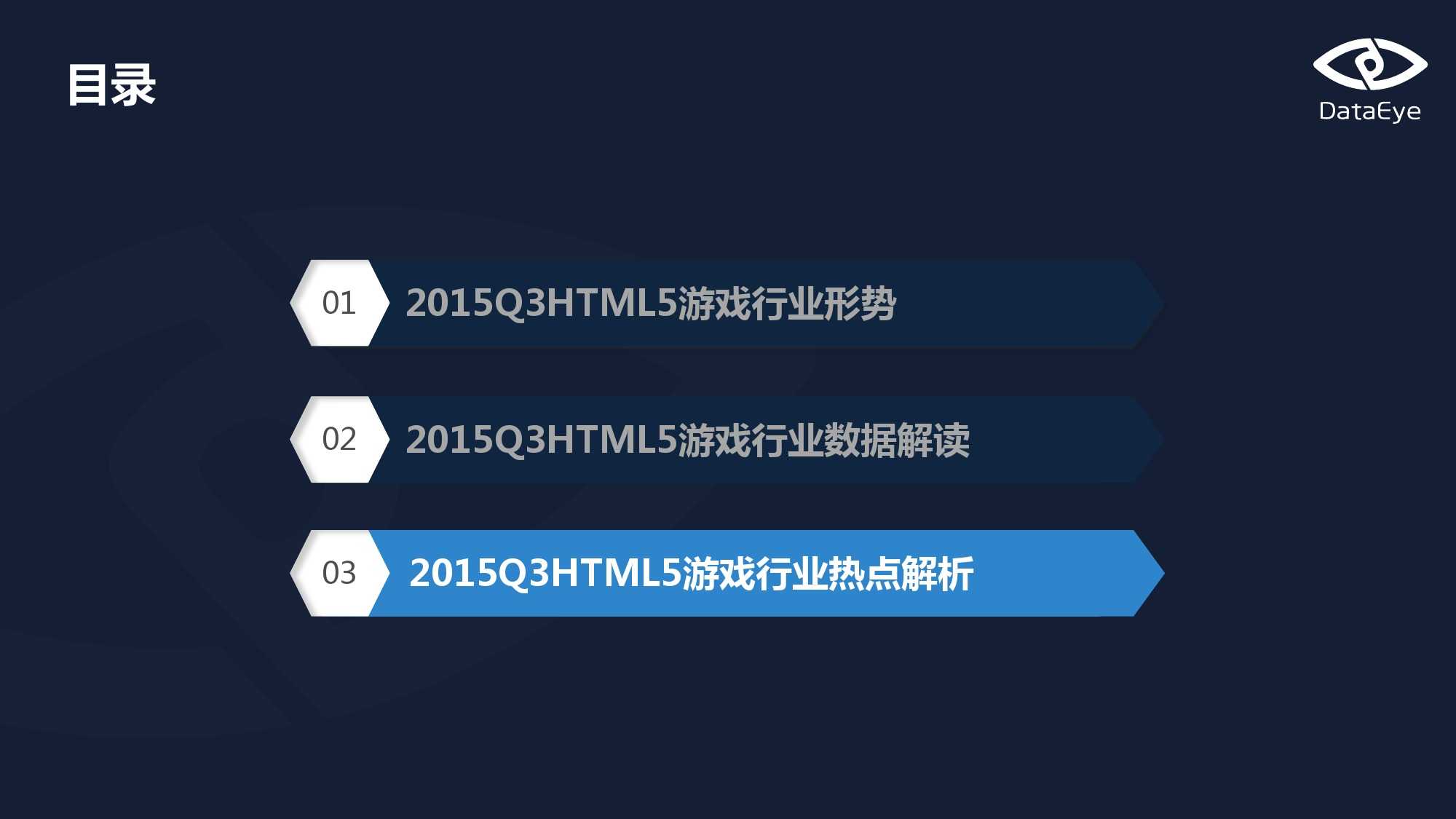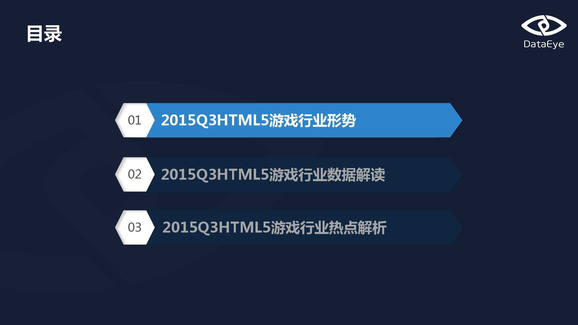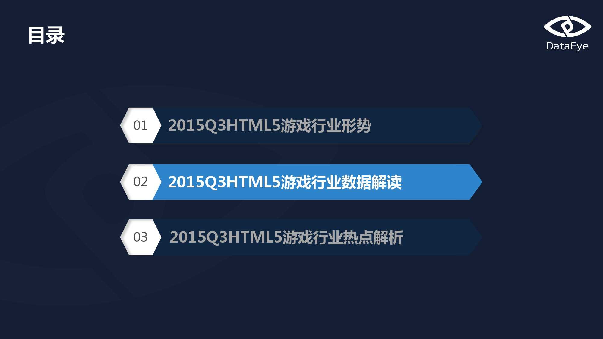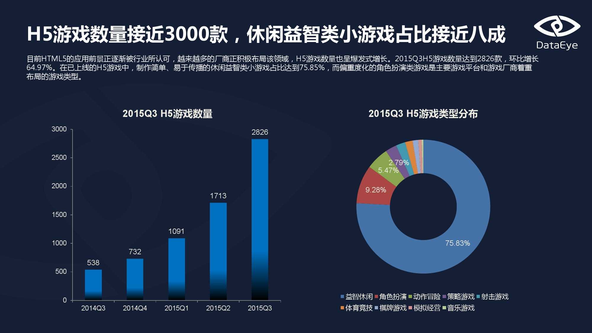 DataEye:2015年Q3 HTML5游戏数据报告 更多阅读:DataEye:2015年Q2 HTML5游戏数据报告同步游戏中心:2015年2月游戏数据报告2014年Q2应用汇游戏数据报告DataEye:2020移动游戏全年买量白皮书DataEye:2020年移动游戏半年度买量白皮书DataEye:2019移动游戏全年买量白皮书DataEye:2019二类电商广告投放白皮书DataEye:2015年泛娱乐白皮书Steam:全球游戏数据分析-中国单机游戏在趋于正版化2015年4月同步游戏数据报告DataEye:2020年10月份手游买量报告报告:释放可寻址电视的潜力报告:加速全球山地森林的消失威胁到热带生物多样性热点地区报告:未来十年或将塑造航空运输业的12大主要趋势报告:预计2022年全球贸易额达到创纪录32万亿美元