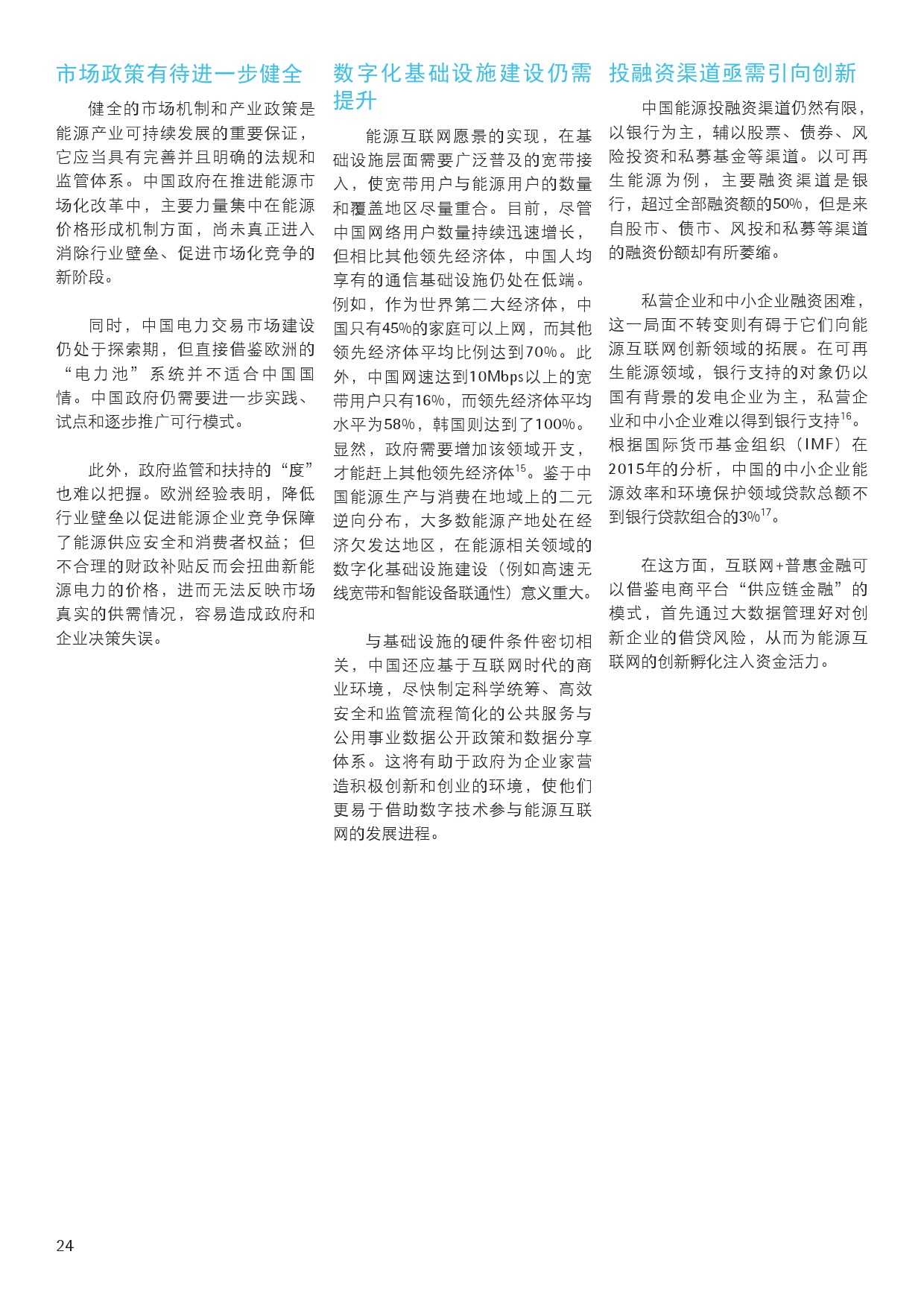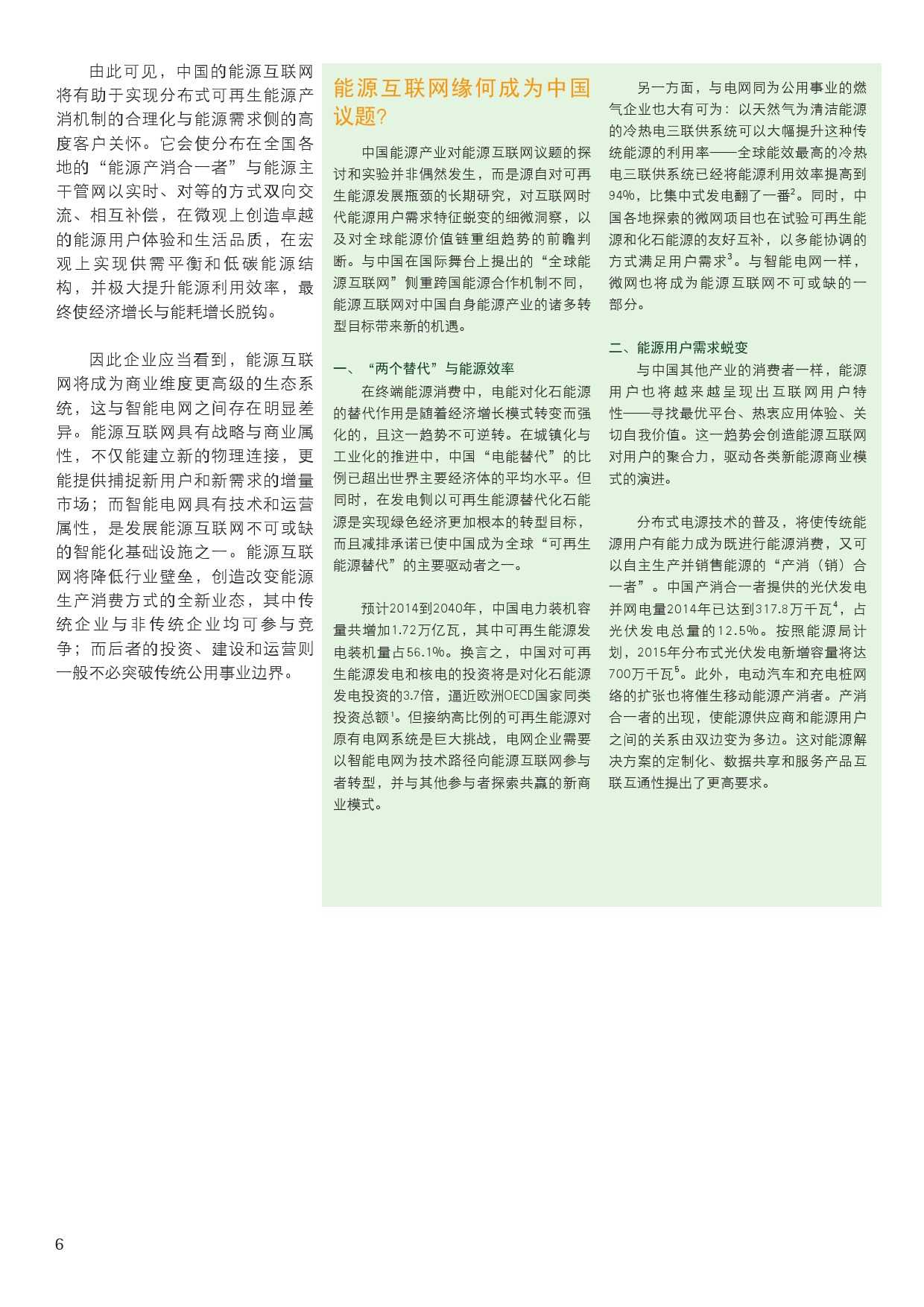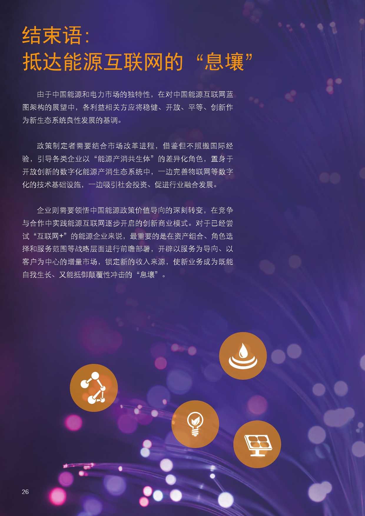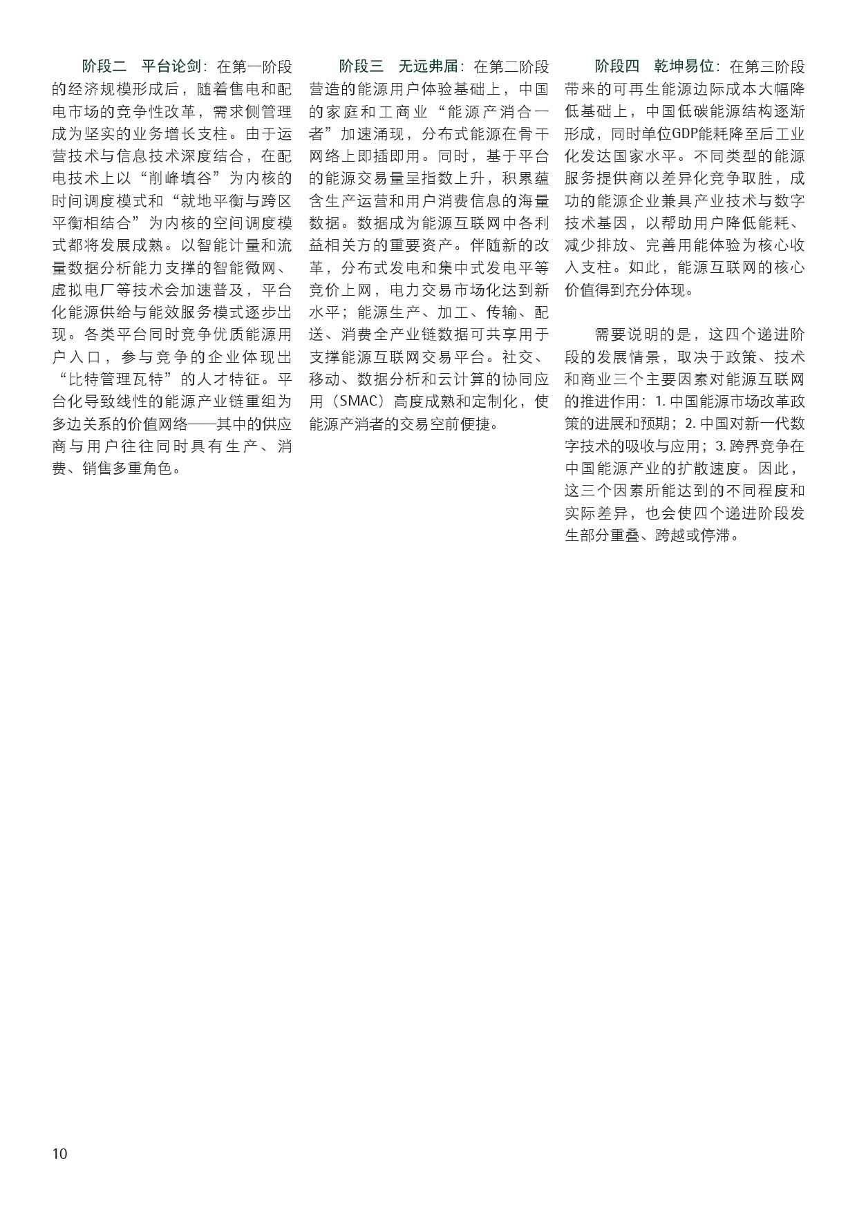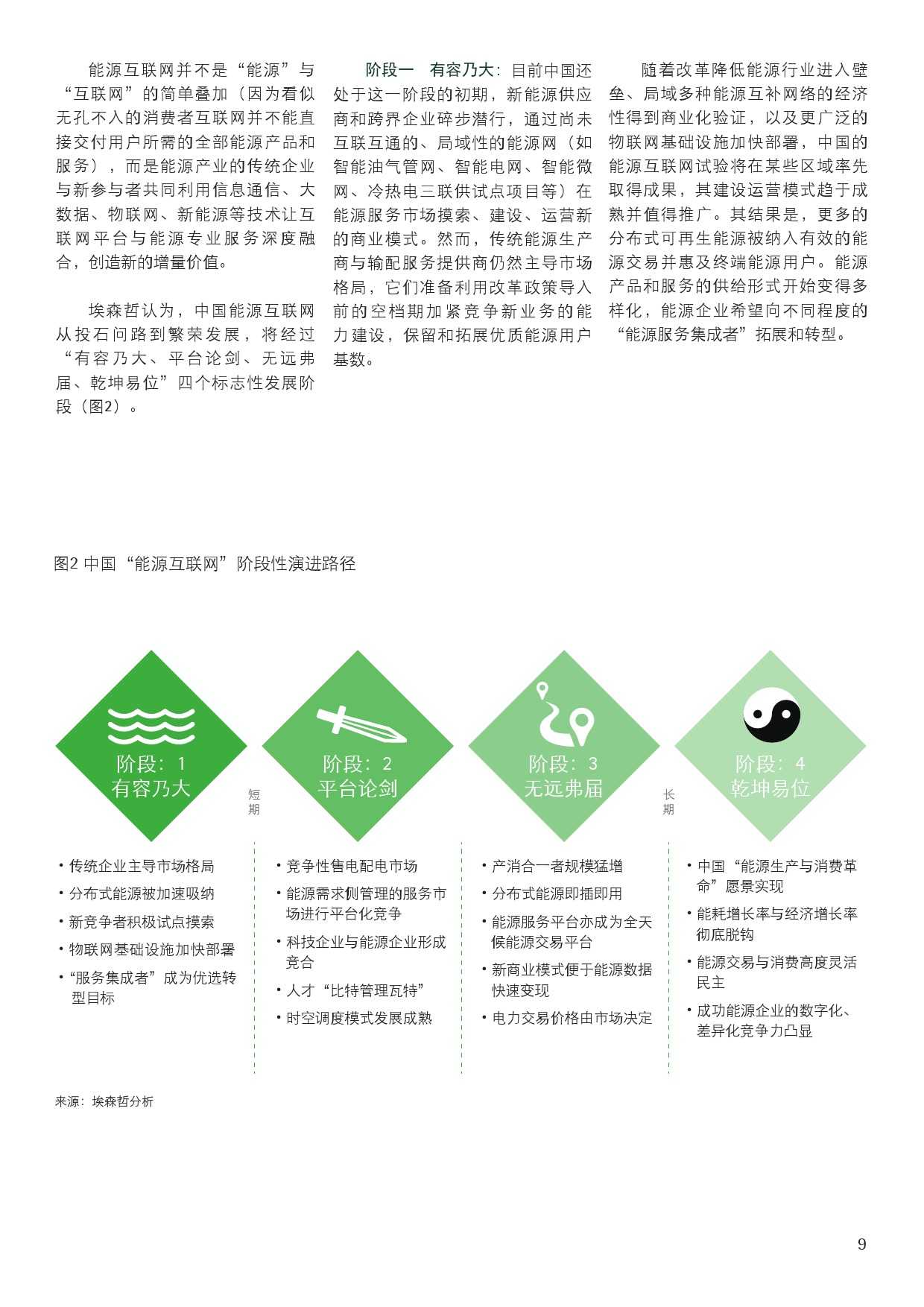 埃森哲报告认为,中国的能源互联网演化将经历四个阶段,目前还处在第一阶段:传统能源生产商与输配服务提供商仍然主导市场。不过随着改革降低能源行业进入门槛以及物联网设施加快部署,更多的分布式可再生能源将被纳入交易,能源企业将向“能源服务集成者”转型。