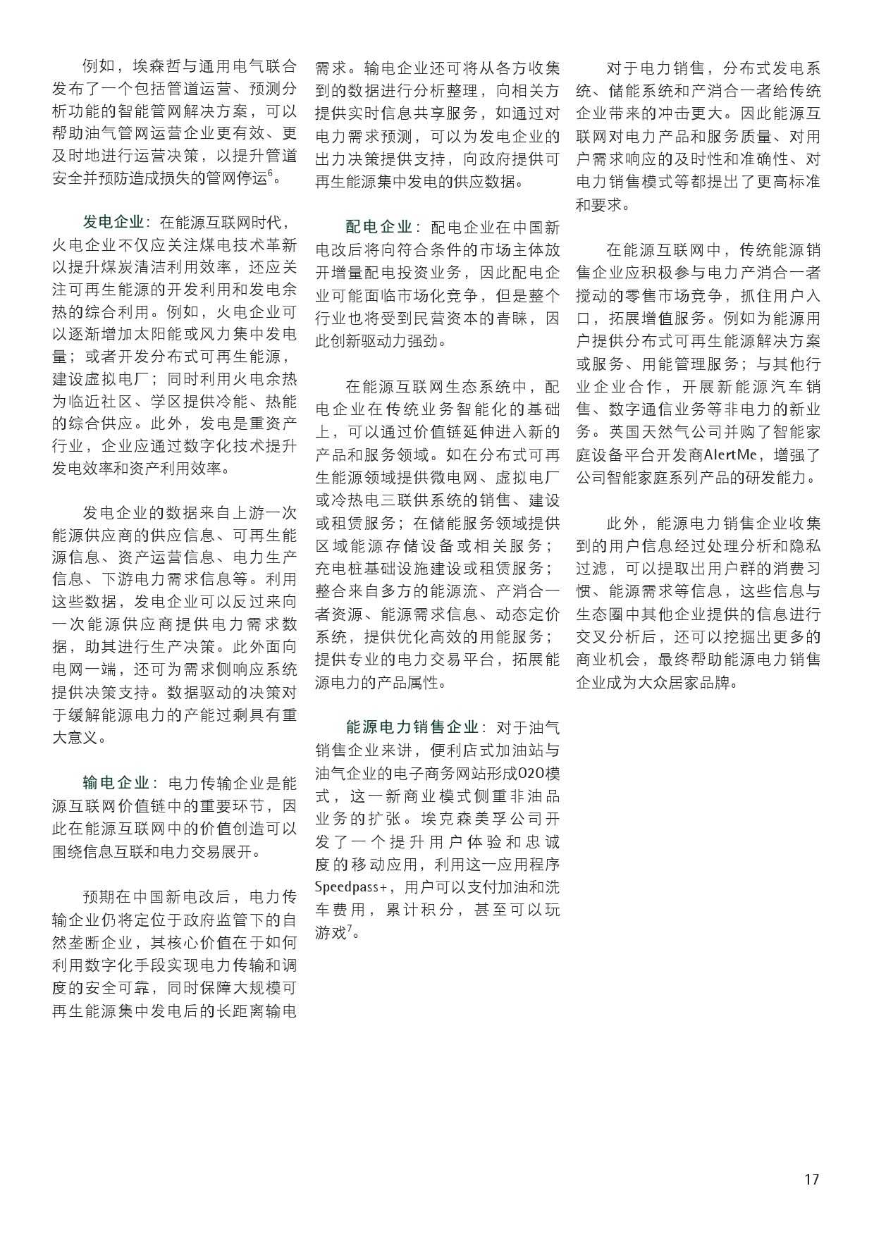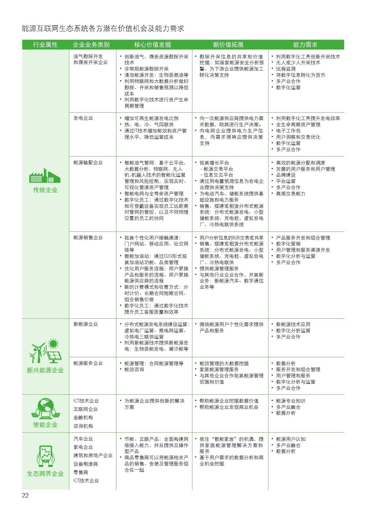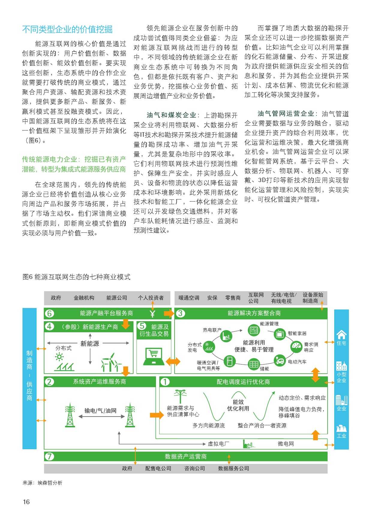报告也对中国各类企业如何进行价值挖掘提出了建议。对传统的能源电力企业来说,需要挖掘已有资产潜能,转型成为集成式能源服务供应商。报告认为,全球领先能源企业在服务创新中的经验值得同行借鉴:不同领域的传统能源企业在新商业生态系统中可转换为不同角色,但都是依托既有客户、资产和业务优势,挖掘核心业务价值、拓展周边增值产业和业务价值。