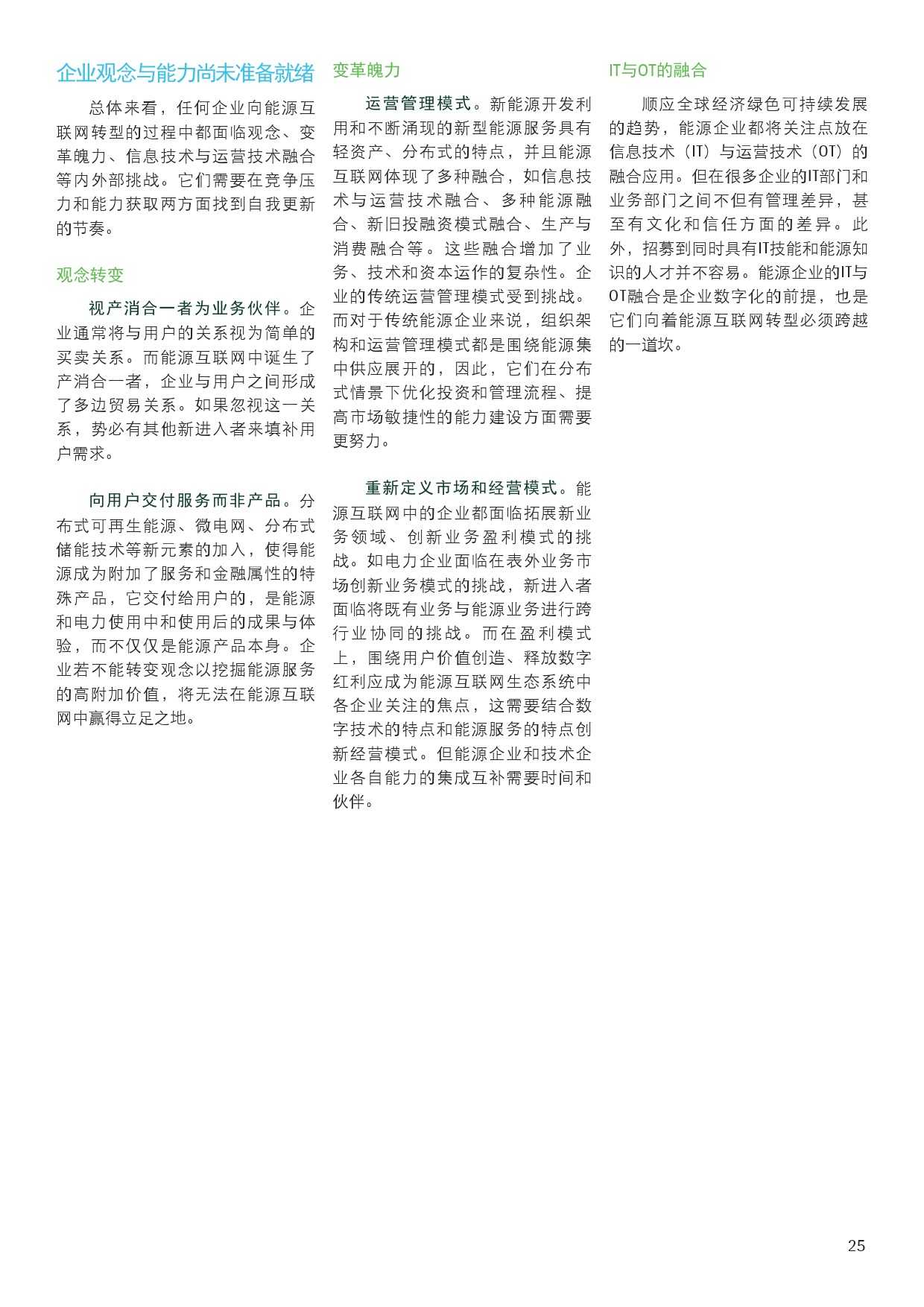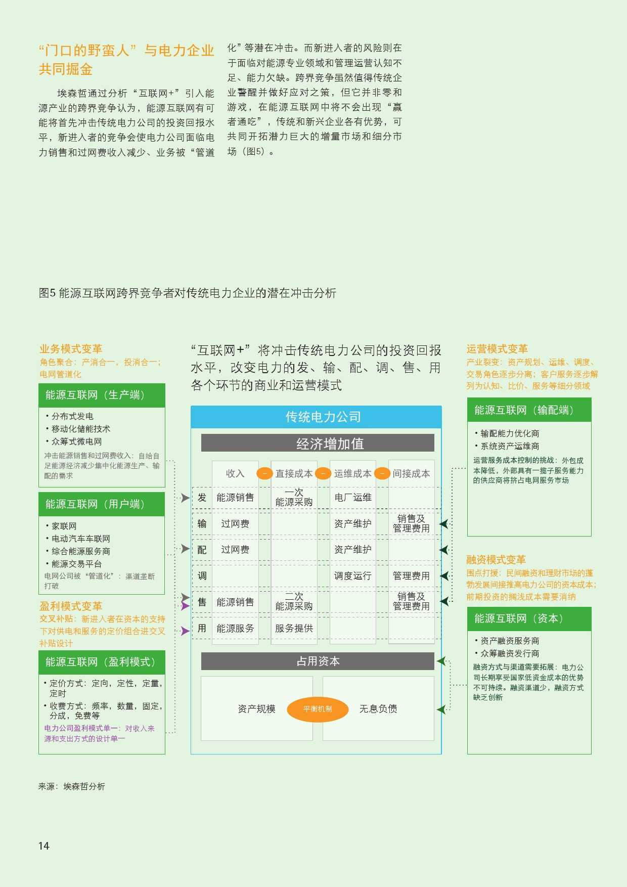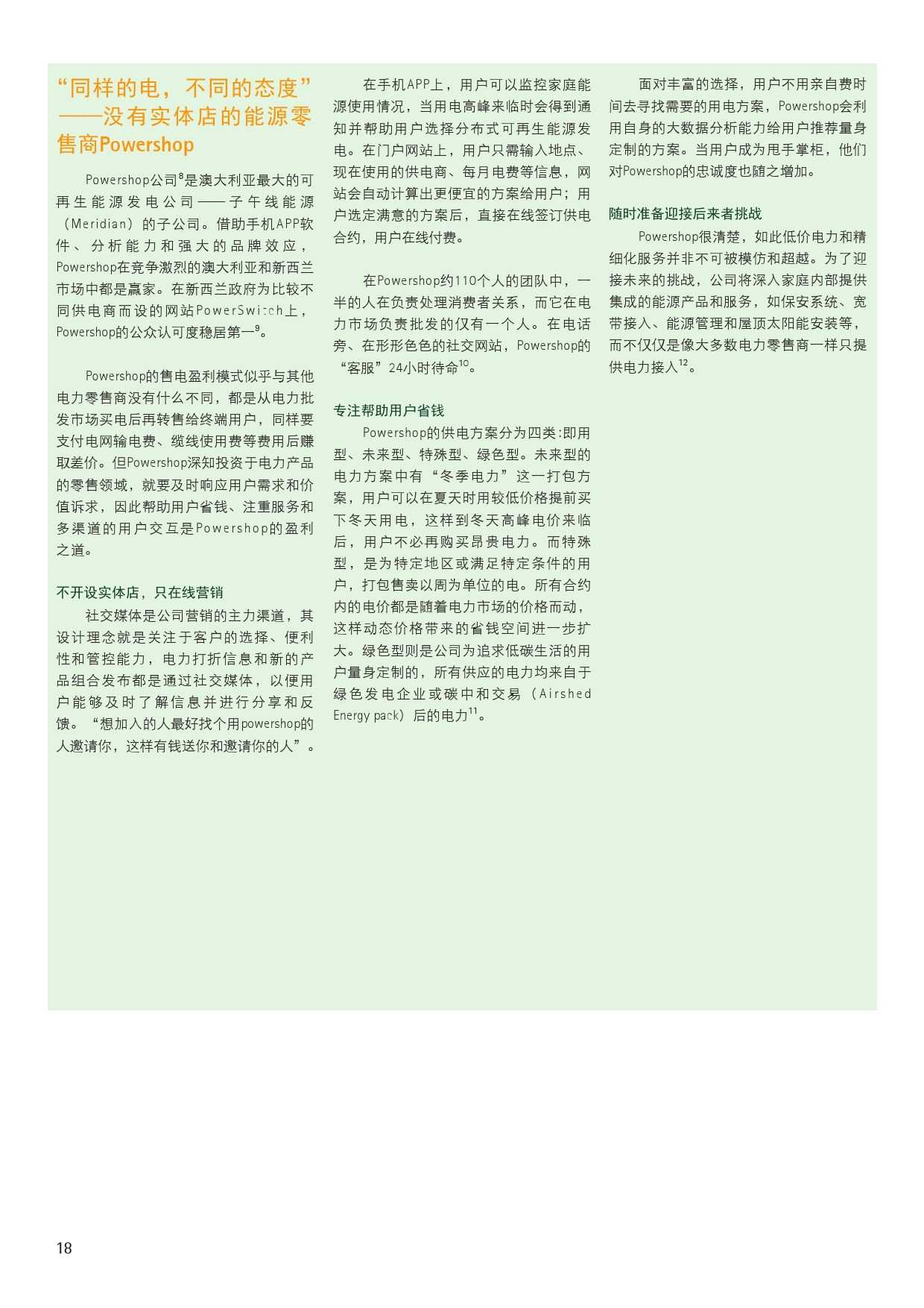 报告也对中国各类企业如何进行价值挖掘提出了建议。对传统的能源电力企业来说,需要挖掘已有资产潜能,转型成为集成式能源服务供应商。报告认为,全球领先能源企业在服务创新中的经验值得同行借鉴:不同领域的传统能源企业在新商业生态系统中可转换为不同角色,但都是依托既有客户、资产和业务优势,挖掘核心业务价值、拓展周边增值产业和业务价值。