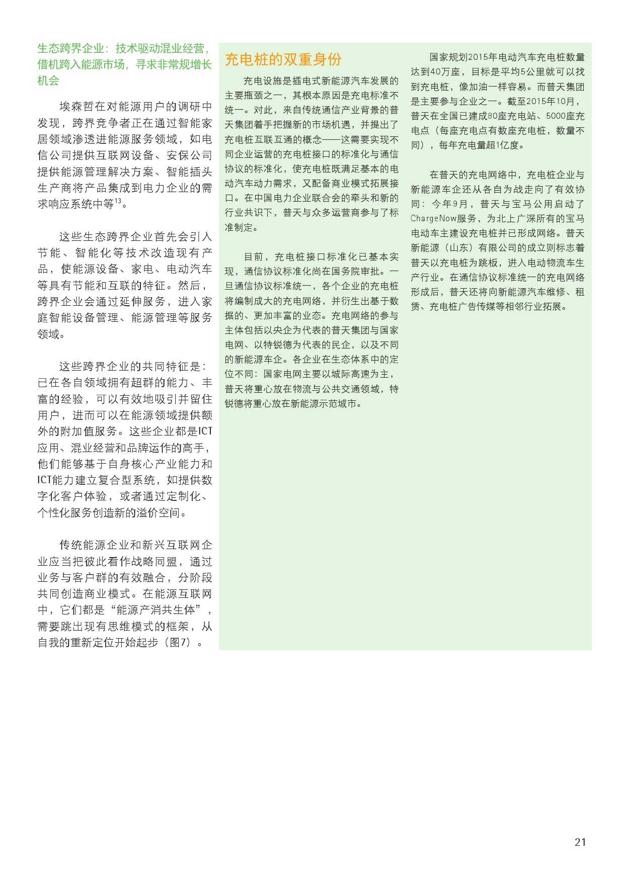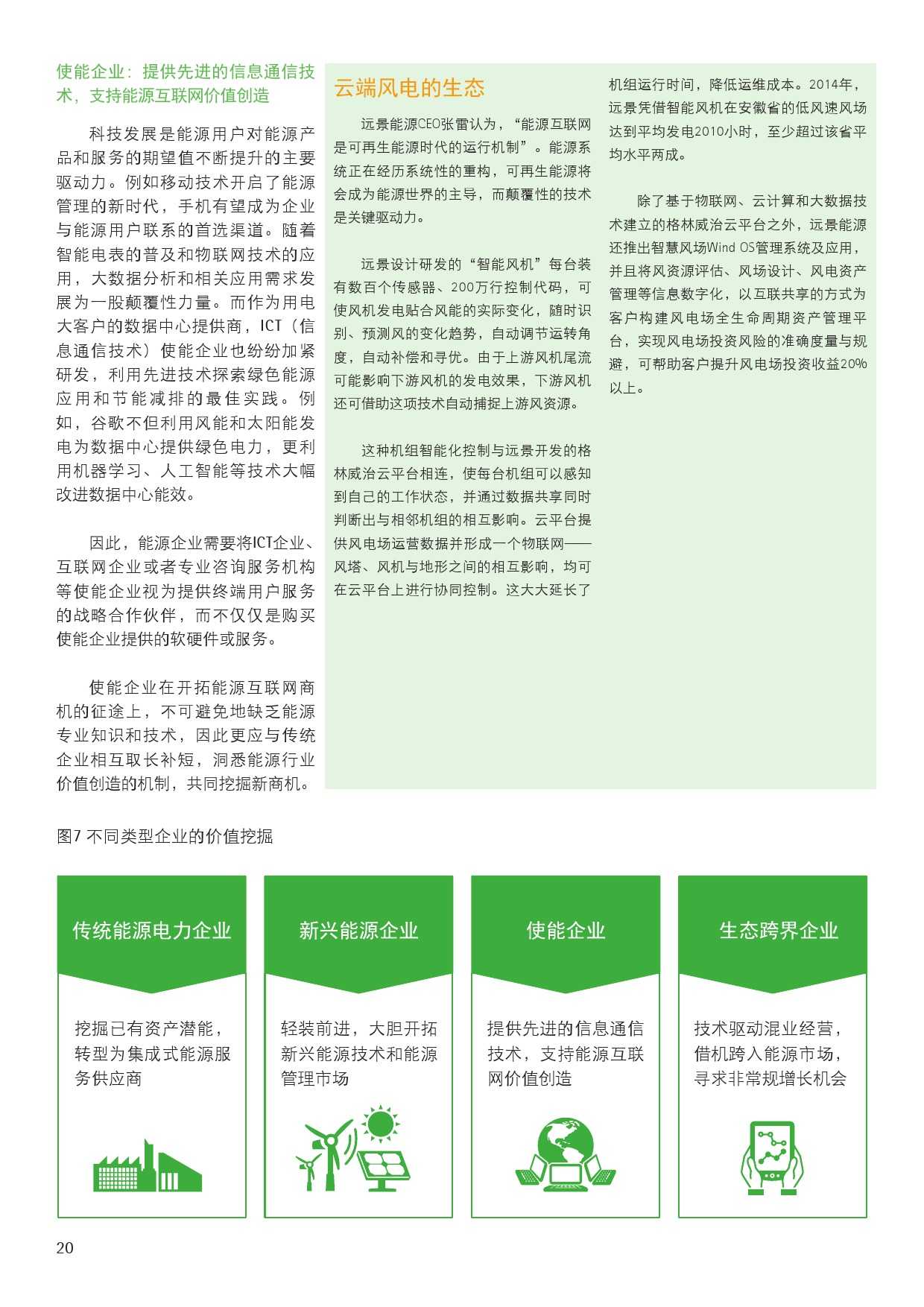 信息通信技术使能企业也将在能源互联网中创造价值,他们能够利用移动技术和大数据分析的相关技术来探索绿色能源应用。对这类企业来说,它们缺乏能源领域专业知识,因此应该与传统企业互相取长补短。而对能源企业来说,需要将ICT企业视为战略合作伙伴,而不仅仅是购买其提供的软硬件或服务。