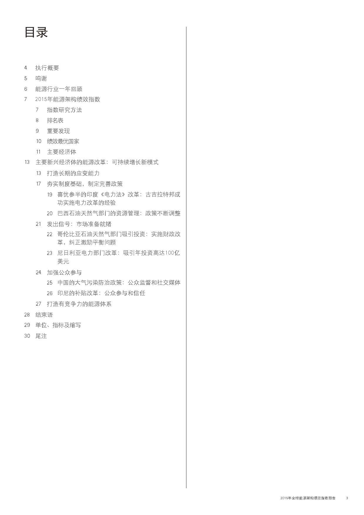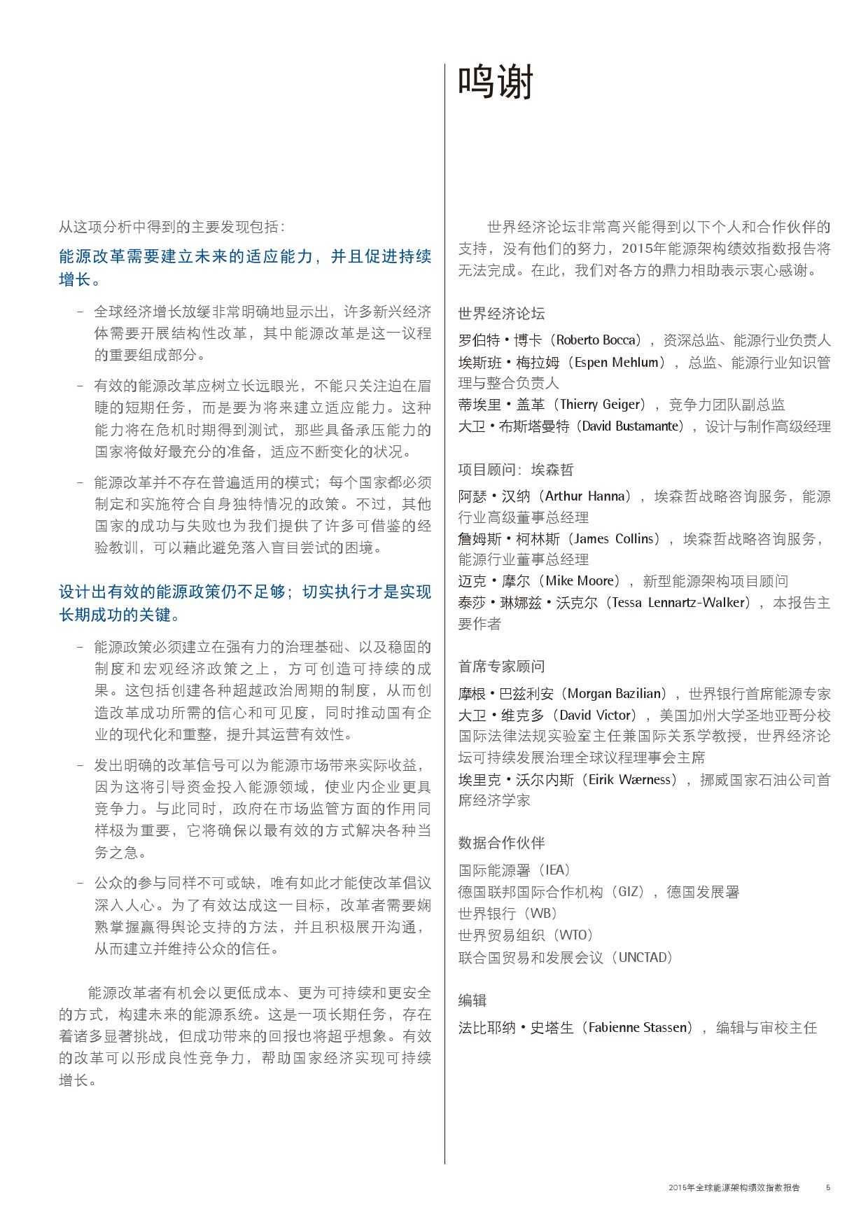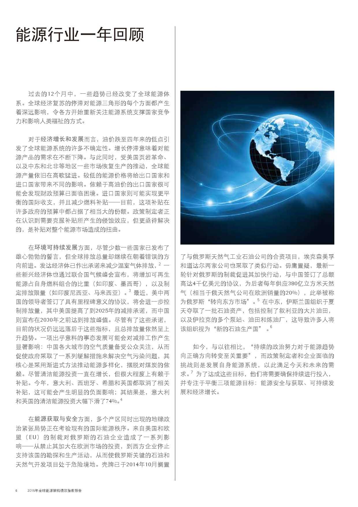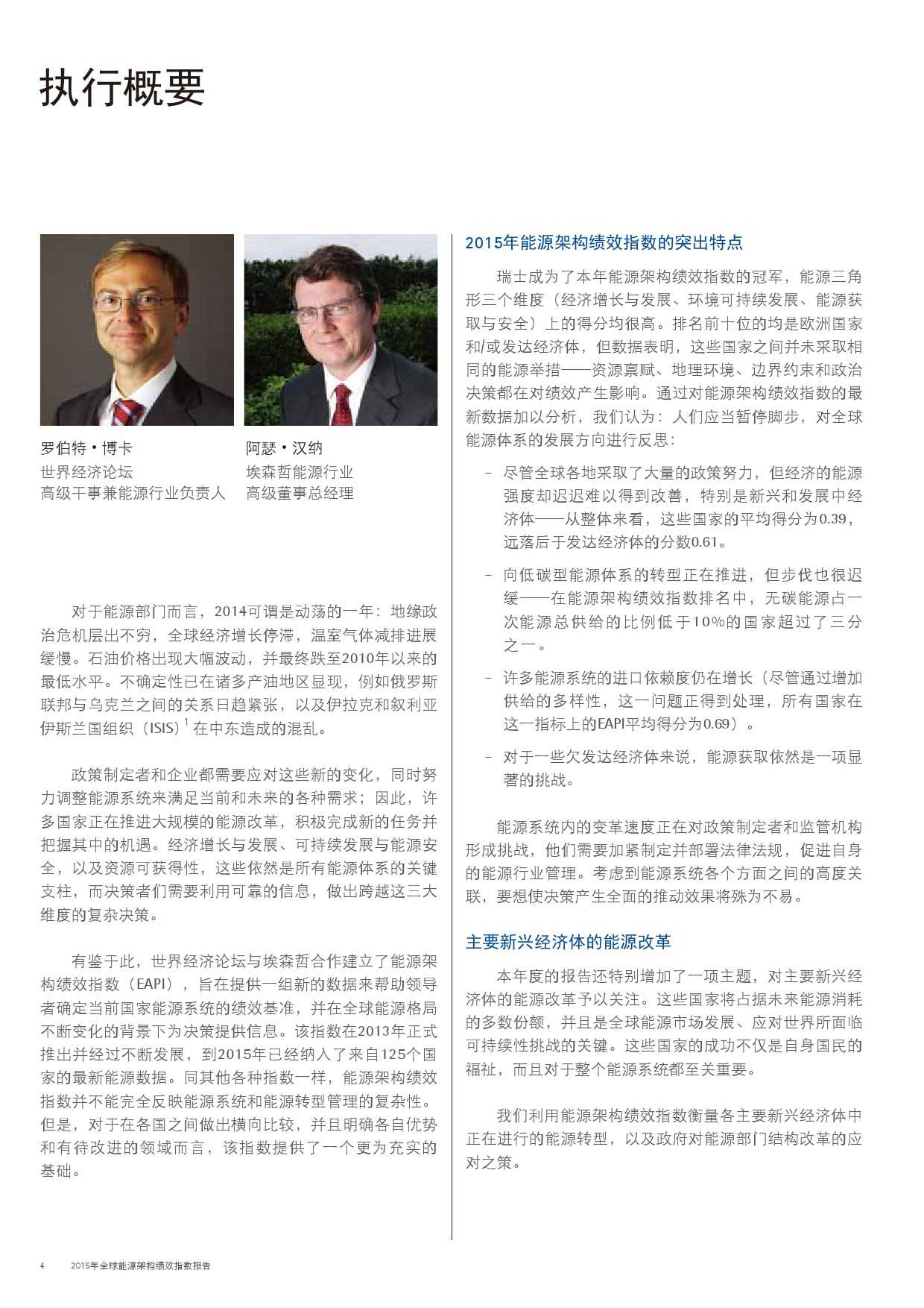 在此,世界经济论坛携手埃森哲非常高兴地向您呈献本报告的第三期2015年版。通过对能源架构绩效指数的最新数据加以分析,我们认为:人们应当暂停脚步,对全球能源体系的发展方向进行反思;能源系统内的变革速度正在对政策制定者和监管机构形成挑战,他们需要加紧制定并部署法律法规,促进自身的能源行业管理。