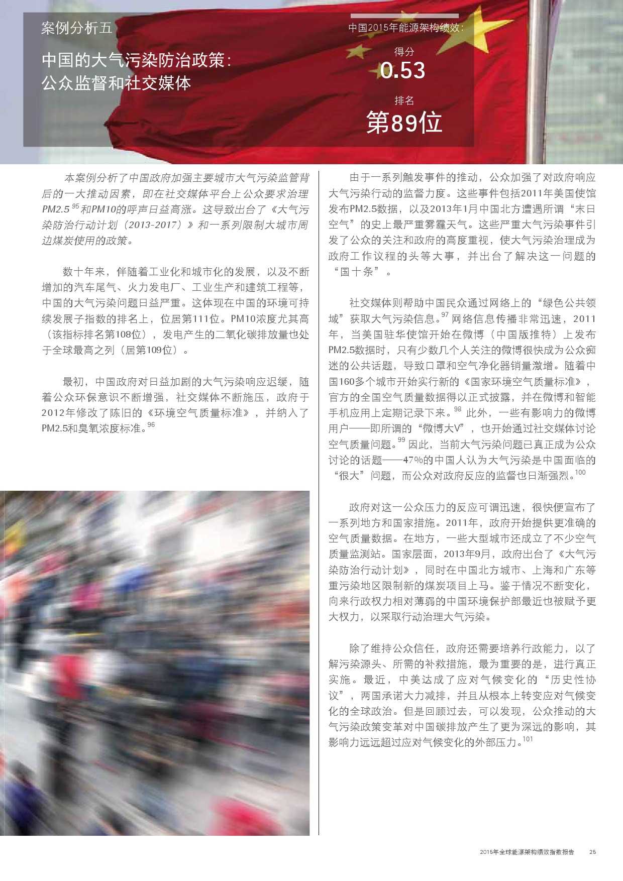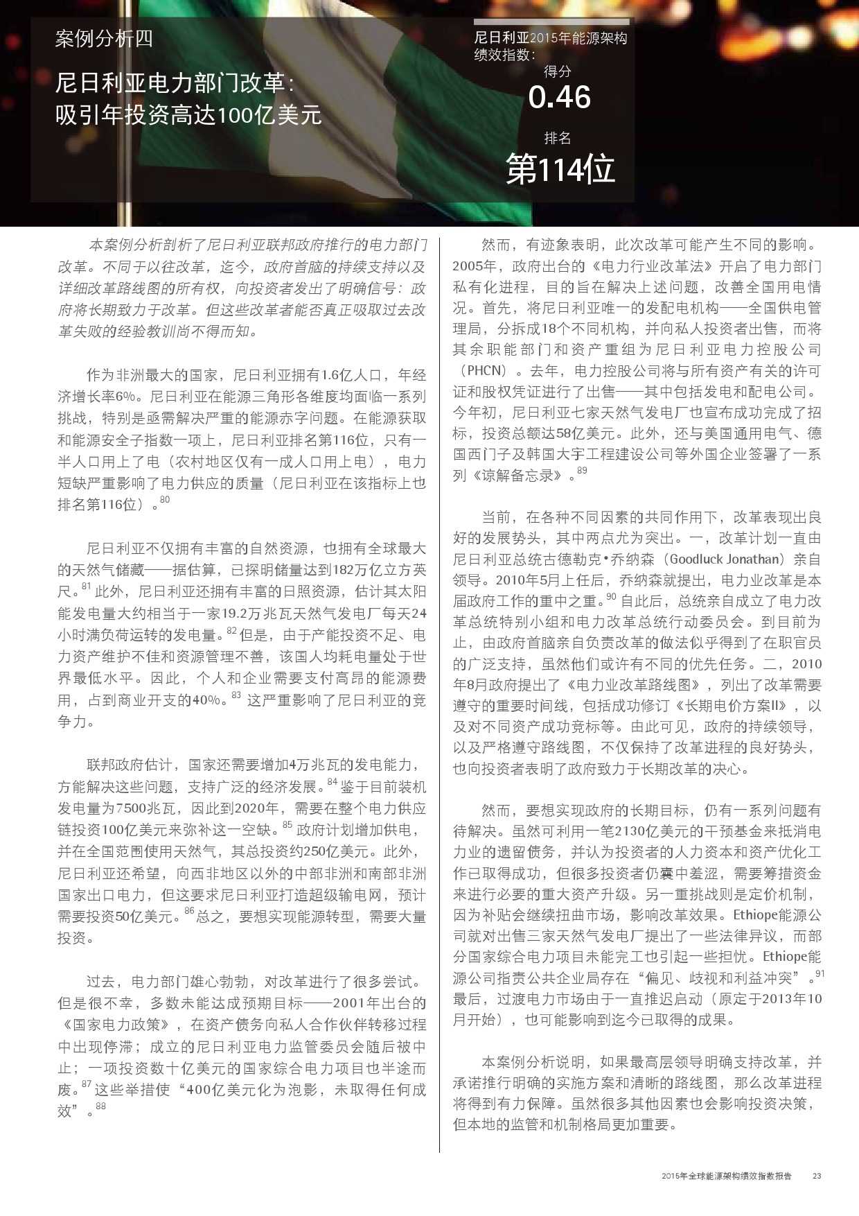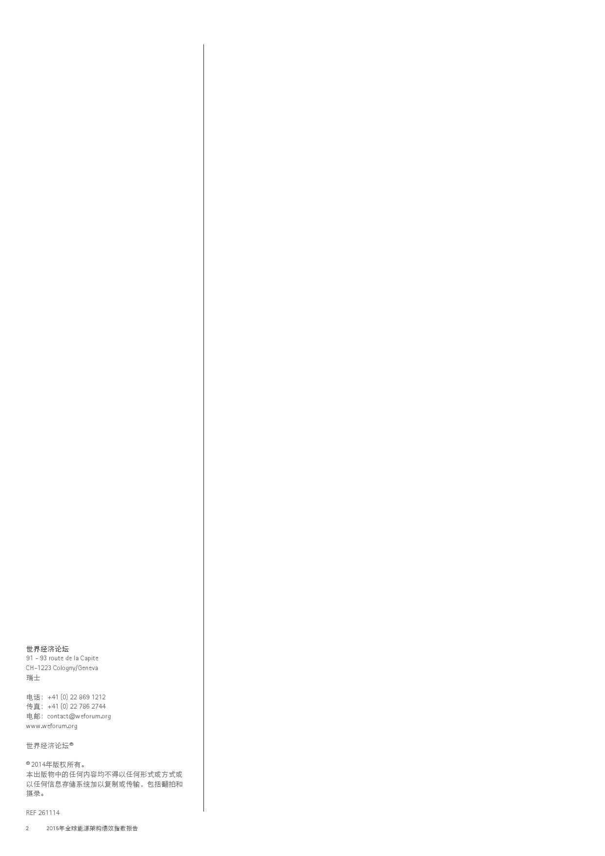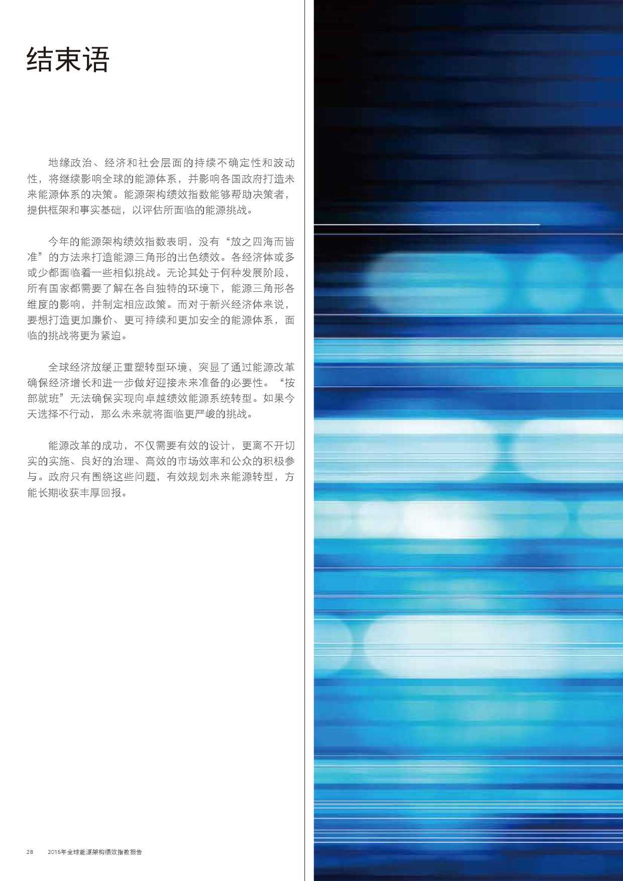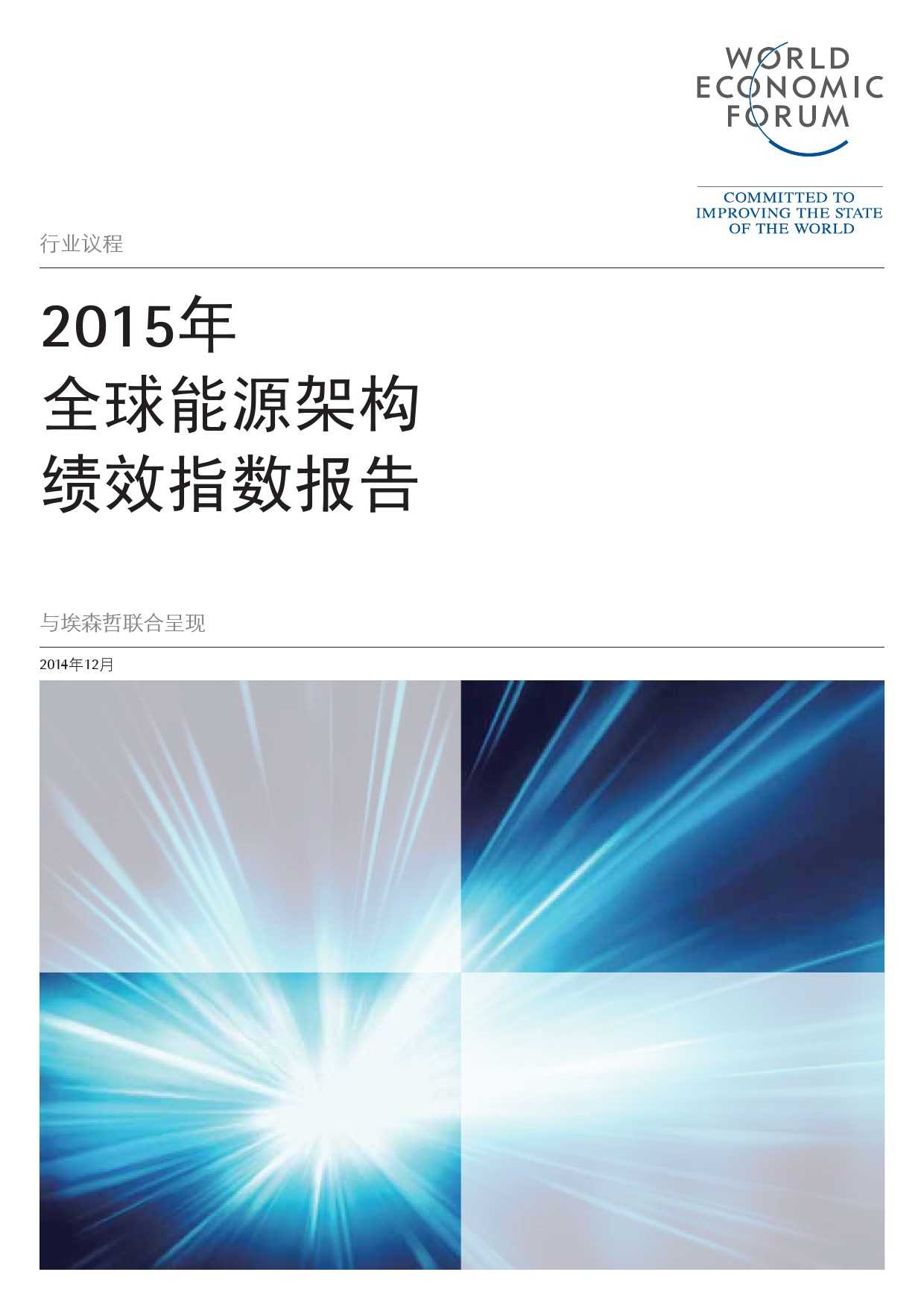 在此,世界经济论坛携手埃森哲非常高兴地向您呈献本报告的第三期2015年版。通过对能源架构绩效指数的最新数据加以分析,我们认为:人们应当暂停脚步,对全球能源体系的发展方向进行反思;能源系统内的变革速度正在对政策制定者和监管机构形成挑战,他们需要加紧制定并部署法律法规,促进自身的能源行业管理。