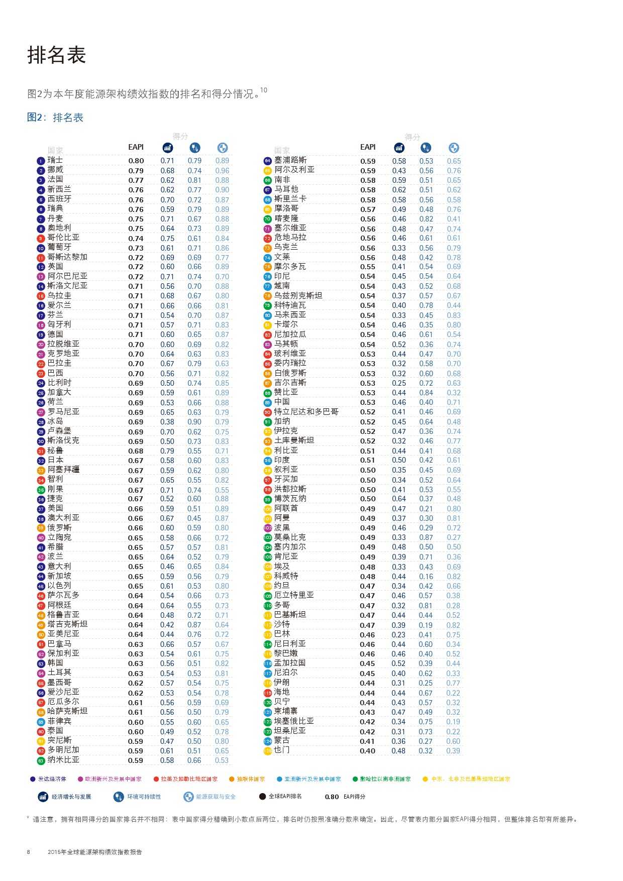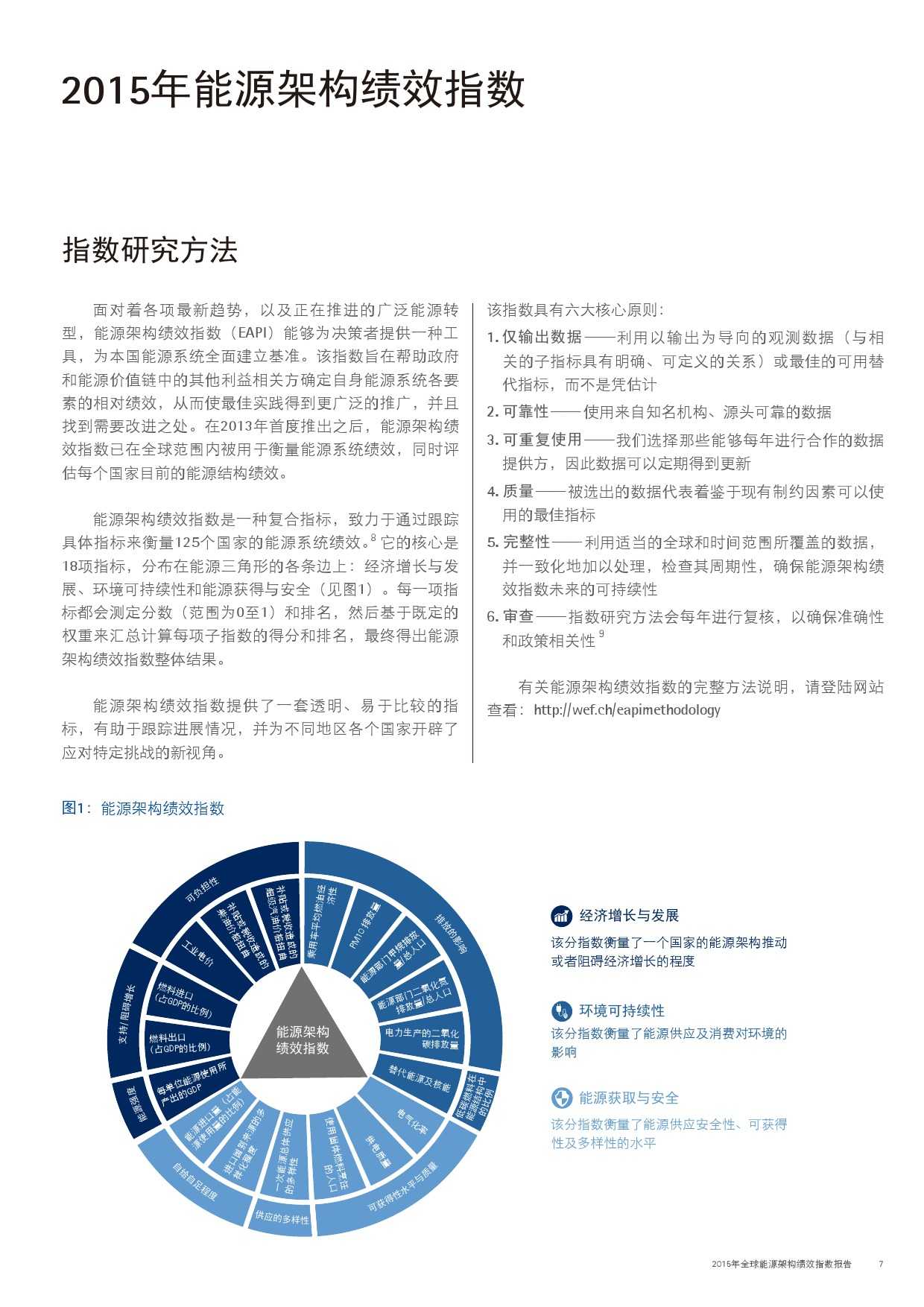能源架构绩效指数是一种复合指标,致力于通过跟踪具体指标来衡量125个国家的能源系统绩效。 它的核心是18项指标,分布在能源三角形的各条边上:经济增长与发展、环境可持续性和能源获得与安全。每一项指标都会测定分数(范围为0至1)和排名,然后基于既定的权重来汇总计算每项子指数的得分和排名,最终得出能源架构绩效指数整体结果。