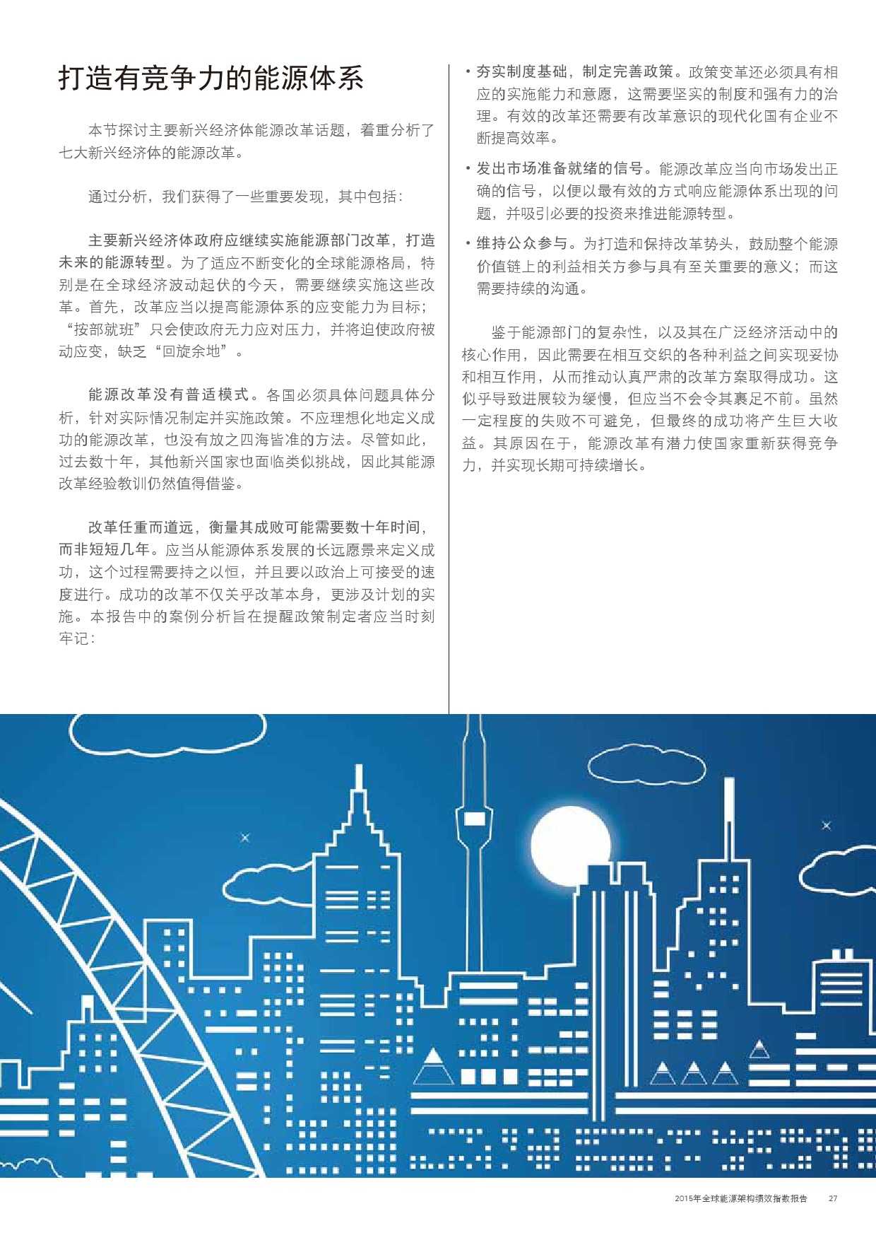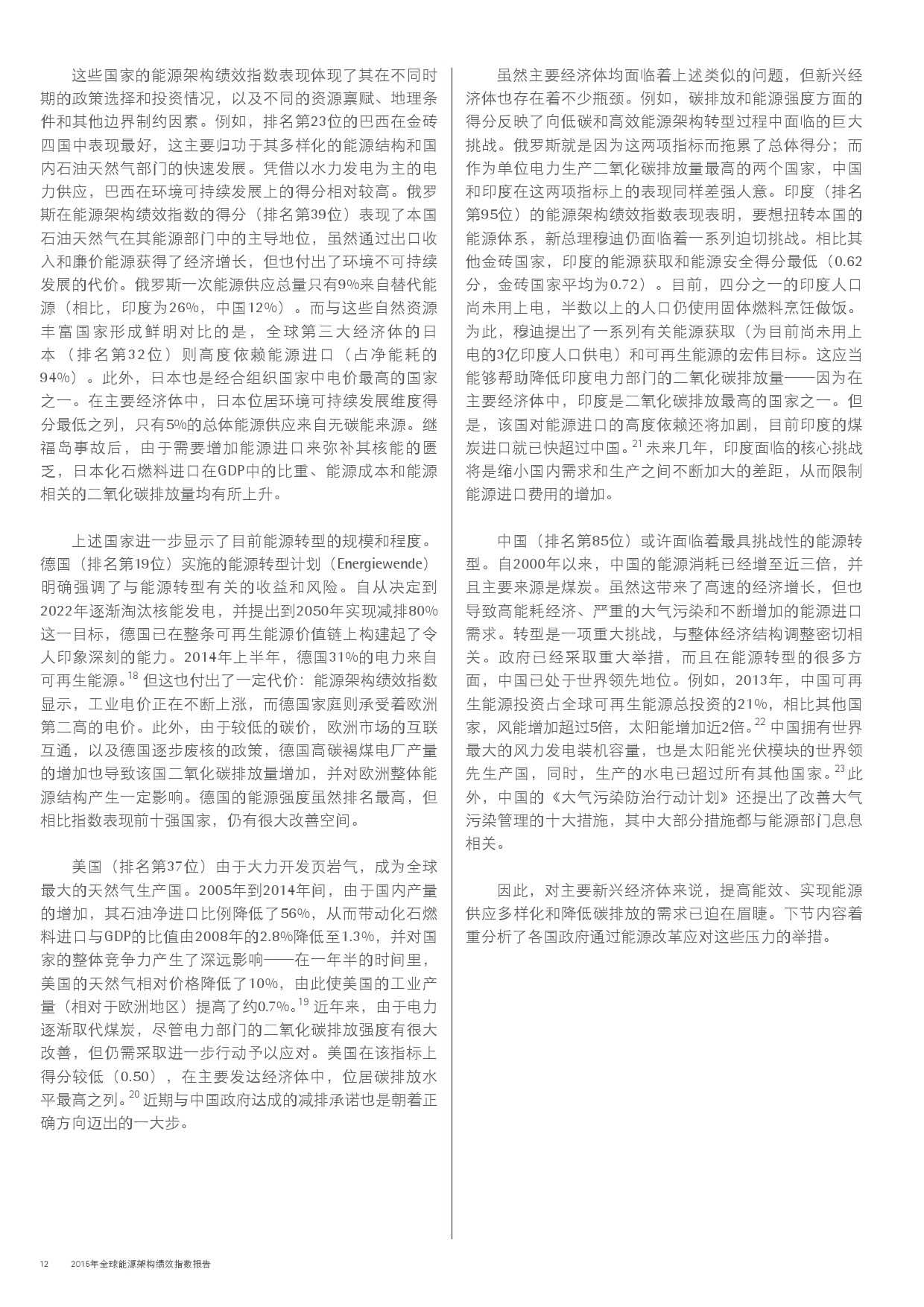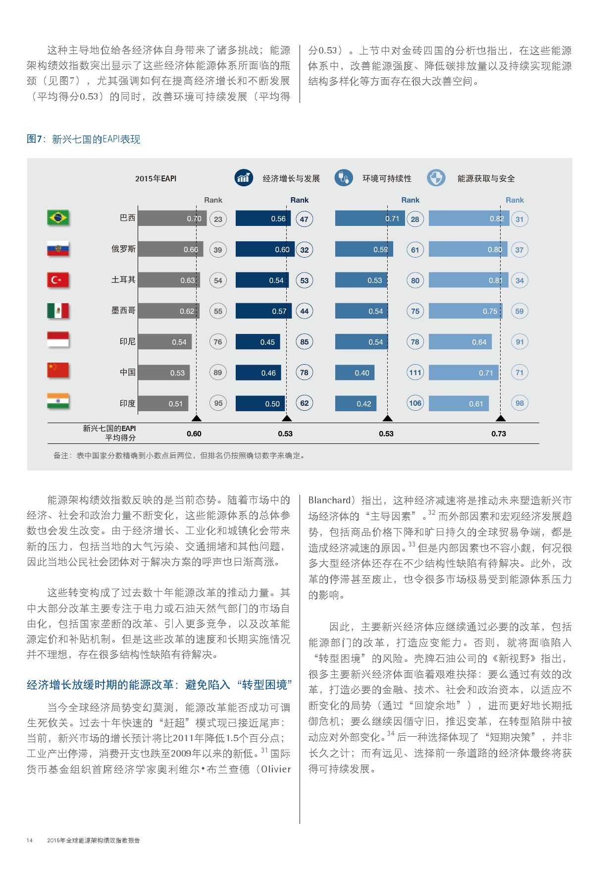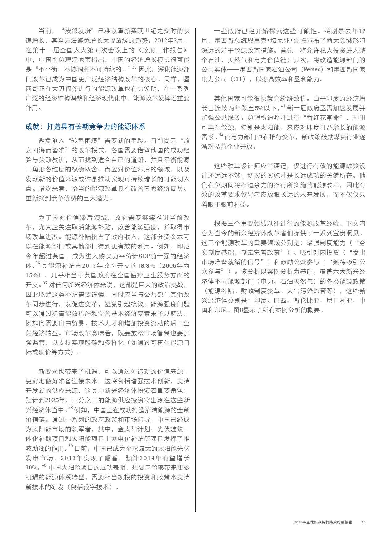 本年度的报告还特别增加了一项主题,对主要新兴经济体的能源改革予以关注。新兴经济体国家普遍面临向低碳和高效能源架构转型的瓶颈,研究发现,能源改革需要建立未来的适应能力,并且促进持续增长。设计出有效的能源政策仍不足够;切实执行才是实现长期成功的关键。有效的改革可以形成良性竞争力,帮助国家经济实现可持续增长。