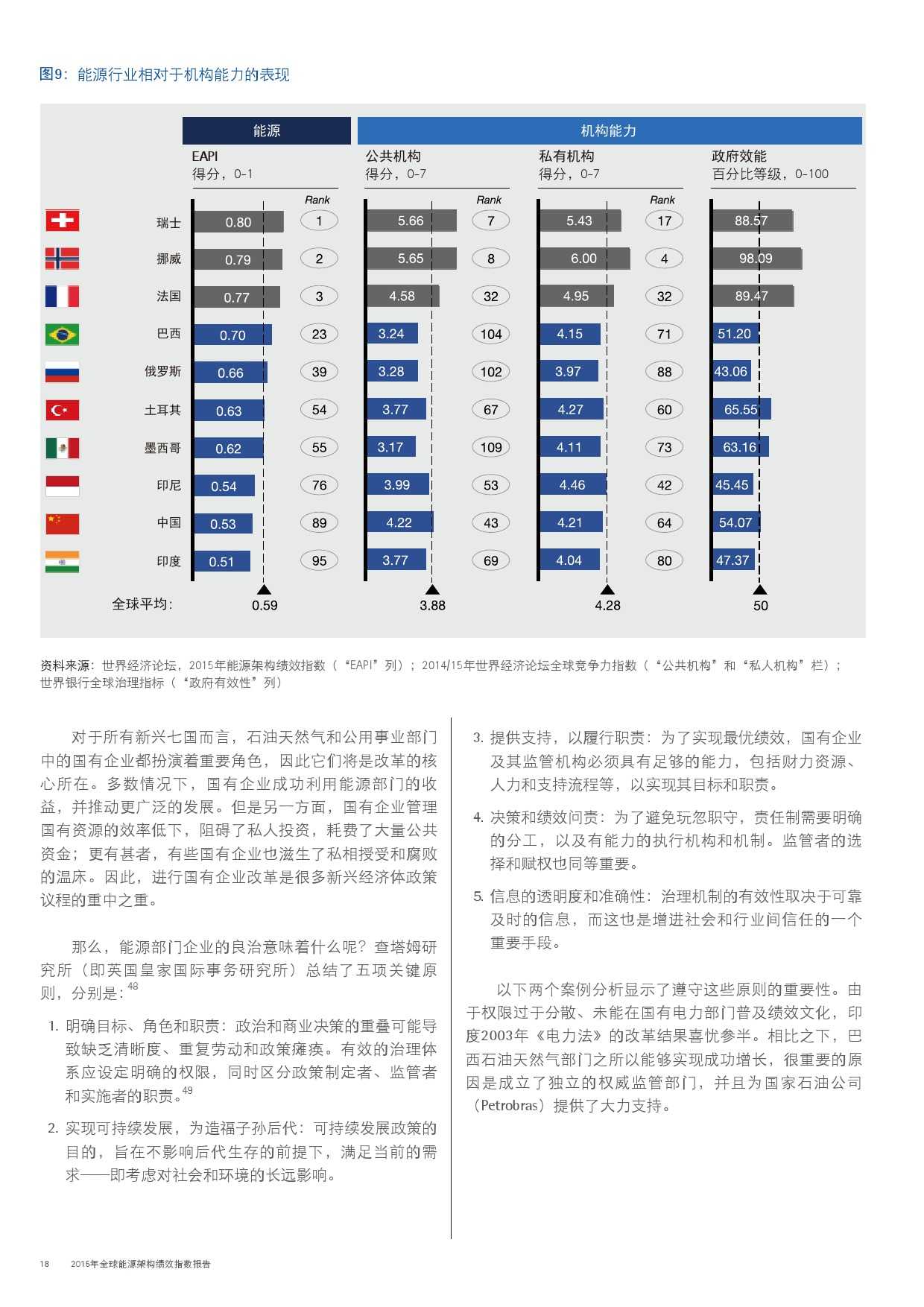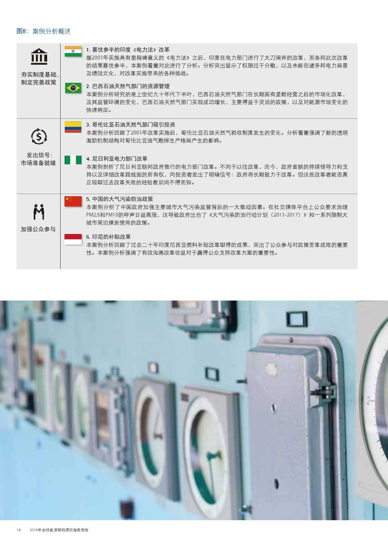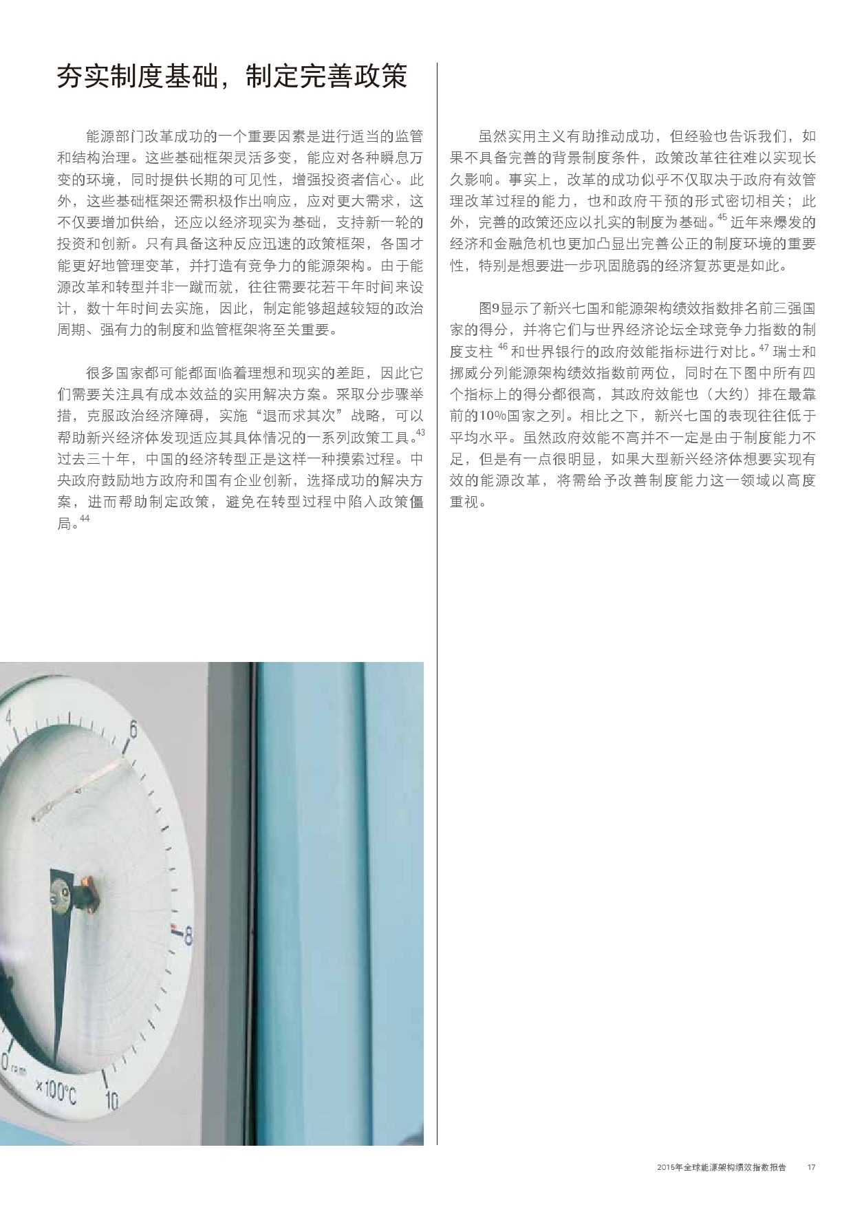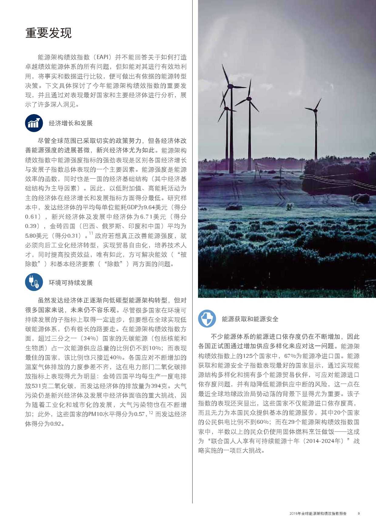 本年度的报告还特别增加了一项主题,对主要新兴经济体的能源改革予以关注。新兴经济体国家普遍面临向低碳和高效能源架构转型的瓶颈,研究发现,能源改革需要建立未来的适应能力,并且促进持续增长。设计出有效的能源政策仍不足够;切实执行才是实现长期成功的关键。有效的改革可以形成良性竞争力,帮助国家经济实现可持续增长。