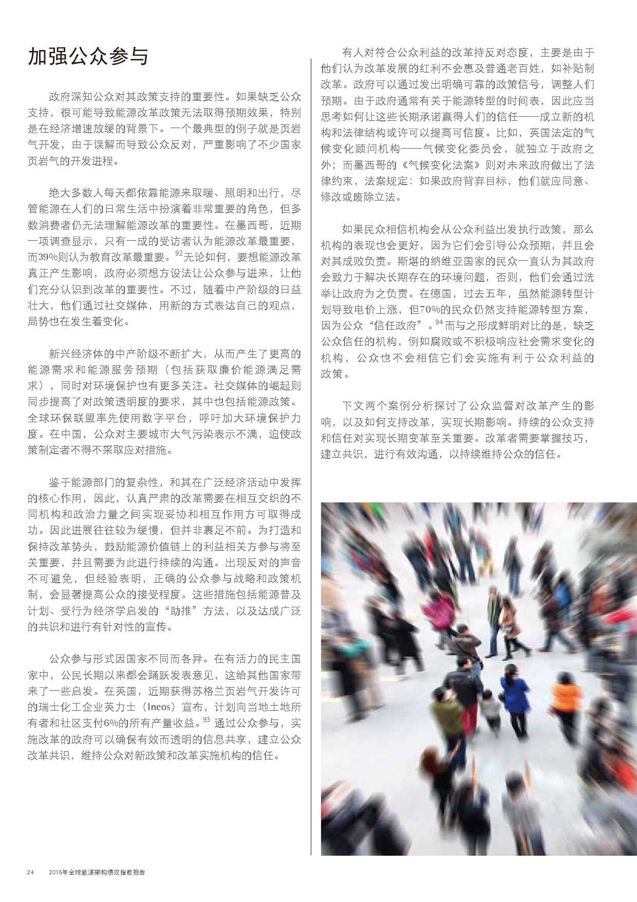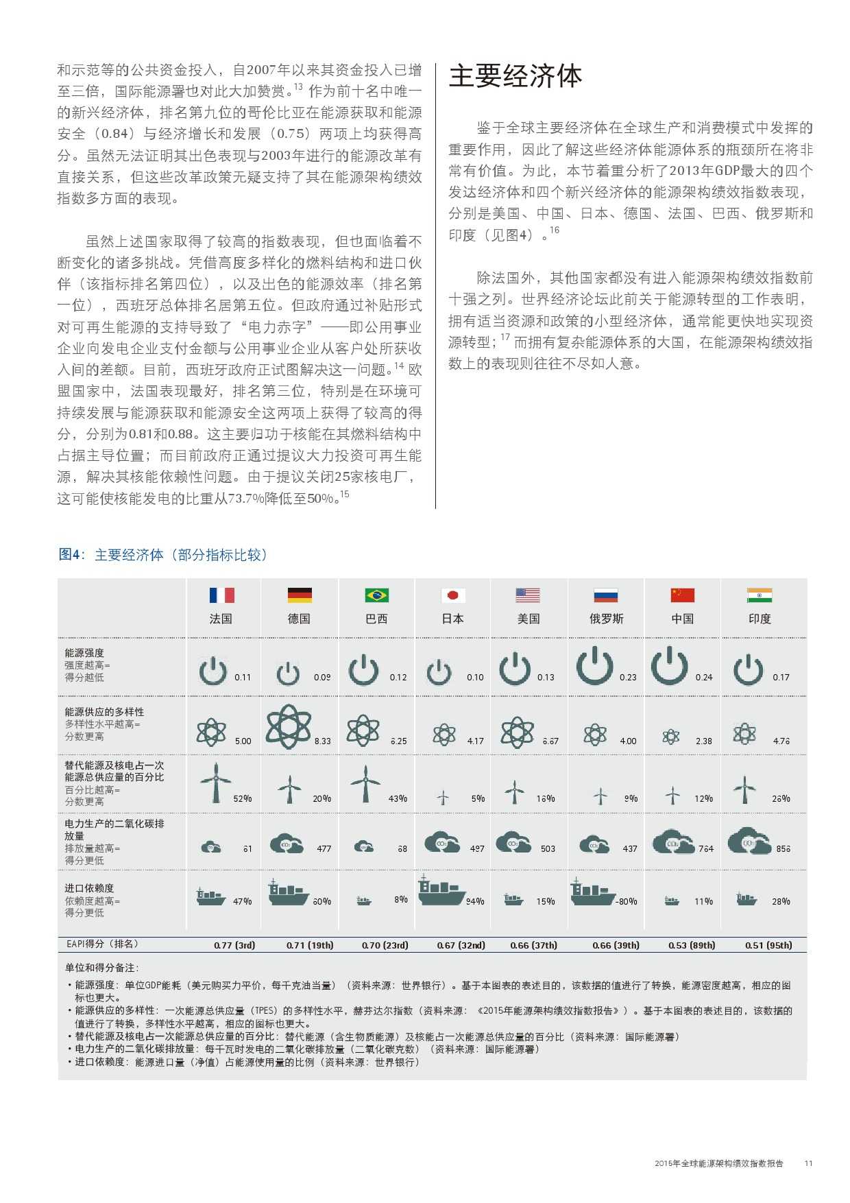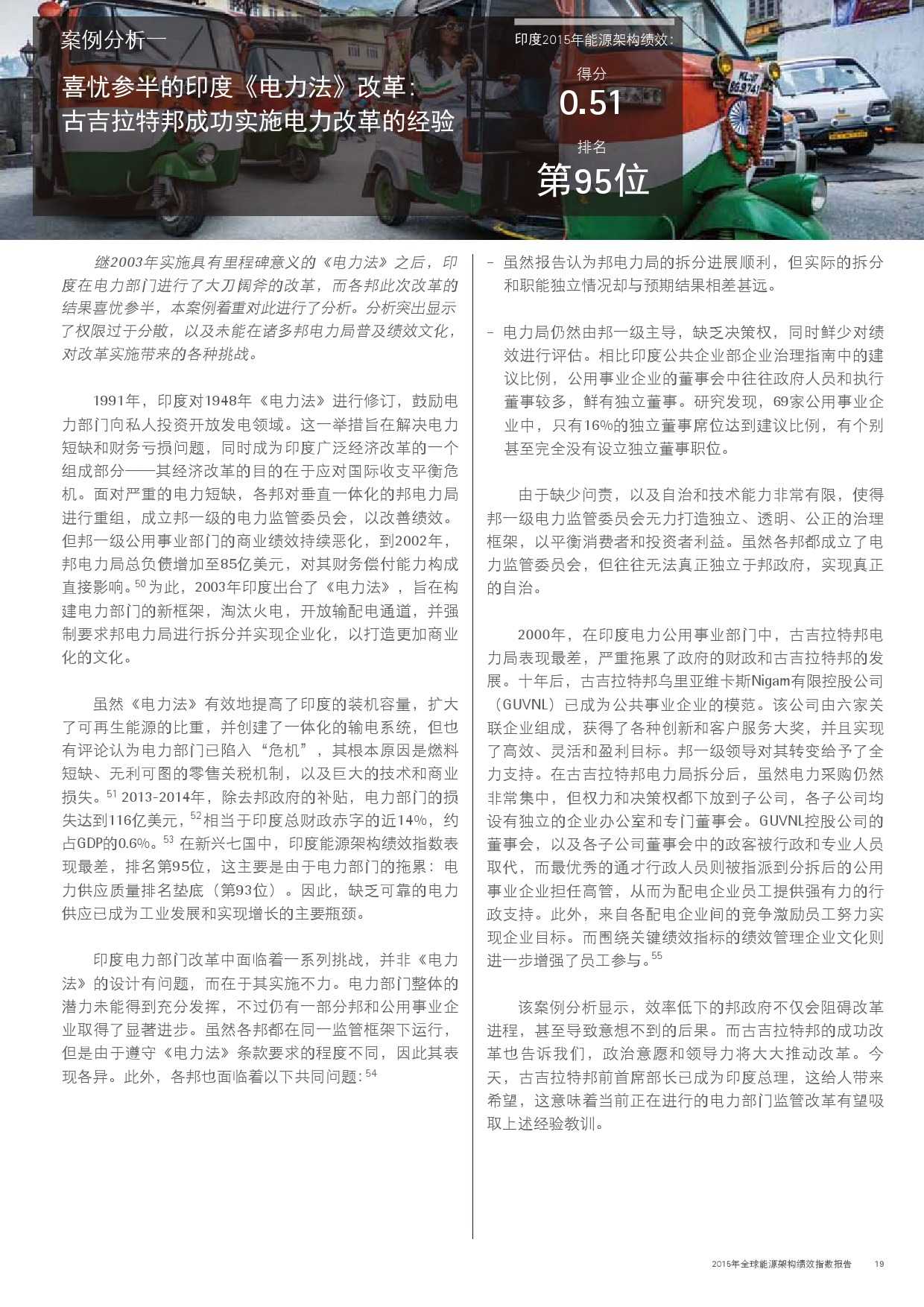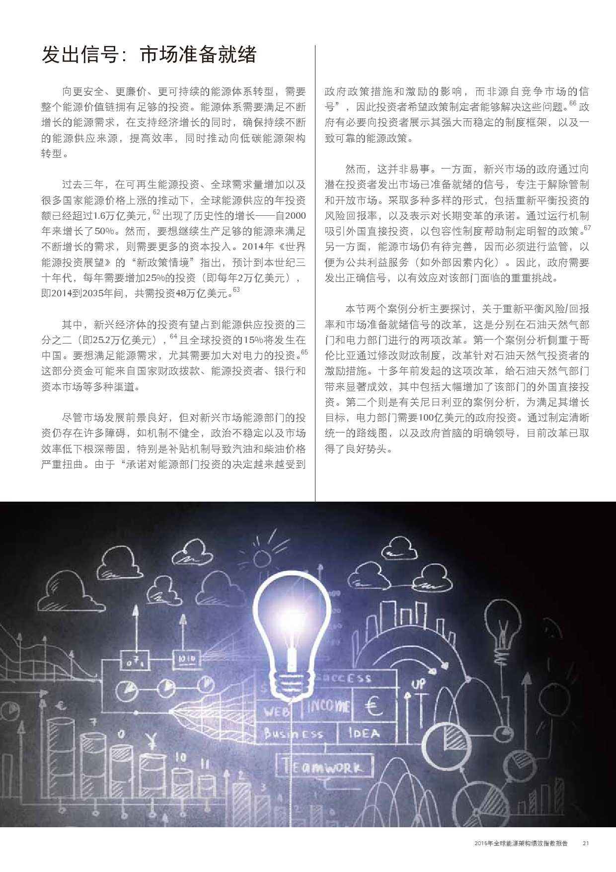 本年度的报告还特别增加了一项主题,对主要新兴经济体的能源改革予以关注。新兴经济体国家普遍面临向低碳和高效能源架构转型的瓶颈,研究发现,能源改革需要建立未来的适应能力,并且促进持续增长。设计出有效的能源政策仍不足够;切实执行才是实现长期成功的关键。有效的改革可以形成良性竞争力,帮助国家经济实现可持续增长。