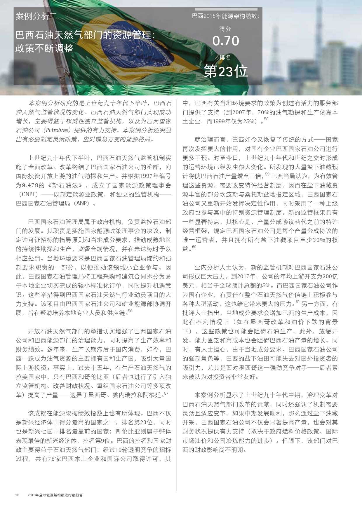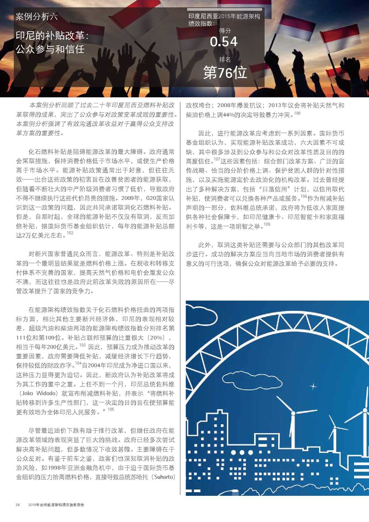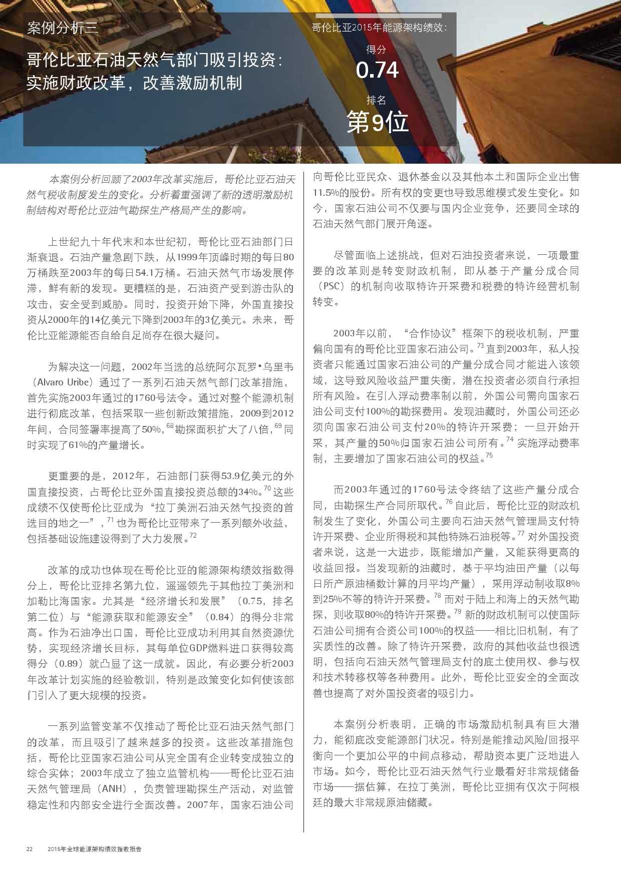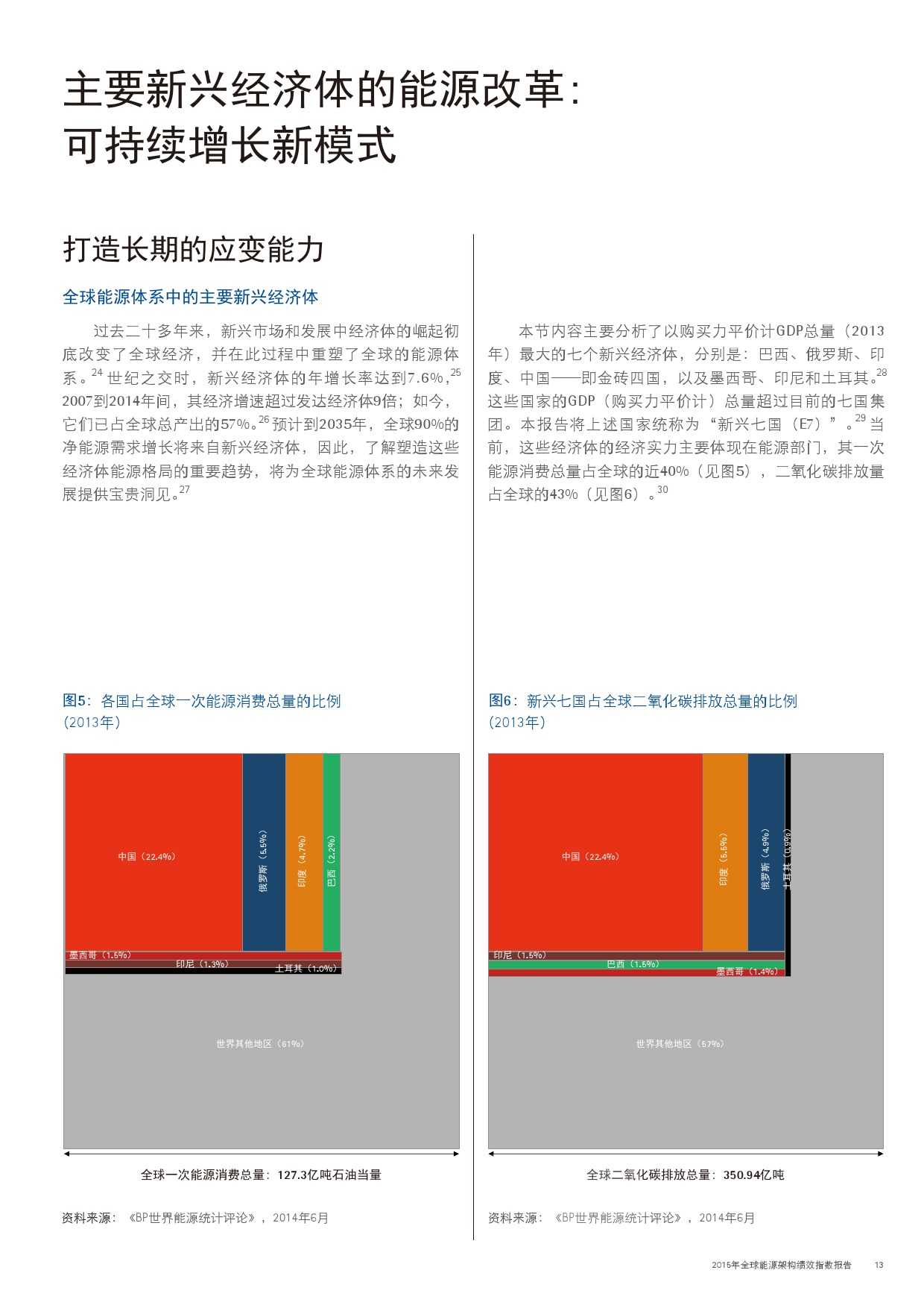 本年度的报告还特别增加了一项主题,对主要新兴经济体的能源改革予以关注。新兴经济体国家普遍面临向低碳和高效能源架构转型的瓶颈,研究发现,能源改革需要建立未来的适应能力,并且促进持续增长。设计出有效的能源政策仍不足够;切实执行才是实现长期成功的关键。有效的改革可以形成良性竞争力,帮助国家经济实现可持续增长。