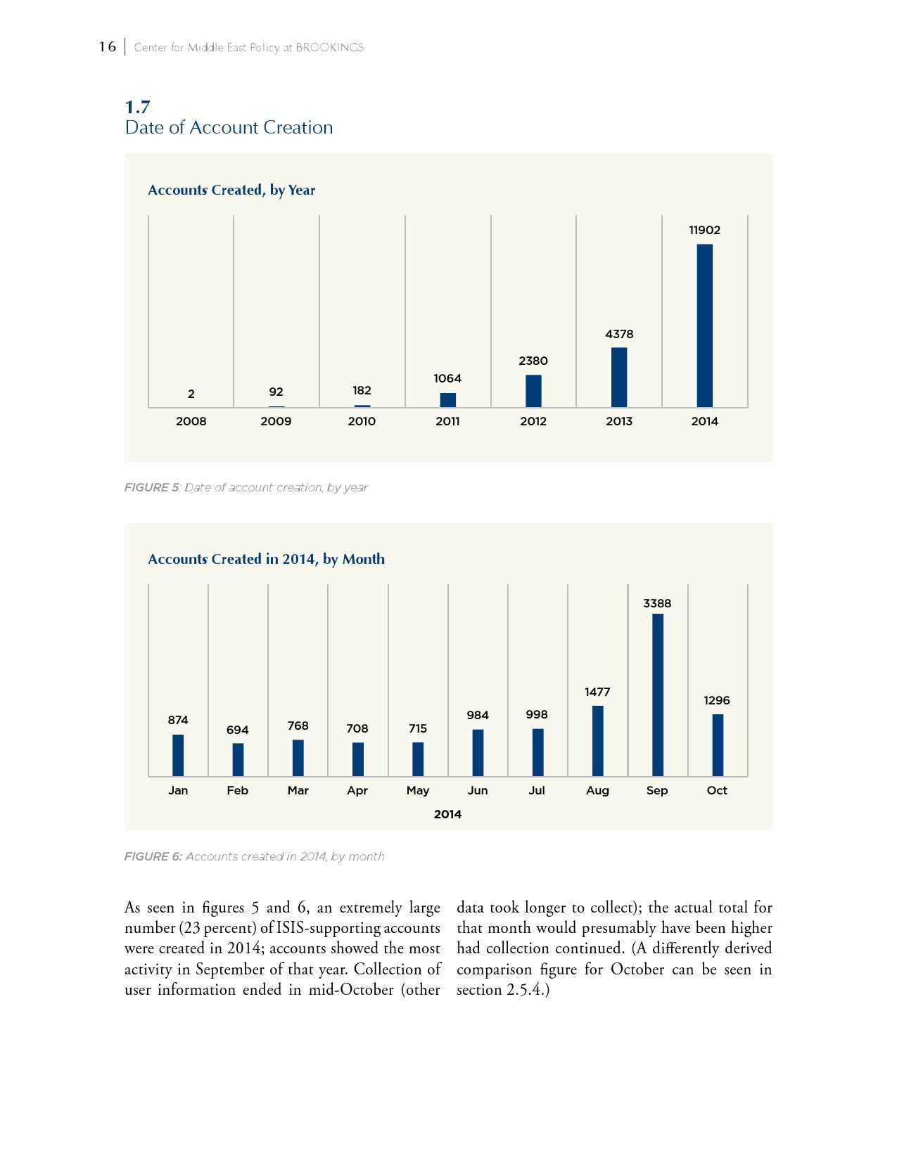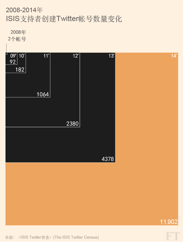 再来看Twitter上ISIS的支持者走势,自2008年ISIS的支持者首次创建帐号,至2014年底Twitter上已累计20,000个ISIS支持者的Twitter帐号,其中有近60%创建于2014年。
