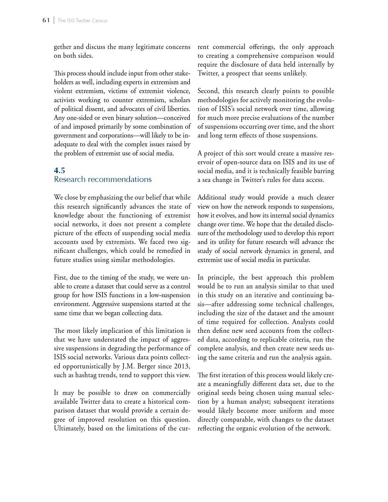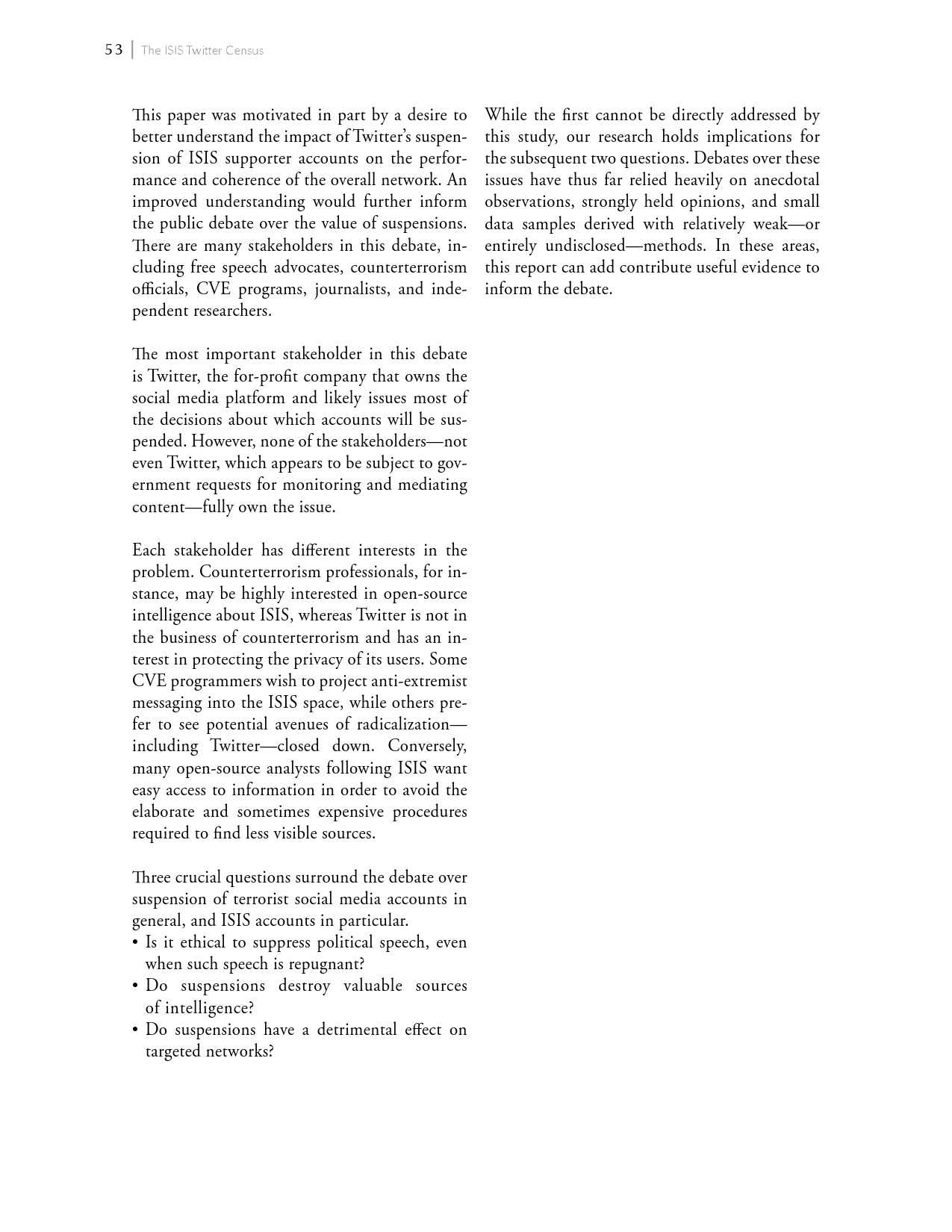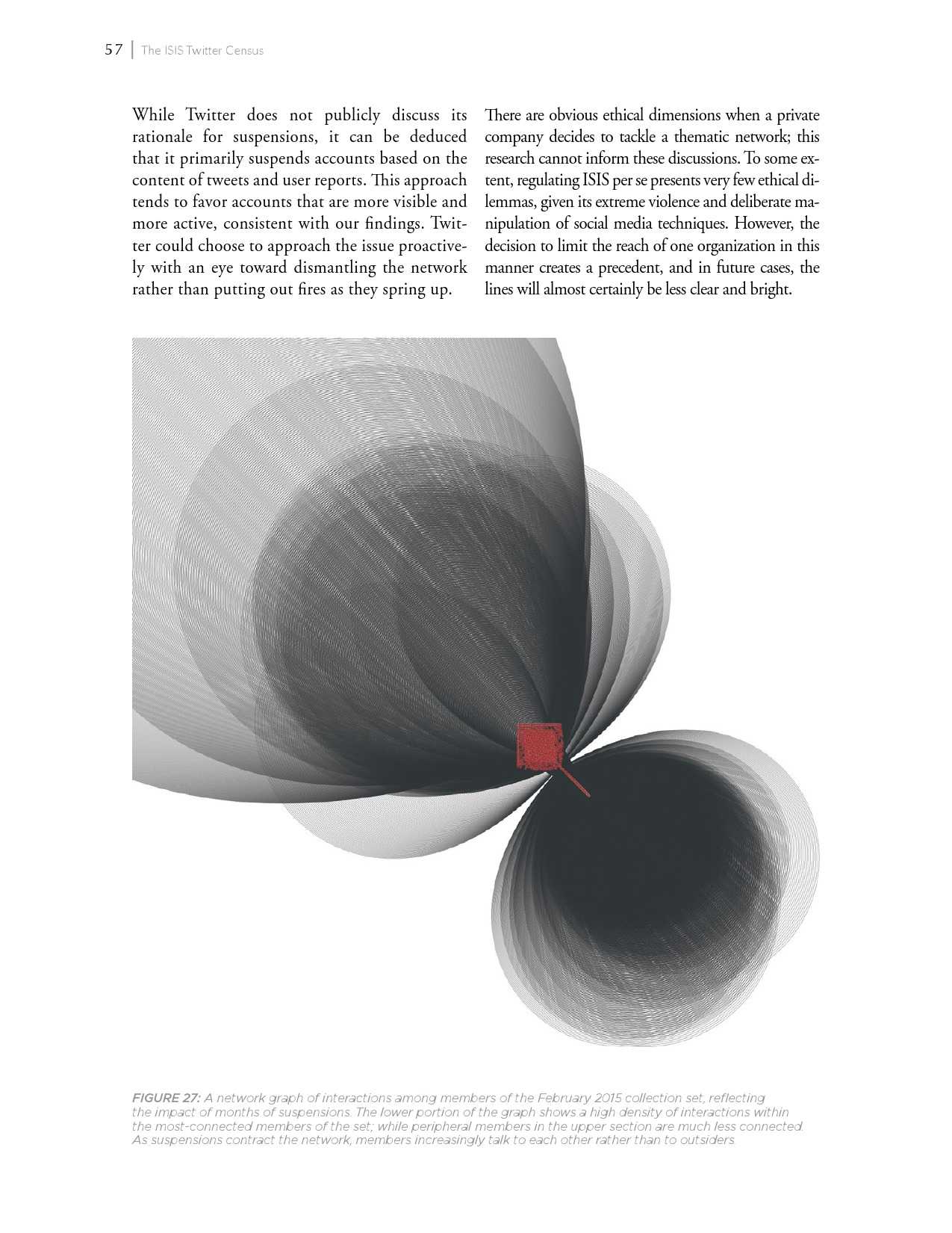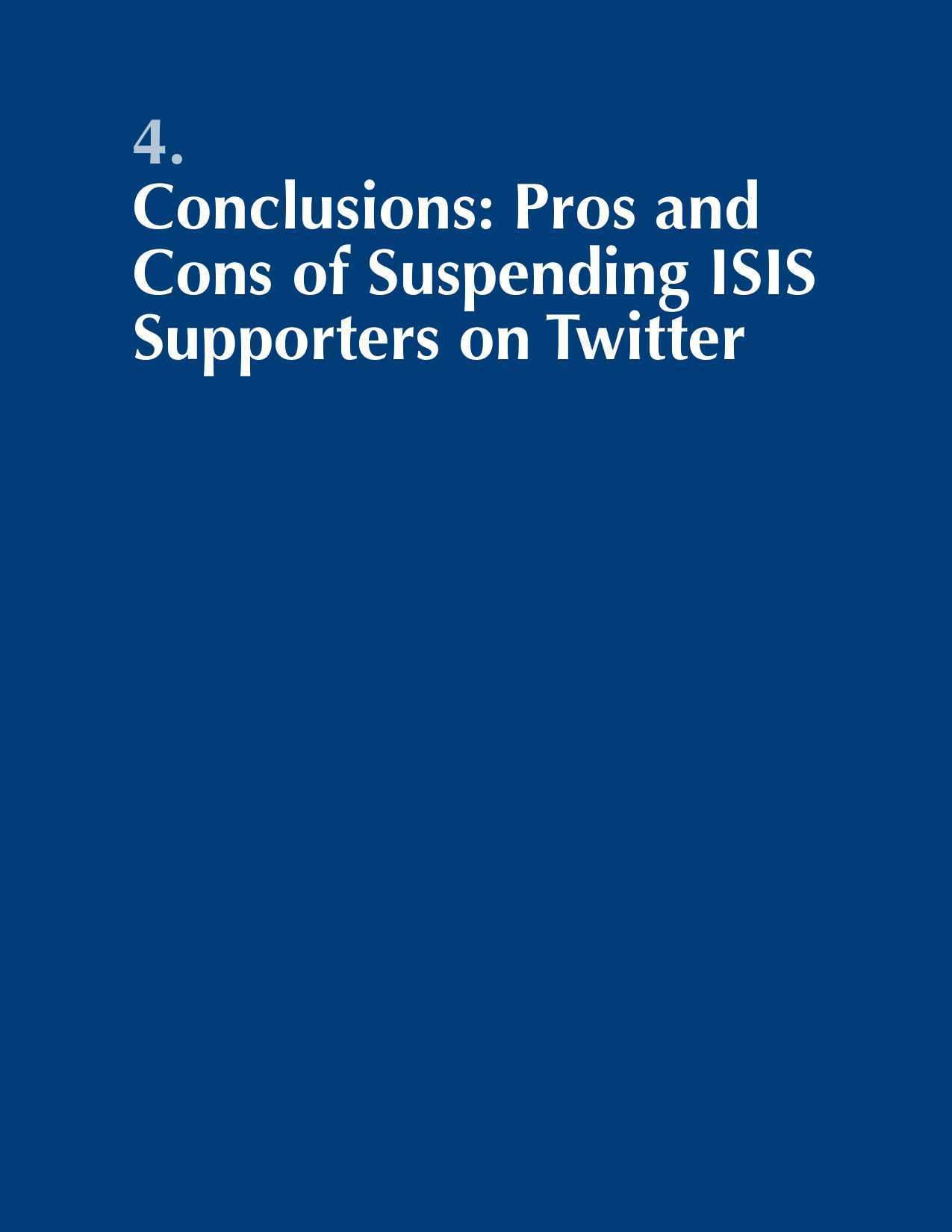 如果Twitter是ISIS发声的重要渠道,我们该不该限制目前已掌握的ISIS支持者帐号?该份研究认为,关停Twitter帐号能在一定程度上限制ISIS在互联网上的影响,在2014年9月的第一轮帐号清理过程中,ISIS支持者创建新帐号的数量锐减,但把时间拉长,支持者会通过大量新建帐号进行反扑。再来,一旦关停ISIS支持者帐号,研究人员就很难通过Twitter上ISIS支持者提供的信息进行情报分析。贝格尔和摩根的研究团队目前已经可以通过比对GPS数据和其他类型的地理信息,来甄别用户是否提供虚假信息。研究团队还指出,关停帐号也容易使ISIS支持者的社交内化──加强对ISIS相关帐号关注,减少与其他群体互动。当支持者越黏住ISIS圈子,ISIS更能操控信息传播,让支持者收到经筛选、过于极端的信息。