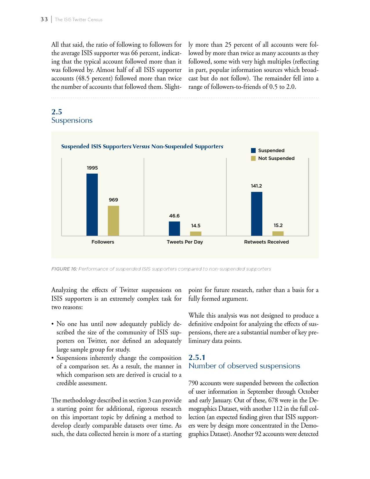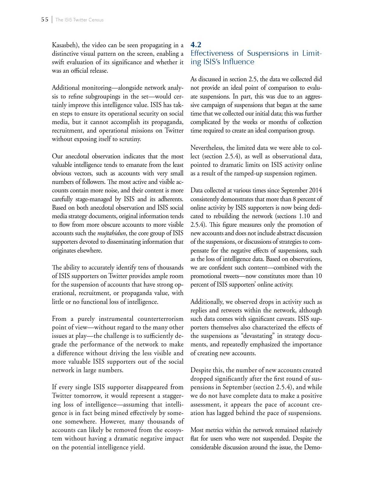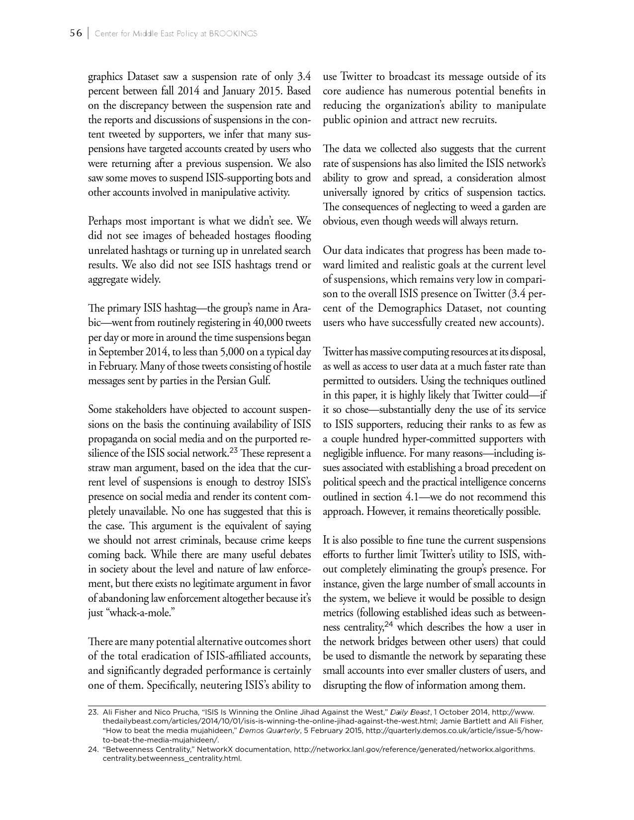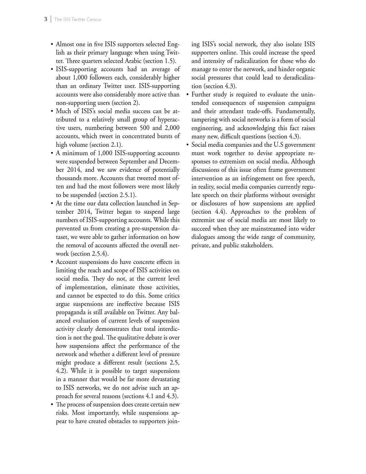 如果Twitter是ISIS发声的重要渠道,我们该不该限制目前已掌握的ISIS支持者帐号?该份研究认为,关停Twitter帐号能在一定程度上限制ISIS在互联网上的影响,在2014年9月的第一轮帐号清理过程中,ISIS支持者创建新帐号的数量锐减,但把时间拉长,支持者会通过大量新建帐号进行反扑。再来,一旦关停ISIS支持者帐号,研究人员就很难通过Twitter上ISIS支持者提供的信息进行情报分析。贝格尔和摩根的研究团队目前已经可以通过比对GPS数据和其他类型的地理信息,来甄别用户是否提供虚假信息。研究团队还指出,关停帐号也容易使ISIS支持者的社交内化──加强对ISIS相关帐号关注,减少与其他群体互动。当支持者越黏住ISIS圈子,ISIS更能操控信息传播,让支持者收到经筛选、过于极端的信息。