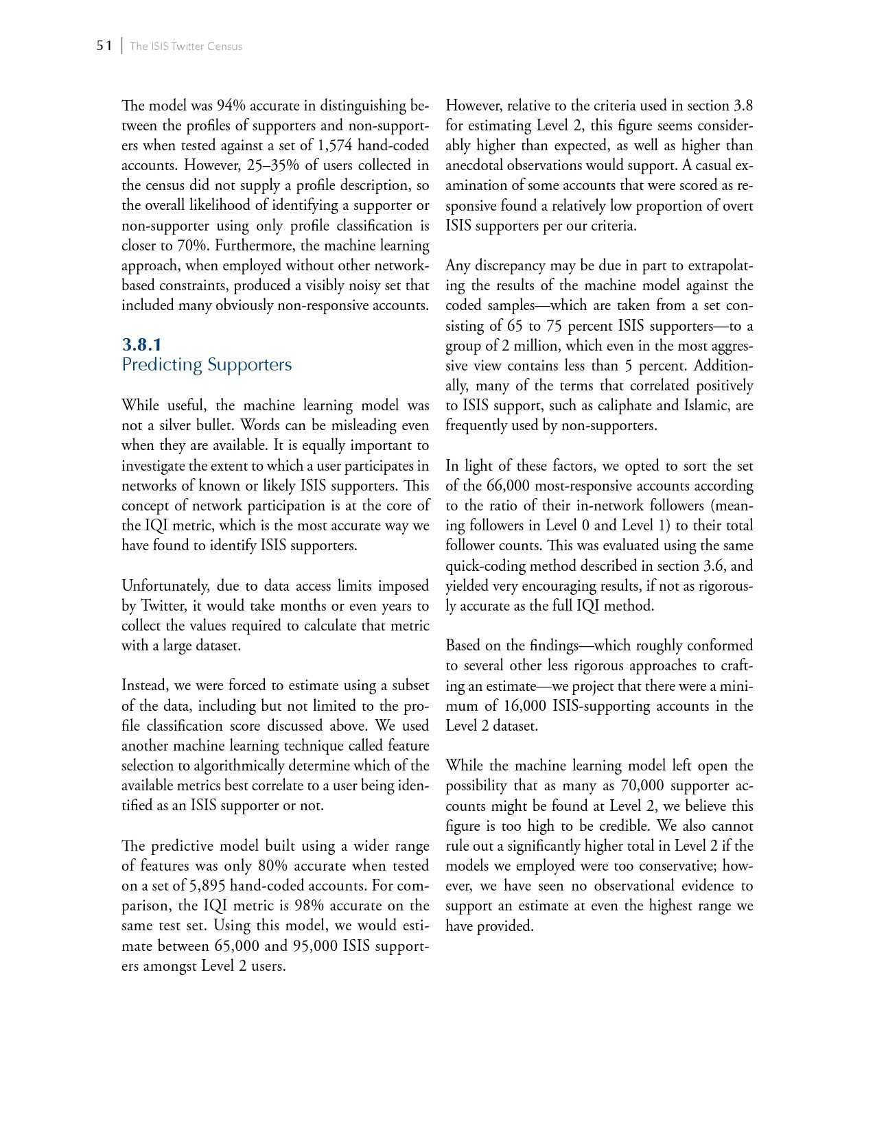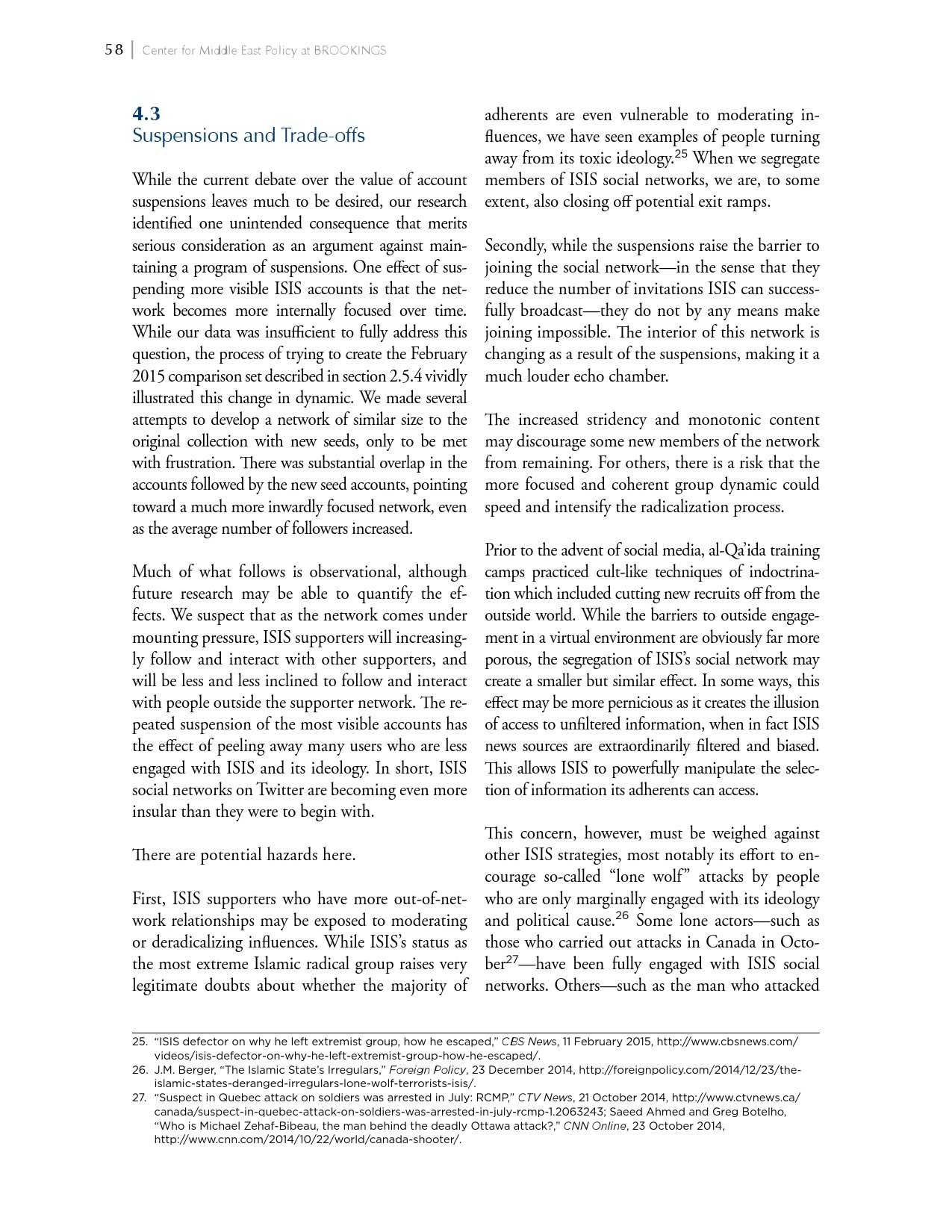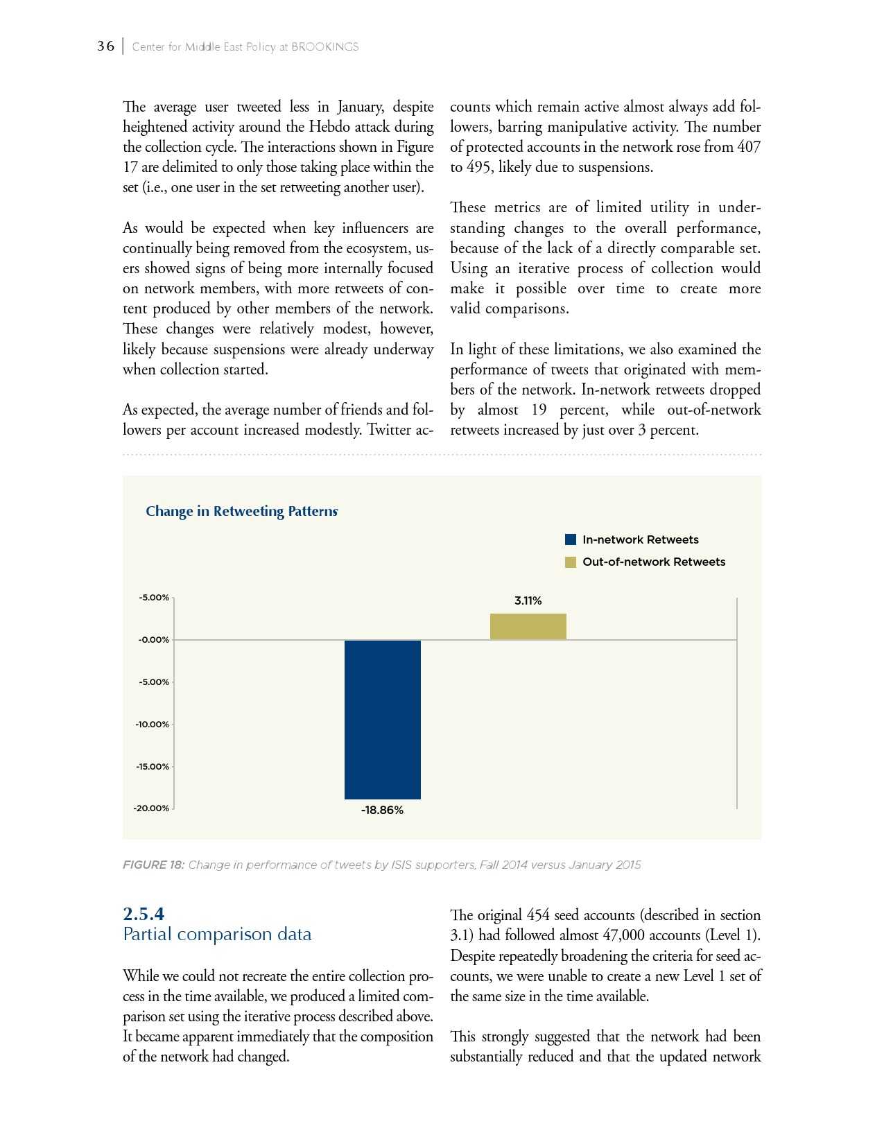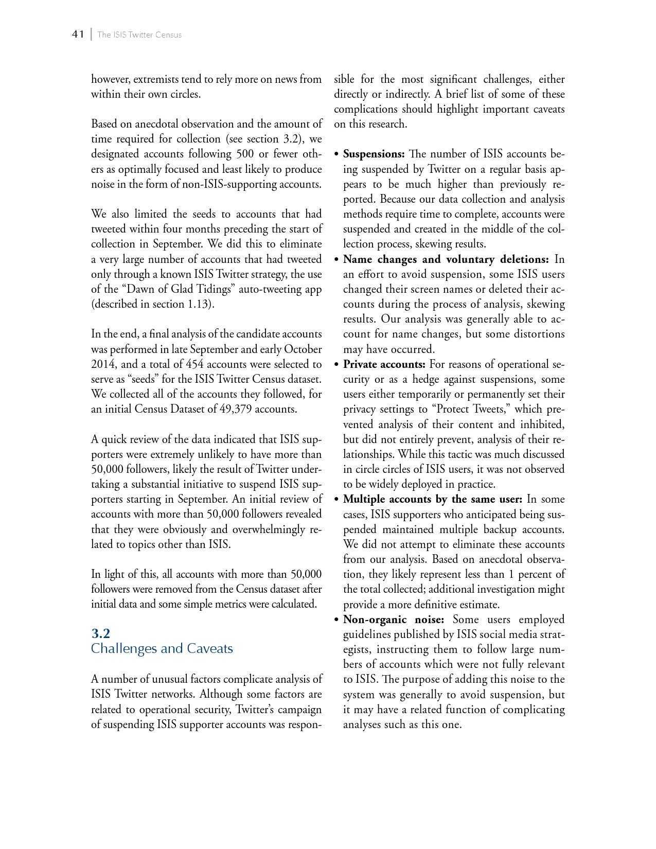 如果Twitter是ISIS发声的重要渠道,我们该不该限制目前已掌握的ISIS支持者帐号?该份研究认为,关停Twitter帐号能在一定程度上限制ISIS在互联网上的影响,在2014年9月的第一轮帐号清理过程中,ISIS支持者创建新帐号的数量锐减,但把时间拉长,支持者会通过大量新建帐号进行反扑。再来,一旦关停ISIS支持者帐号,研究人员就很难通过Twitter上ISIS支持者提供的信息进行情报分析。贝格尔和摩根的研究团队目前已经可以通过比对GPS数据和其他类型的地理信息,来甄别用户是否提供虚假信息。研究团队还指出,关停帐号也容易使ISIS支持者的社交内化──加强对ISIS相关帐号关注,减少与其他群体互动。当支持者越黏住ISIS圈子,ISIS更能操控信息传播,让支持者收到经筛选、过于极端的信息。