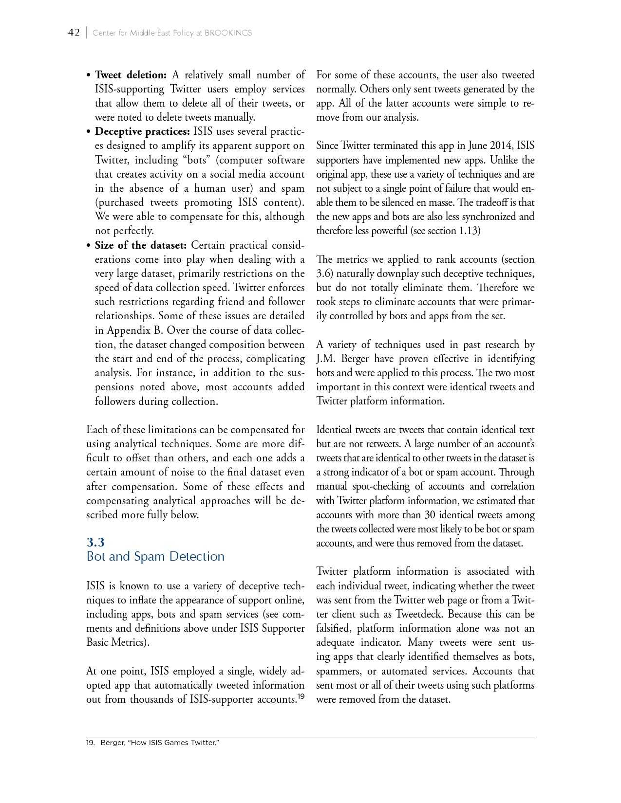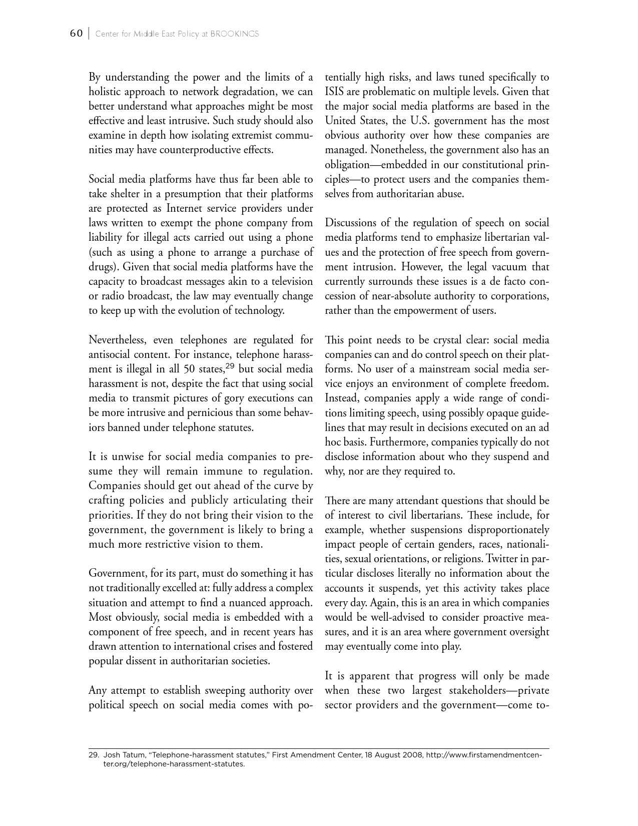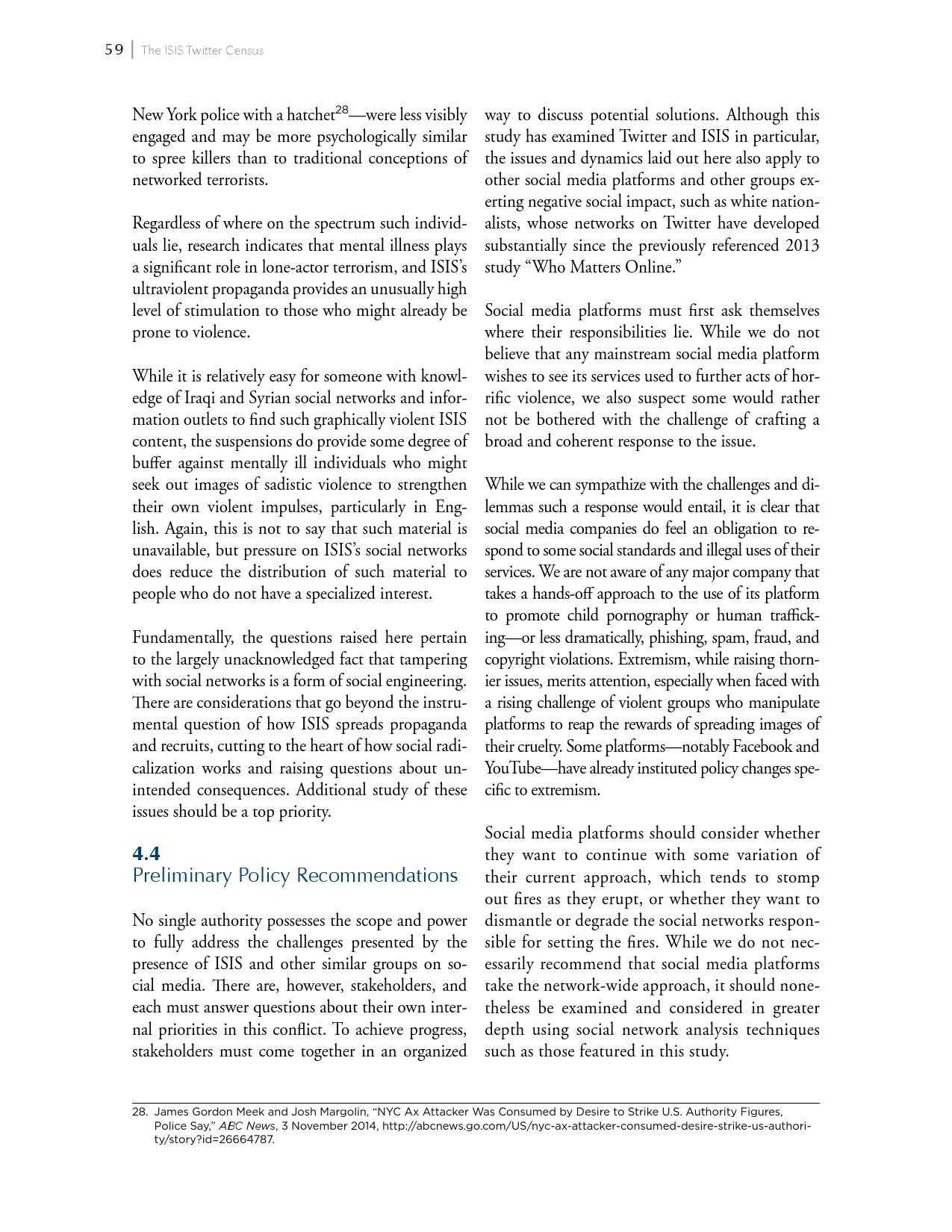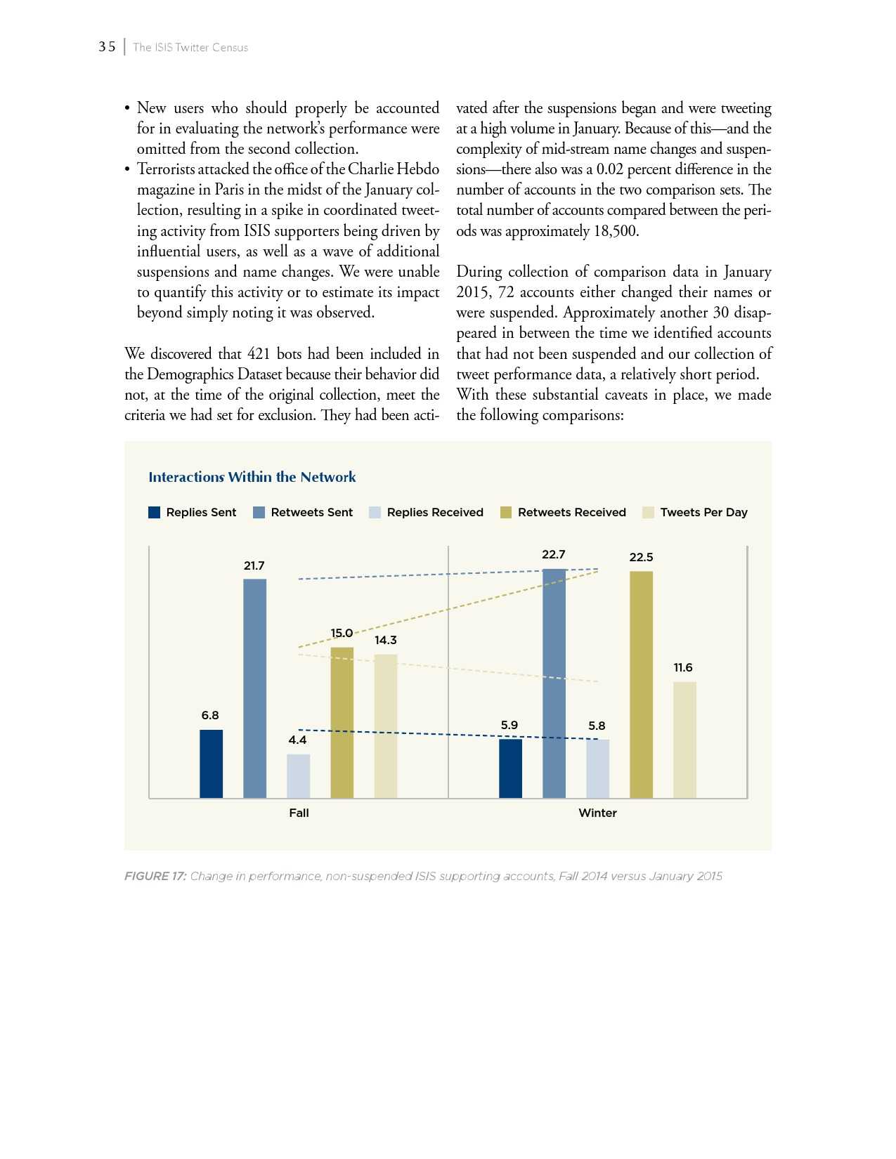 如果Twitter是ISIS发声的重要渠道,我们该不该限制目前已掌握的ISIS支持者帐号?该份研究认为,关停Twitter帐号能在一定程度上限制ISIS在互联网上的影响,在2014年9月的第一轮帐号清理过程中,ISIS支持者创建新帐号的数量锐减,但把时间拉长,支持者会通过大量新建帐号进行反扑。再来,一旦关停ISIS支持者帐号,研究人员就很难通过Twitter上ISIS支持者提供的信息进行情报分析。贝格尔和摩根的研究团队目前已经可以通过比对GPS数据和其他类型的地理信息,来甄别用户是否提供虚假信息。研究团队还指出,关停帐号也容易使ISIS支持者的社交内化──加强对ISIS相关帐号关注,减少与其他群体互动。当支持者越黏住ISIS圈子,ISIS更能操控信息传播,让支持者收到经筛选、过于极端的信息。