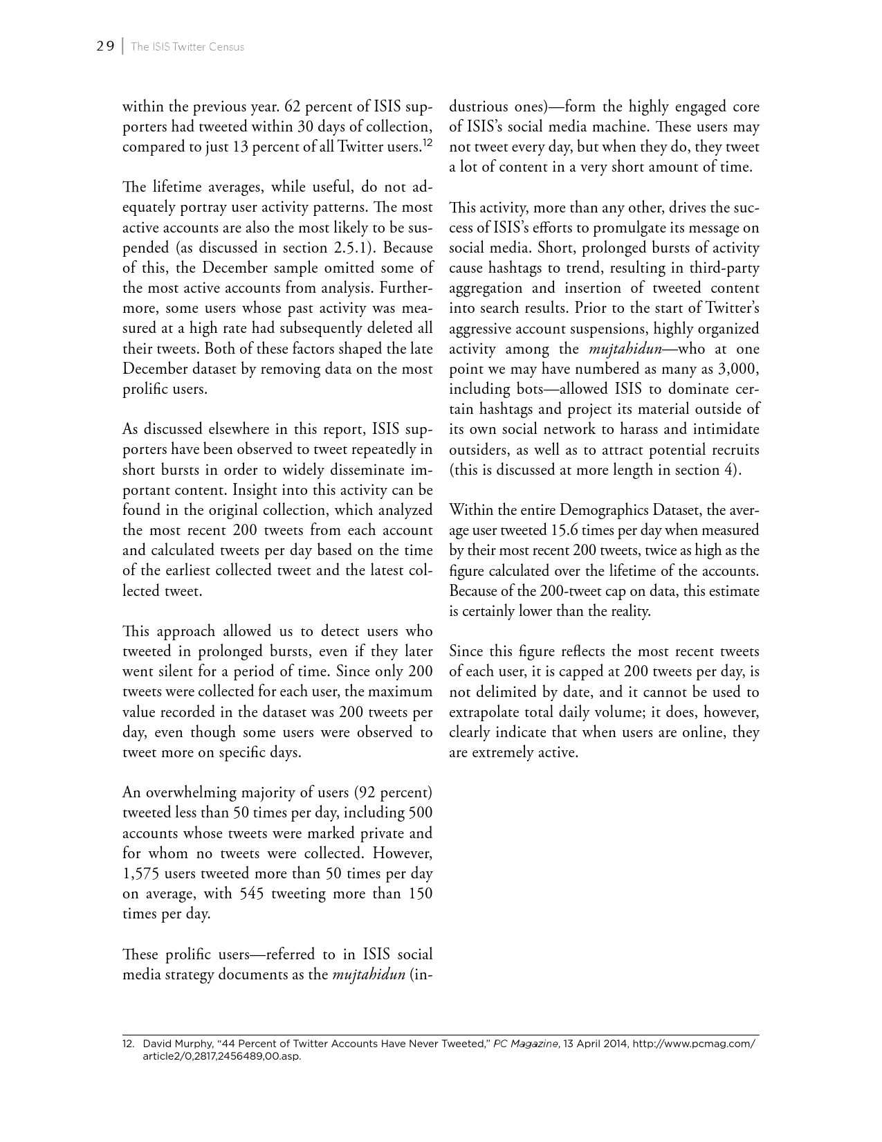 然后来看这些支持者的发文特性。总的看来,ISIS支持者比普通Twitter用户活跃度高。98%的ISIS支持者的Twitter帐号在2014年发过推文,其发文频率甚至超过了67%的Twitter活跃用户。为了传播重要信息,ISIS支持者会在短时间内重复发文,报告显示,有1575位用户日均发文超过50次,这其中更有545位用户日均发文超过150次。