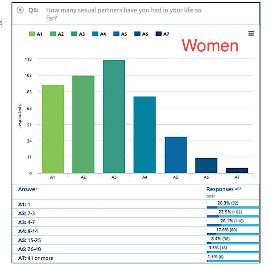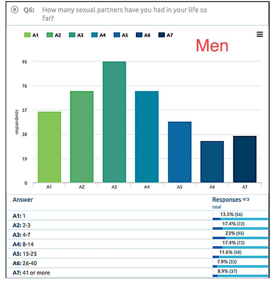 23%的汉子与26%的妹子坦然,一生中与4到7人战过。而总的来说,男人声称自己的伴侣一定多于妹子,45%的男性坦白战过8人以上,9%战过41人以上。