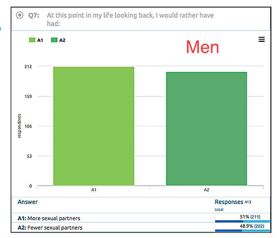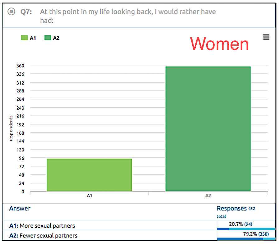反观妹子们,她们相对于男人则收敛许多,满满的罪恶感只因为啪过的人数太多,约80%的妹子希望自己只和真命天子怒啪一生。