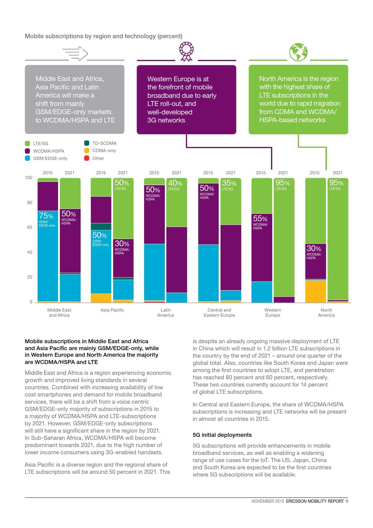 · 中国大陆超过美国成为全球最大的LTE市场:2015年年底,中国大陆将拥有3.5亿LTE用户,占全球总LTE用户数的35%左右。预计到2021年,中国大陆将拥有12亿LTE用户。