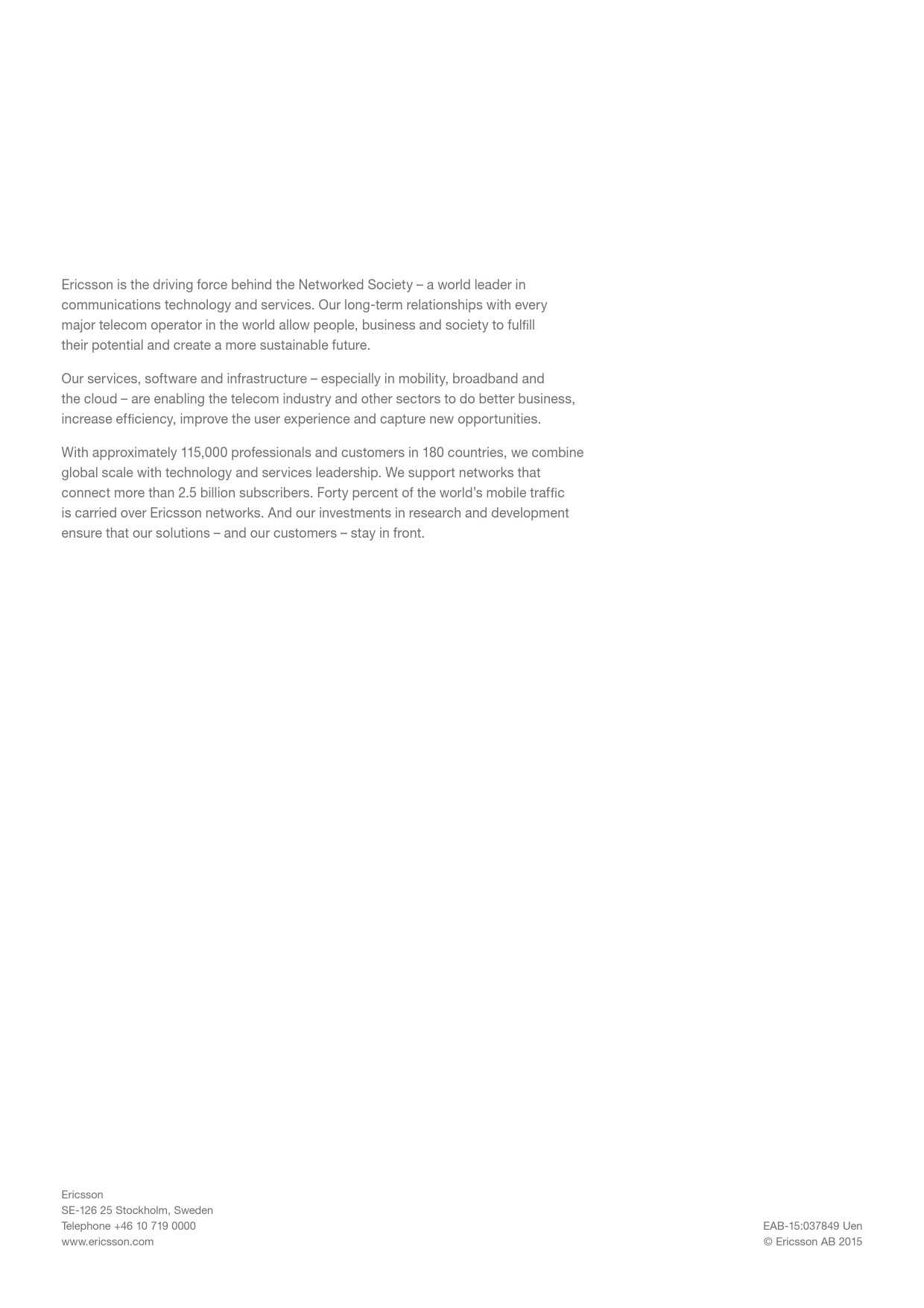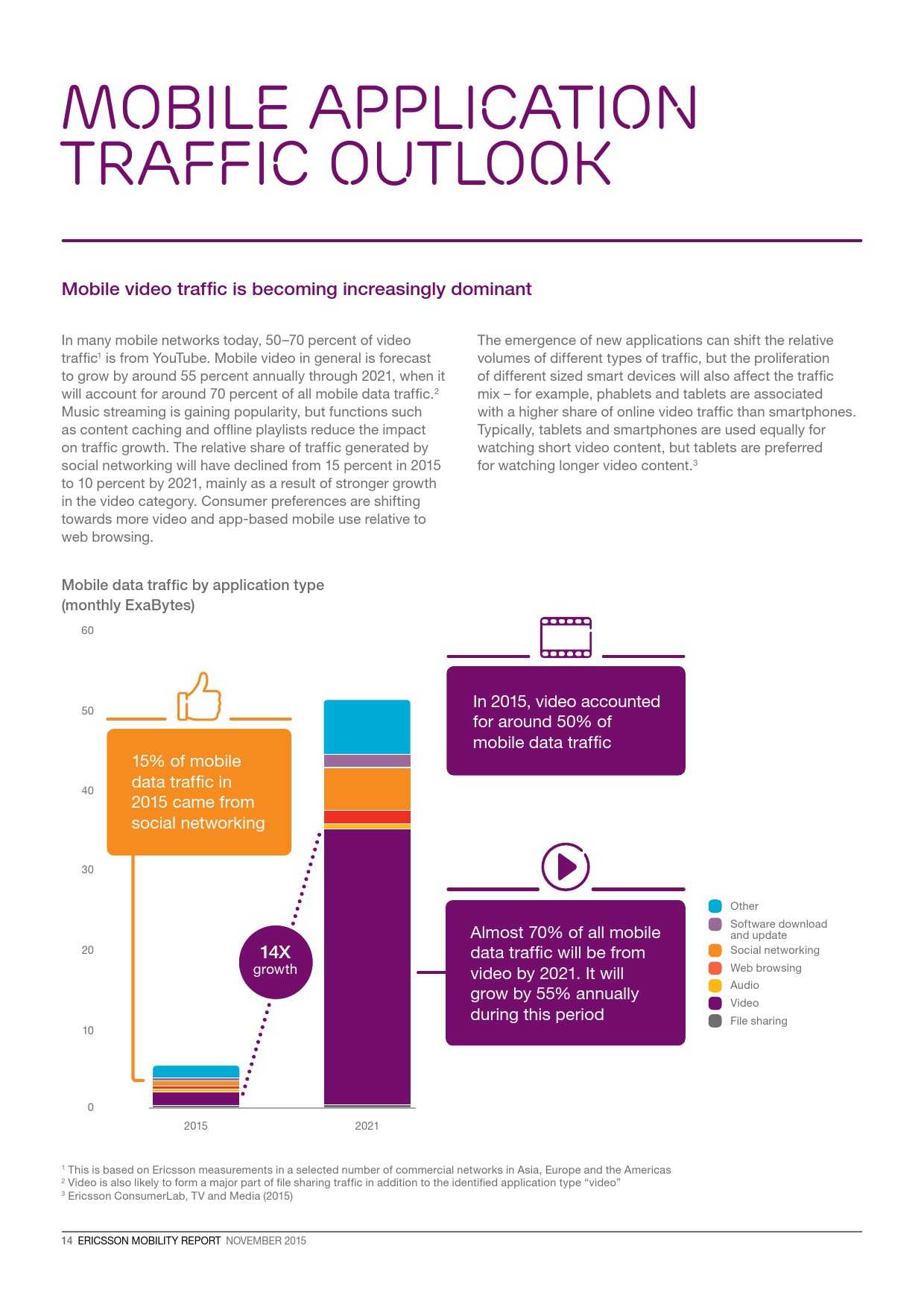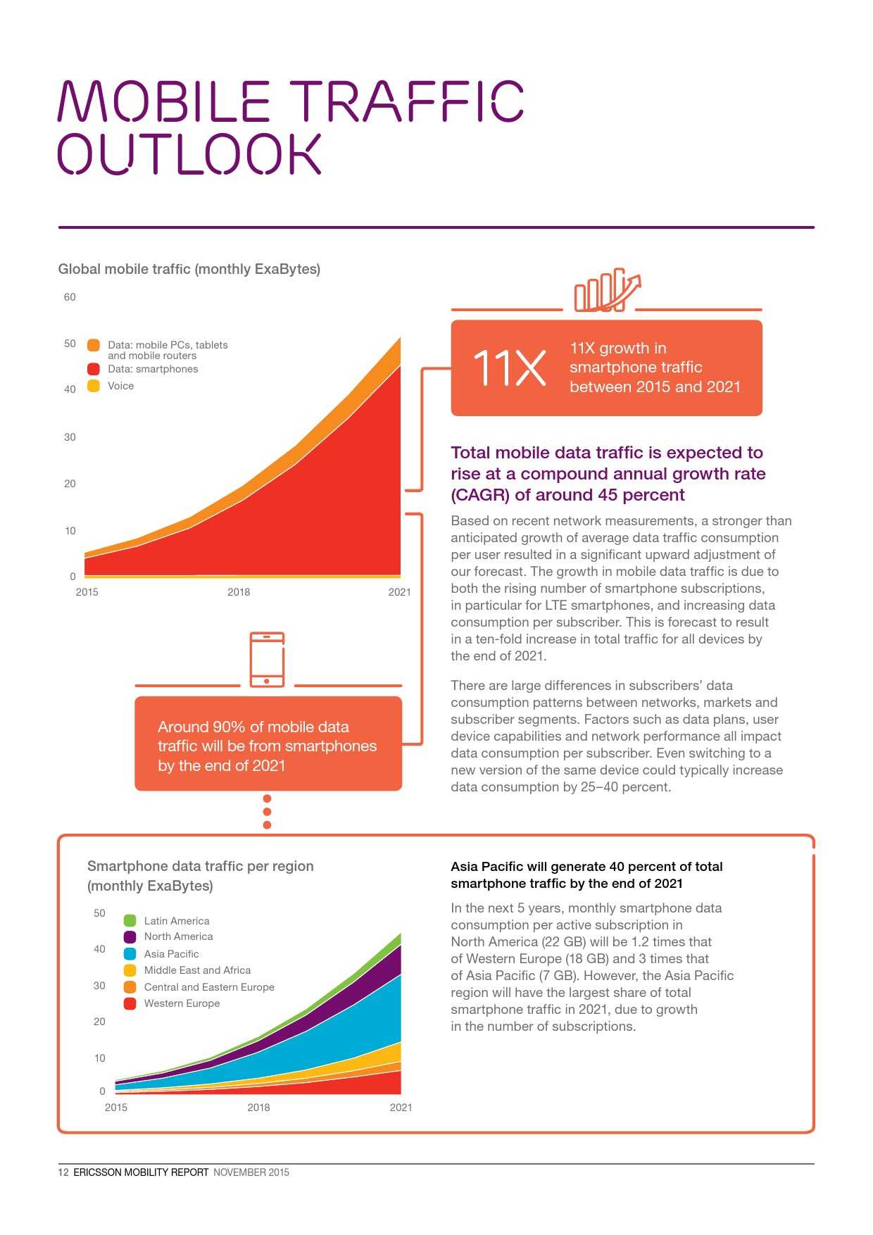 《爱立信移动市场报告》是领先的数据流量分析报告,提供全球各地的现网的深入测量结果。本报告使用测量结果和分析、内部预测及其他相关研究,提供对网络社会目前的流量和市场趋势的洞察。