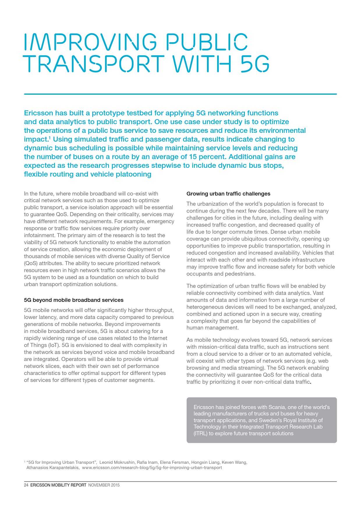 爱立信高级副总裁兼首席战略官Rima Qureshi表示:“5G不仅仅是更快的移动服务,它将使与物联网相关的用例成为现实。例如,爱立信已建立了一个原型测试平台,将5G网络功能和数据分析应用于公共交通,可实现资源节约、减少交通拥堵以及对环境的影响。随着5G将在未来几年从愿景变为现实,各行各业的ICT转型将变得更加普遍。”