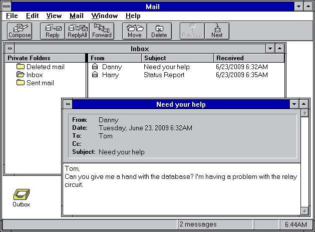 Microsoft Mail 支持在本地网络上发送和接收信息。这是第一种电子邮件,虽然其只具备基本功能。微软于 20 世纪 90 年代末关闭了这个项目。如今,网络上的所有人几乎都有电子邮件账号。仅 Outlook 就有 4 亿多用户,Google Mail 的用户约有 4.5 亿人。