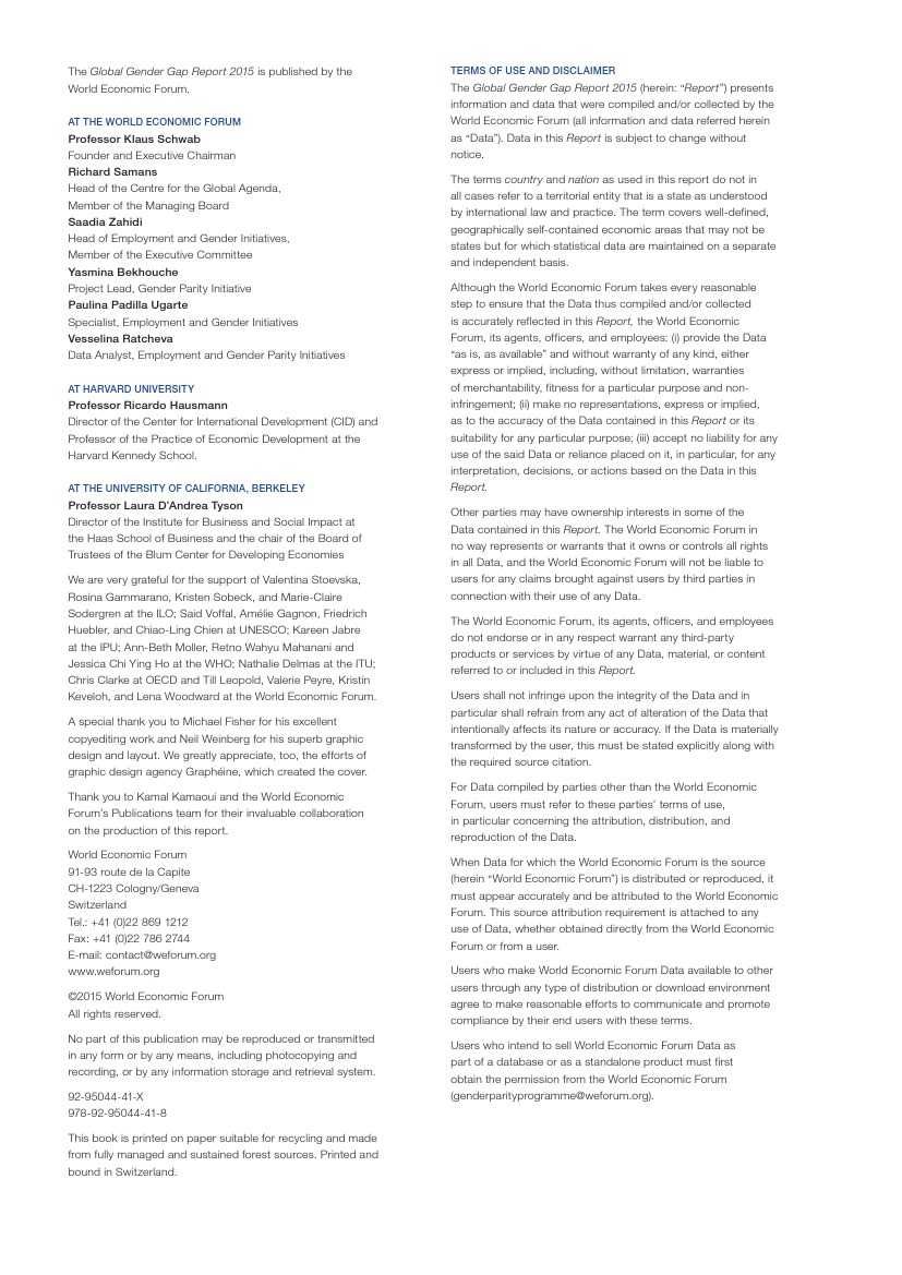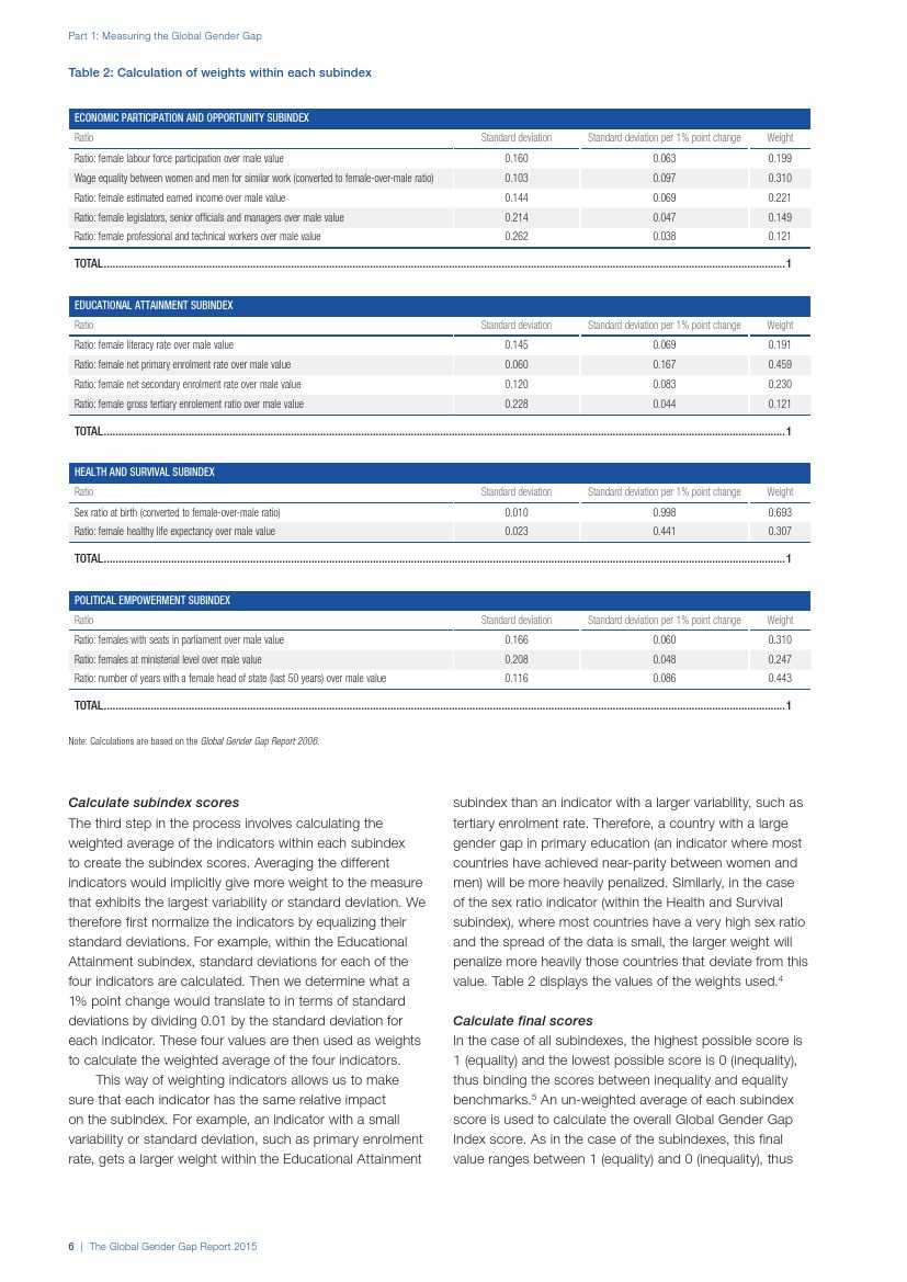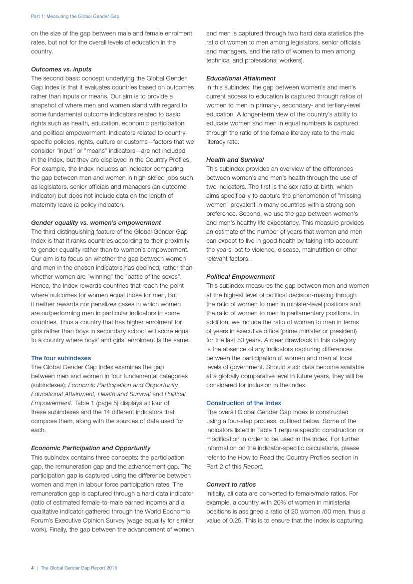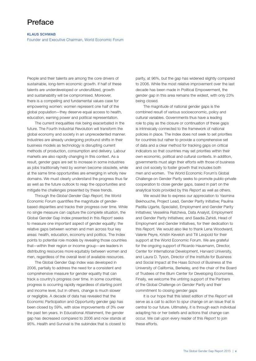 《全球性别差距报告》是一份展示男女间在经济地位、学习机会、政治参与及健康卫生四个范畴中的差距的报告。调查在全球145个国家中进行。报告由世界经济论坛于2006年在瑞士首次发表,其后每年发表一次。