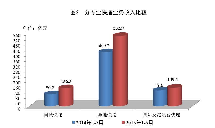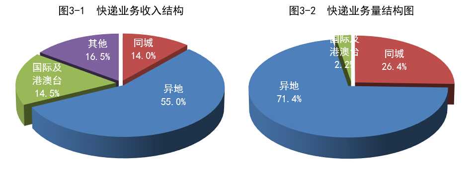 1-5月,同城、异地、国际及港澳台快递业务收入分别占全部快递收入的14%、55%和14.5%;业务量分别占全部快递业务量的26.4%、71.4%和2.2%。与去年同期相比,同城快递业务收入的比重上升1.7个百分点,异地快递业务收入的比重下降0.7个百分点,国际及港澳台业务收入的比重下降了1.8个百分点。