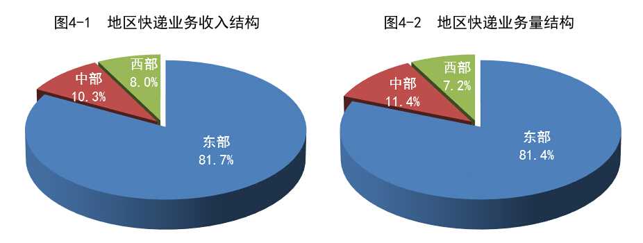1-5月,东、中、西部地区快递业务收入的比重分别为81.7%、10.3%和8%,业务量比重分别为81.4%、11.4%和7.2%。与去年同期相比,东部地区快递业务收入比重下降了1.1个百分点,快递业务量下降了0.1个百分点;中部地区快递业务收入比重上升了0.8个百分点,快递业务量比重上升了0.4个百分点;西部地区快递业务收入比重上升了0.3个百分点,快递业务量比重下降了0.3个百分点。