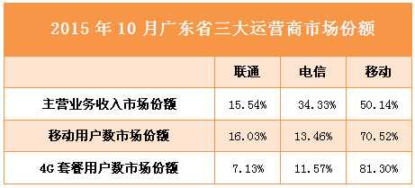 从广东省三大运营商市场份额看,移动这个月还是处于下滑的状态,主营业务收入,移动用户数和4G套餐用户数三方面分别下降了2.58%,0.24%和0.86%。而联通和电信都是一点一点的上升;主营业务收入方面,联通上涨了1.5%,而电信则上涨了1.09%,市场份额占比达到了34.33%;移动用户数和4G套餐用户数方面,联通分别上涨了0.19%和0.28%,电信则分别上涨了0.05%和0.57%。