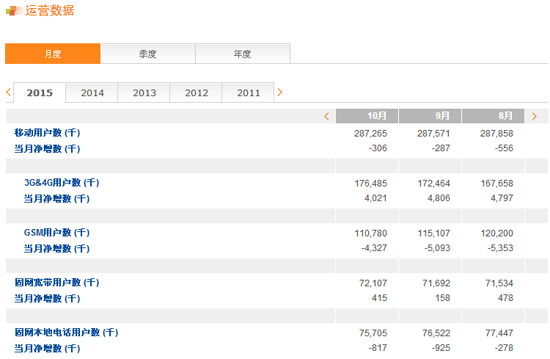 2015年10月份中国联通移动用户减少30.6万 连续9个月下降 11月20日消息 中国联通昨日下午公布了2015年10月运营数据。 移动业务方面,10月移动用户减少30.6万,累计为2亿8726.5万。这是公司移动用户自今年2月份以来,连续第9个月出现下降的情况。移动宽带用户10月净增402.1万,累计为1亿7648.5万。 固网业务方面,10月固网宽带用户本月净增41.5万,累计为7210.7万;本地电话本月减少81.7万,累计为7570.5万。 更多阅读:工信部:2022年9月中国户均月流量达 15.01GB 同比增长 12.4%中国联通财报:2022年中国联通净利润72.99亿元 同比增长15.8%中国联通财报:2022年前三季度中国联通营业收入为人民币 2639.78 亿元 同比增长 8.0%中央网信办:截至2022年7月中国IPv6活跃用户数达6.97亿工信部:三大运营商移动电话用户达到16.72亿户 5G用户占比28%工信部:2022年移动互联网用户数达14.55亿户 比上年末净增3955万户2022年上半年中国电信、移动、联通三大运营商合计实现营收约9133.8亿元中国移动:2022年6月中国移动5G套餐客户数5.109亿户2022年Q1三大运营商合计净利润348.54亿元 日赚3.8亿2021年Q1三大运营商运营数据 中国移动客户总数负增长中国移动七名高管税前年薪过百万 平均薪资居运营商首列上海市通信管理局:2023年5G个人用户普及率超过50%2021年三大运营商共营收超1.6万亿元 净利润约1564.6亿元测速网:2021年全国网络速度和质量报告国内三大运营商2021年日赚超4亿 联通收入增速创八年新高