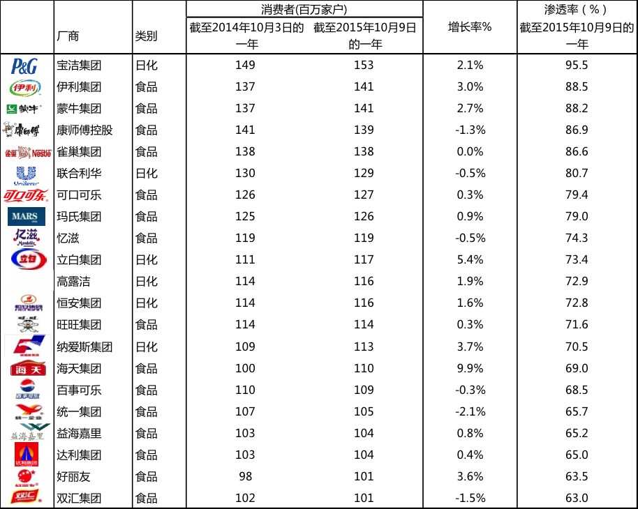 全球领先的消费者市场研究机构凯度消费者指数1截至2015年10月9日的52周的报告显示,中国共有21家快速消费品企业拥有过亿的城市购买家庭, 而在2012年仅有15家企业进入榜单。这一变化说明说明更多的中国快速消费品企业通过有机增长或者并购不断地扩大消费者规模,实现增长。 在2015年覆盖过亿家庭的企业中,11家为中国企业。宝洁中国吸引了1.53亿城市家庭,列位榜首,本土乳业巨头伊利和蒙牛的消费者规模较去年有明显提升,分居第二和第三位。位列三甲的企业整体的家庭渗透率2分别达到95.5%、88.5% 和88.2%。