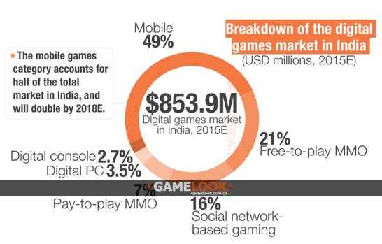 由于没有比较大的本地游戏市场零售商,因此印度地区的游戏业由数字游戏主导,PC游戏带来了比较复杂的增长状况,随着付费游戏以及社交网络游戏的衰退,免费游戏和PC DLC游戏收入增长,SuperData预计2015年印度数字游戏市场收入8.54亿美元,其中最主要的游戏市场就是手游(占比49%),在2015年的收入将达到4.16亿美元规模,年均增长率为64%。