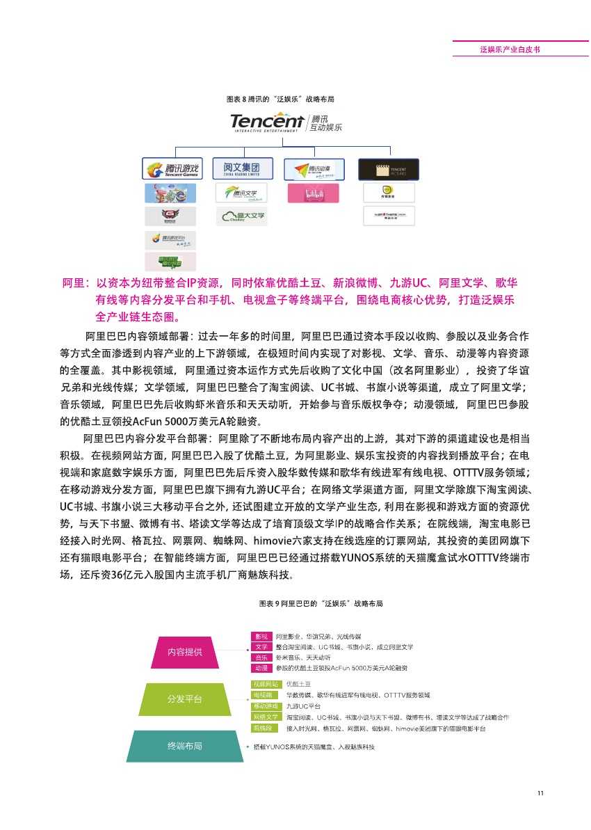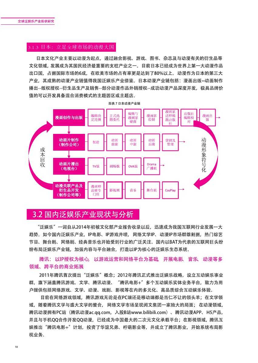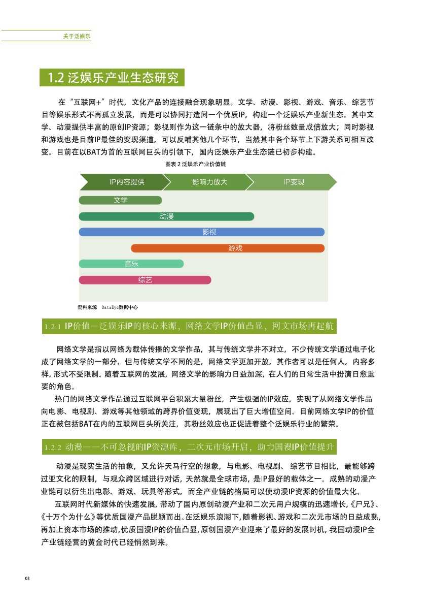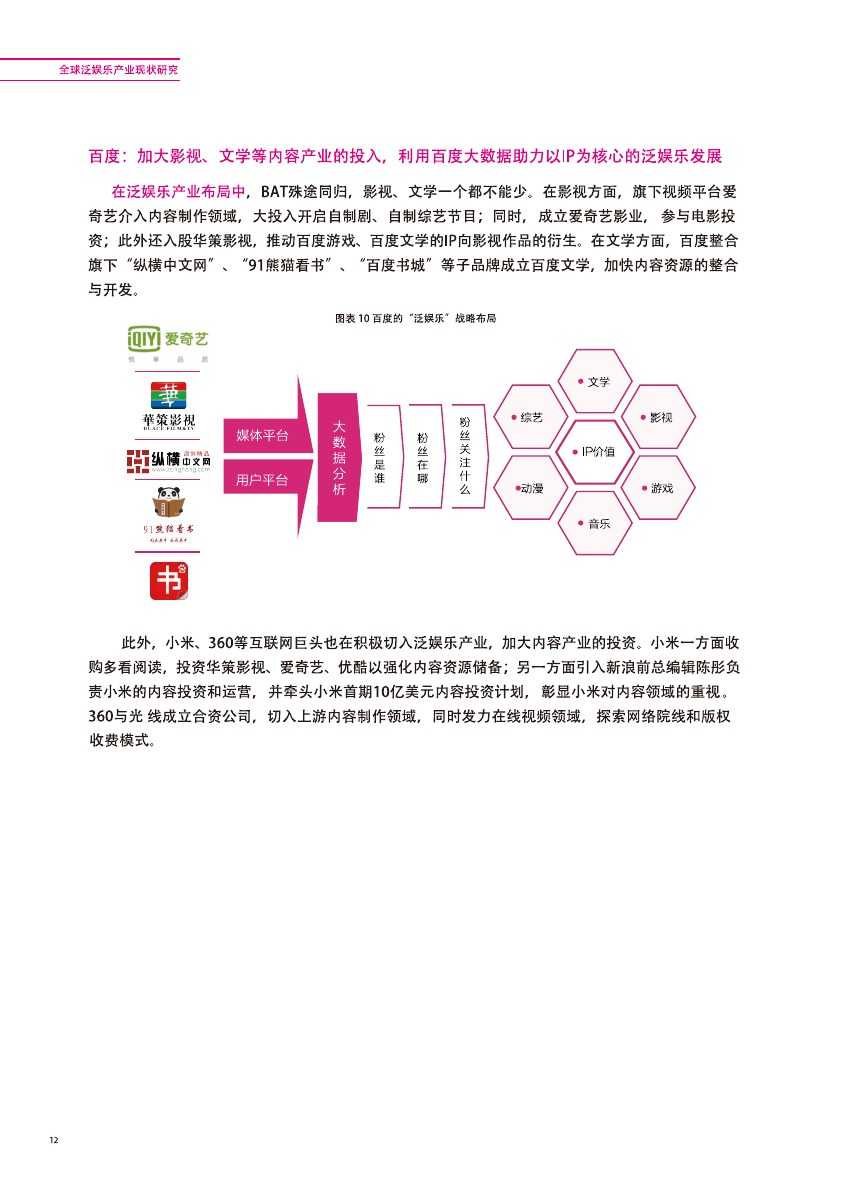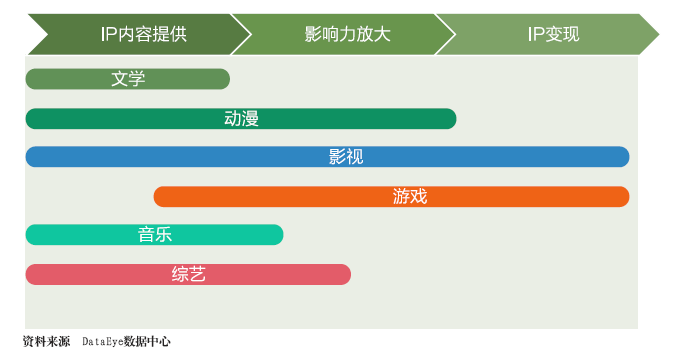 在“互联网+”时代,文化产品的连接融合现象明显。文学、动漫、影视、游戏、音乐、综艺节目等娱乐形式不再孤立发展,而是可以协同打造同一个优质IP,构建一个泛娱乐产业新生态。其中文学、动漫提供丰富的原创IP资源;影视则作为这一链条中的放大器,将粉丝数量成倍放大;同时影视和游戏也是目前IP最佳的变现渠道,可以反哺其他几个环节,当然其中各个环节上下游关系可相互改变。目前在以BAT为首的互联网巨头的引领下,国内泛娱乐产业生态链已初步构建。