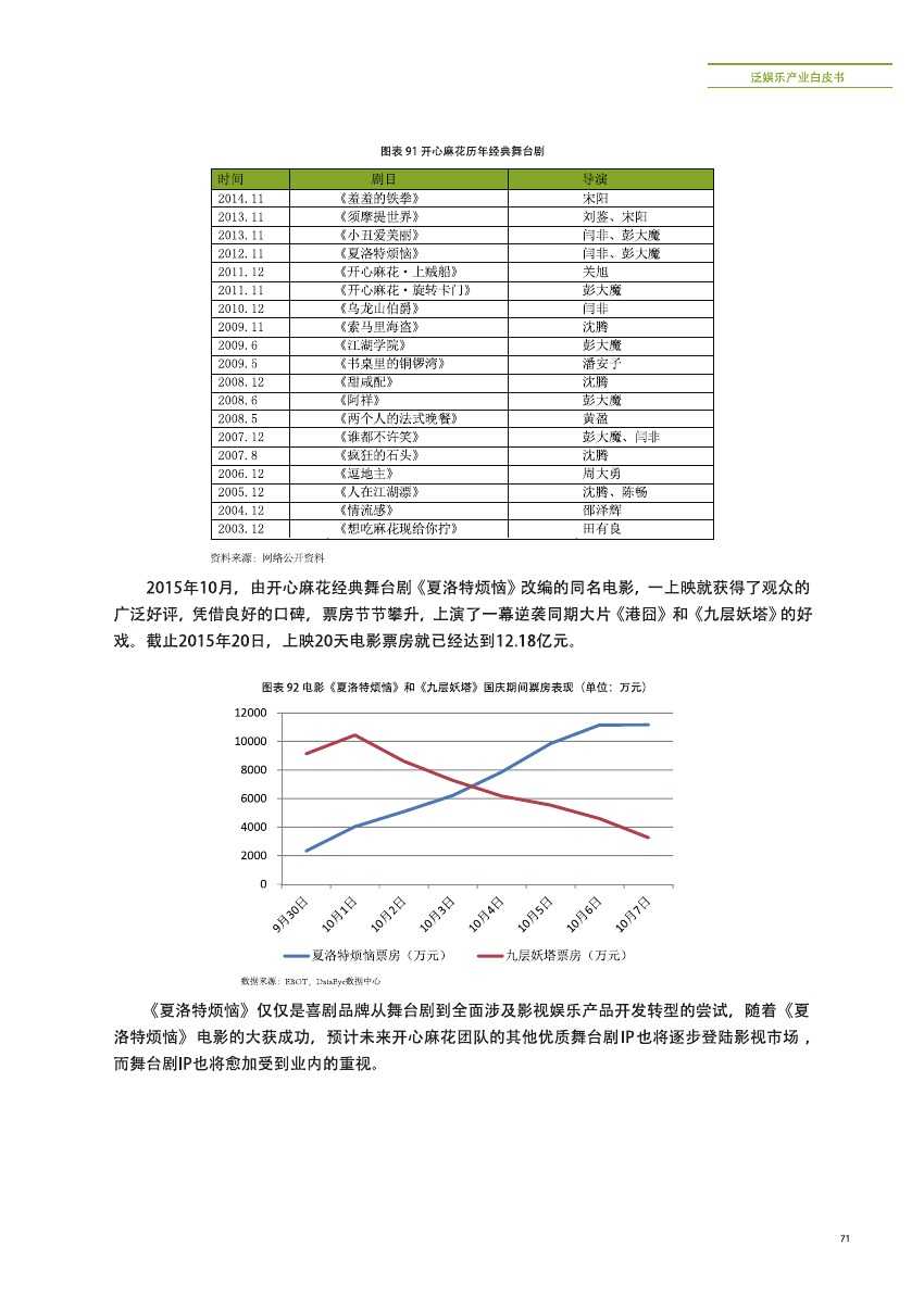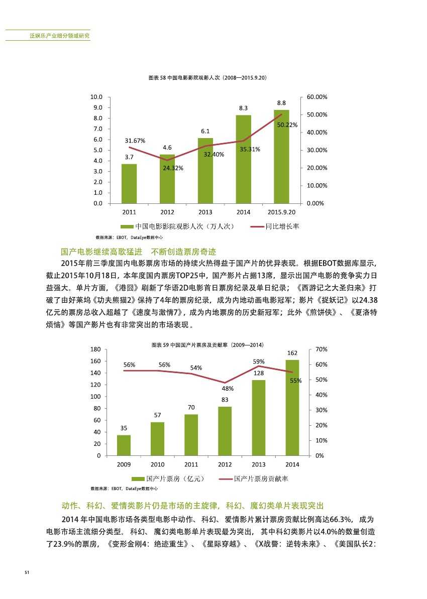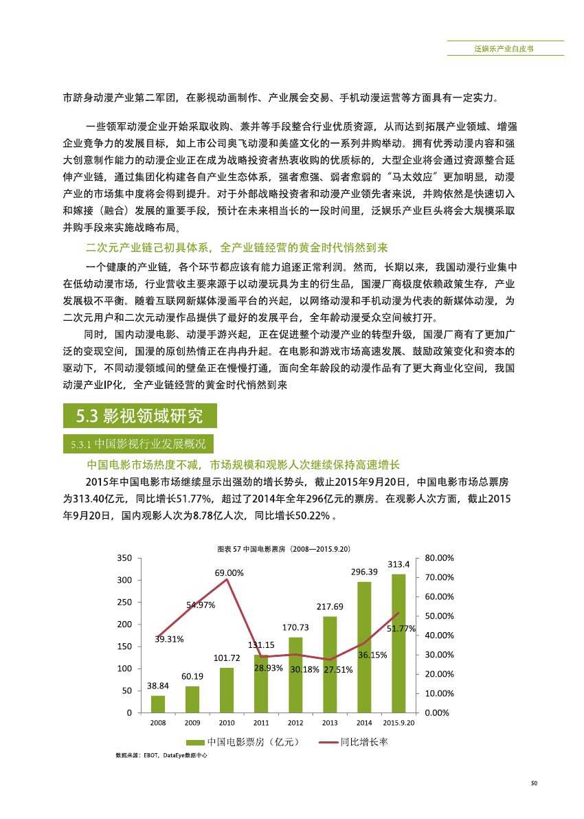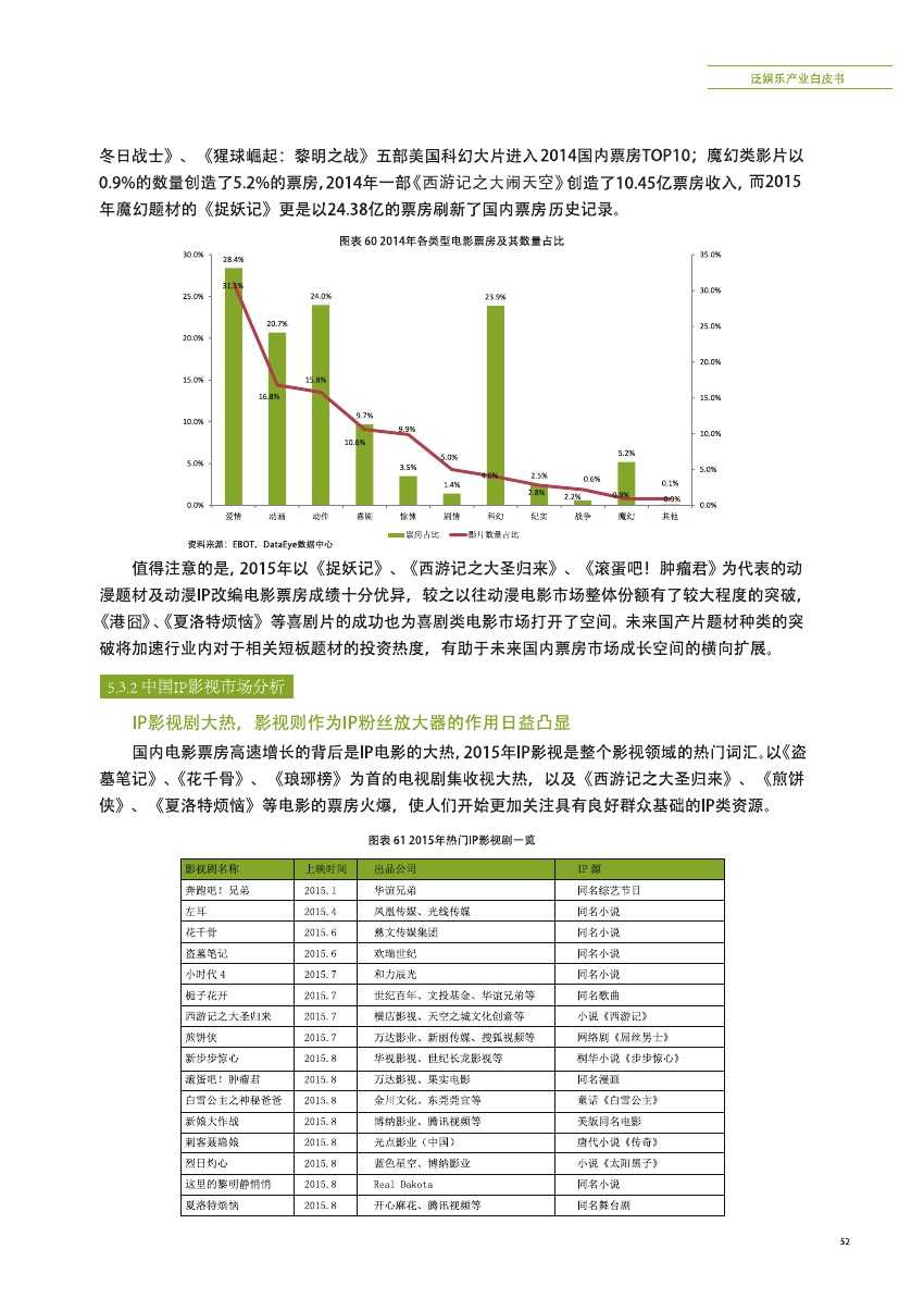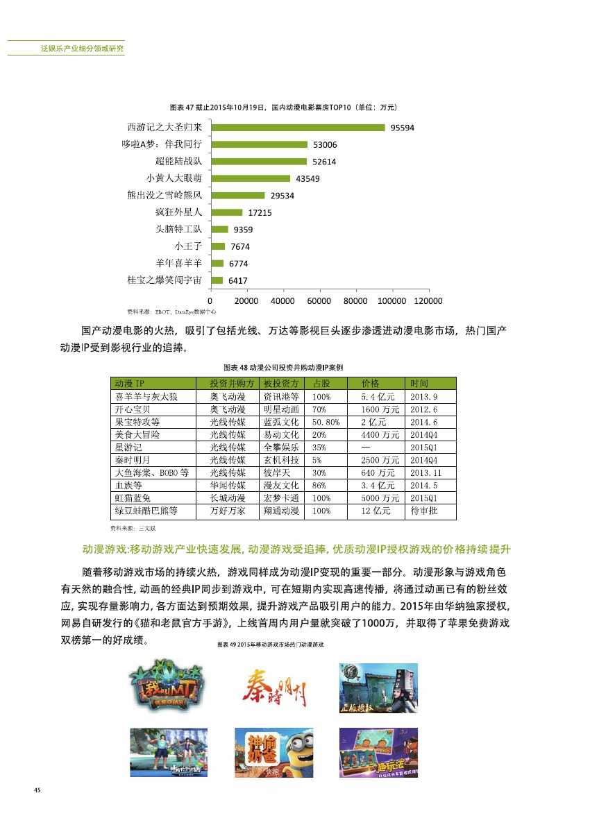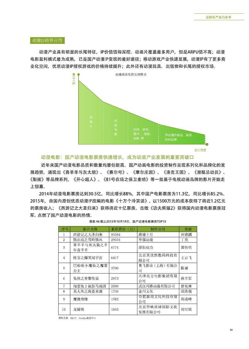 截止2015年9月20日,内地电影市场总票房为313.40亿元,同比增长51.77%,已经超过了2014年全年296亿元的票房,中国电影市场继续显示出强劲的增长势头。国内电影票房高速增长的背后是IP电影的大热,《西游记之大圣归来》、《煎饼侠》、《夏洛特烦恼》等IP电影的票房火爆,让人们开始更加关注具有良好群众基础的IP类资源,也使得电影成为IP最佳变现渠道之一。与此同时,随着近期以《盗墓笔记》、《花千骨》、《琅琊榜》为首的电视剧收视大热,影视作为IP粉丝放大器的作用也日益显现。