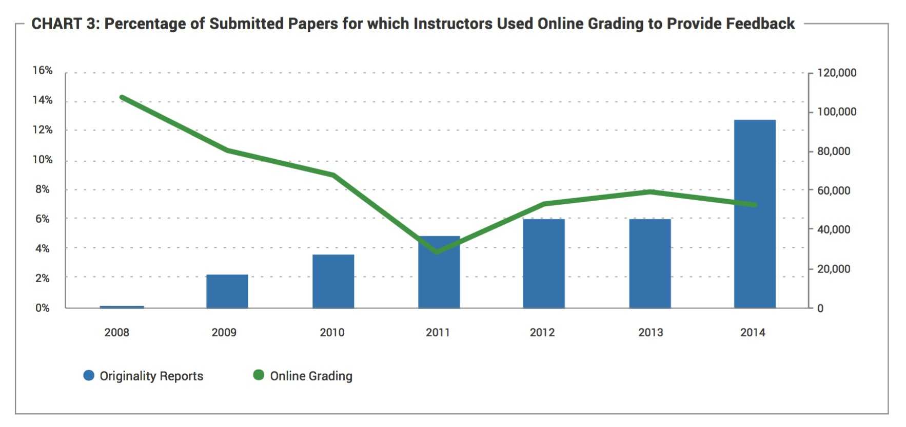 -一项在全球范围内开展、为期数年的中学与大学调查的结果表明非原创写作显著减少,同时人们日益采用网上评分和学生反馈工具。