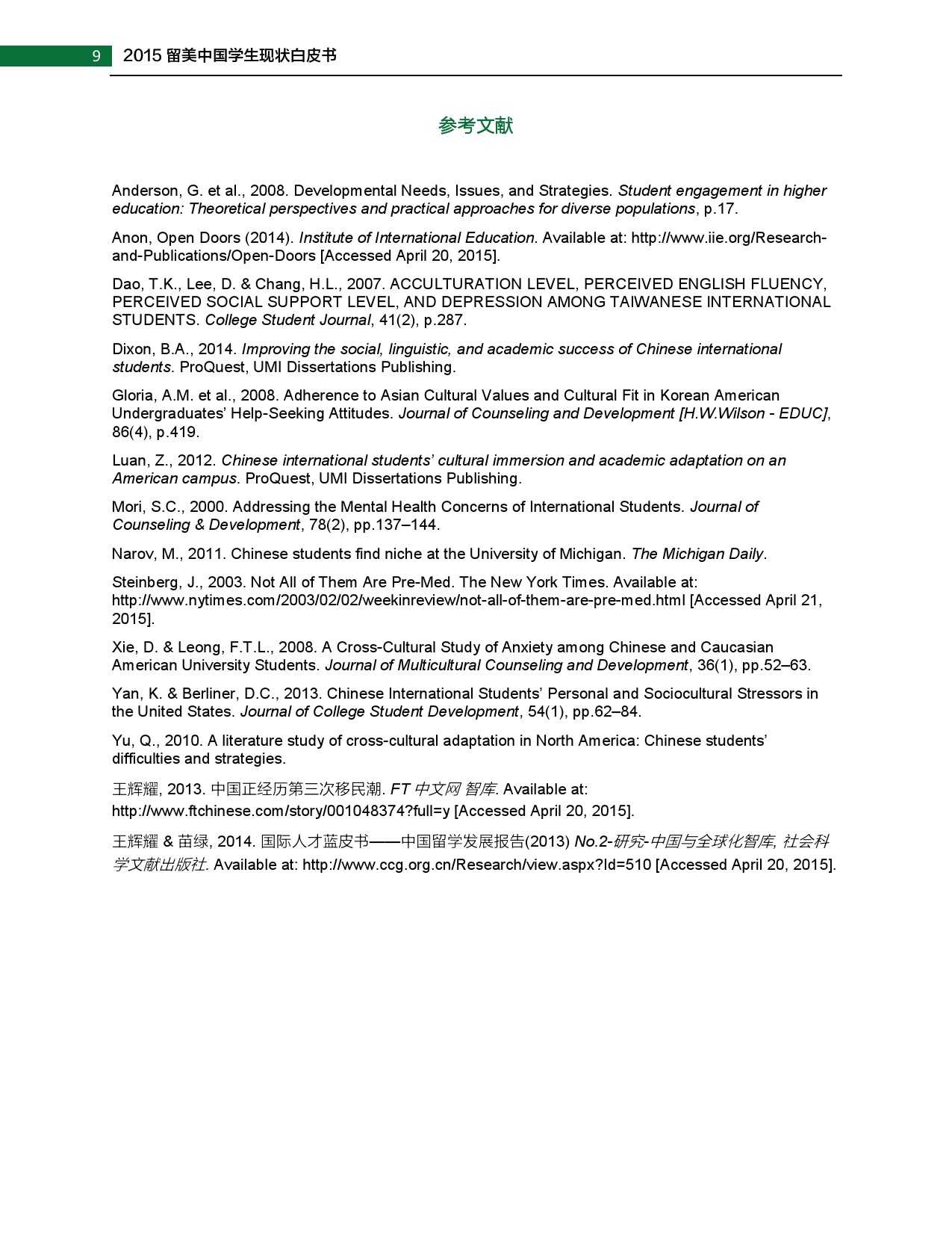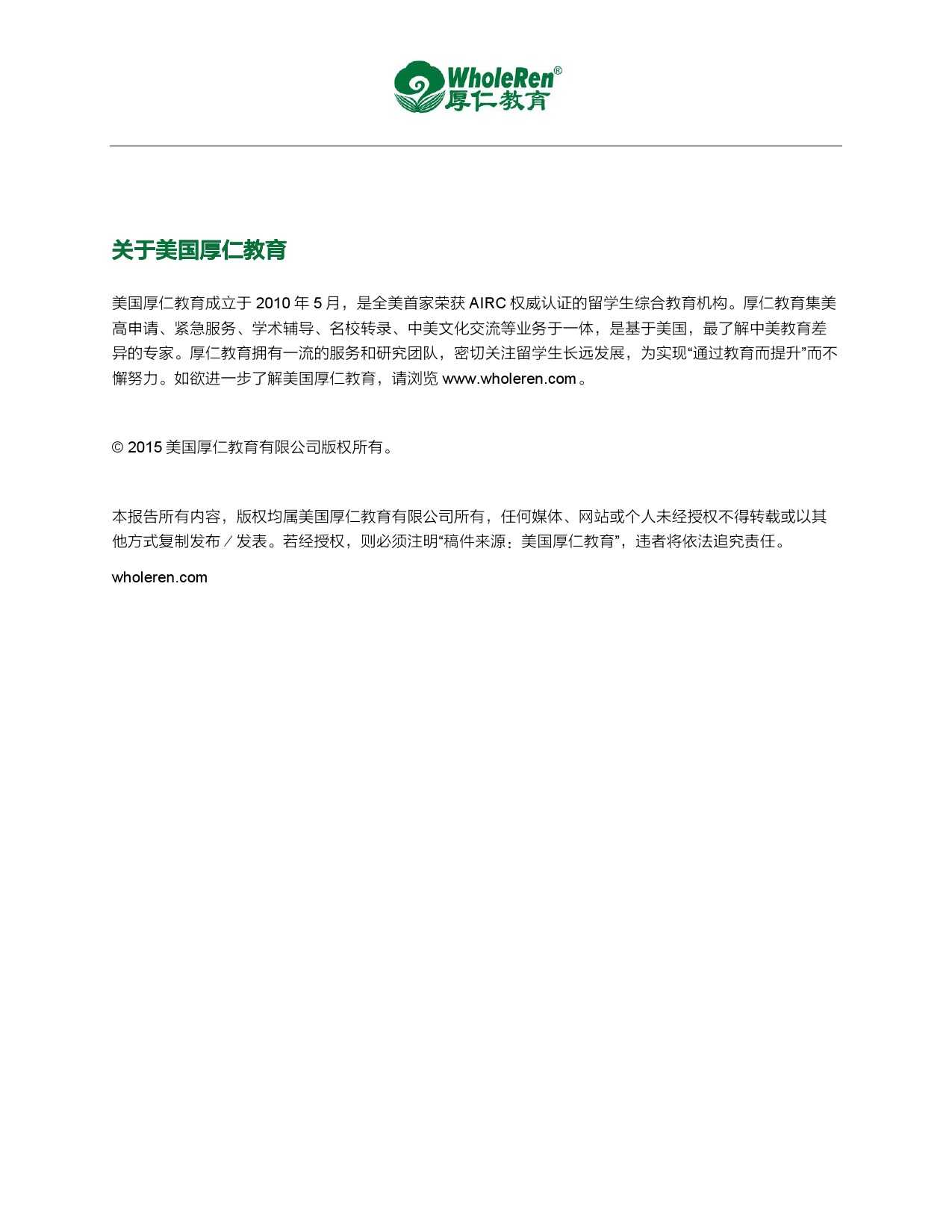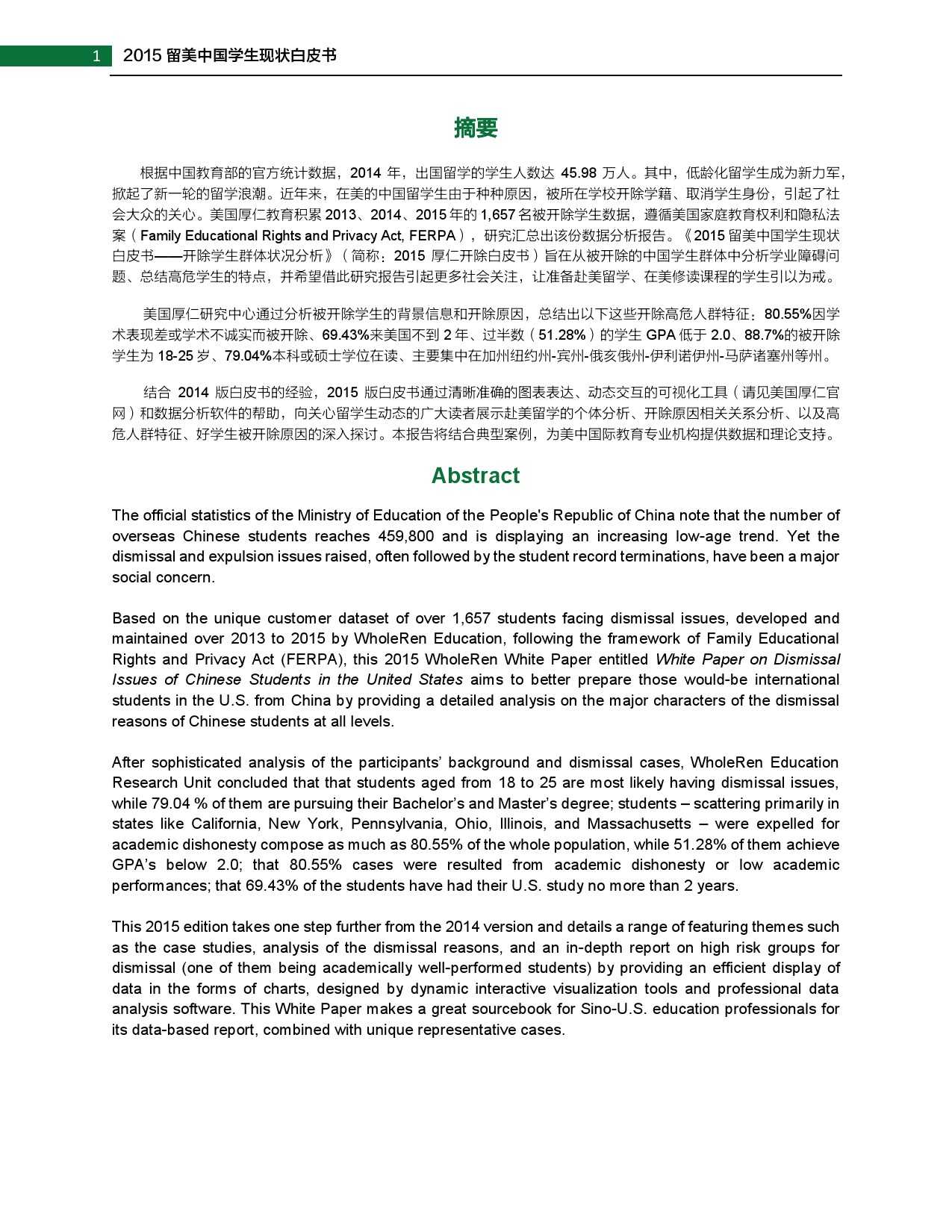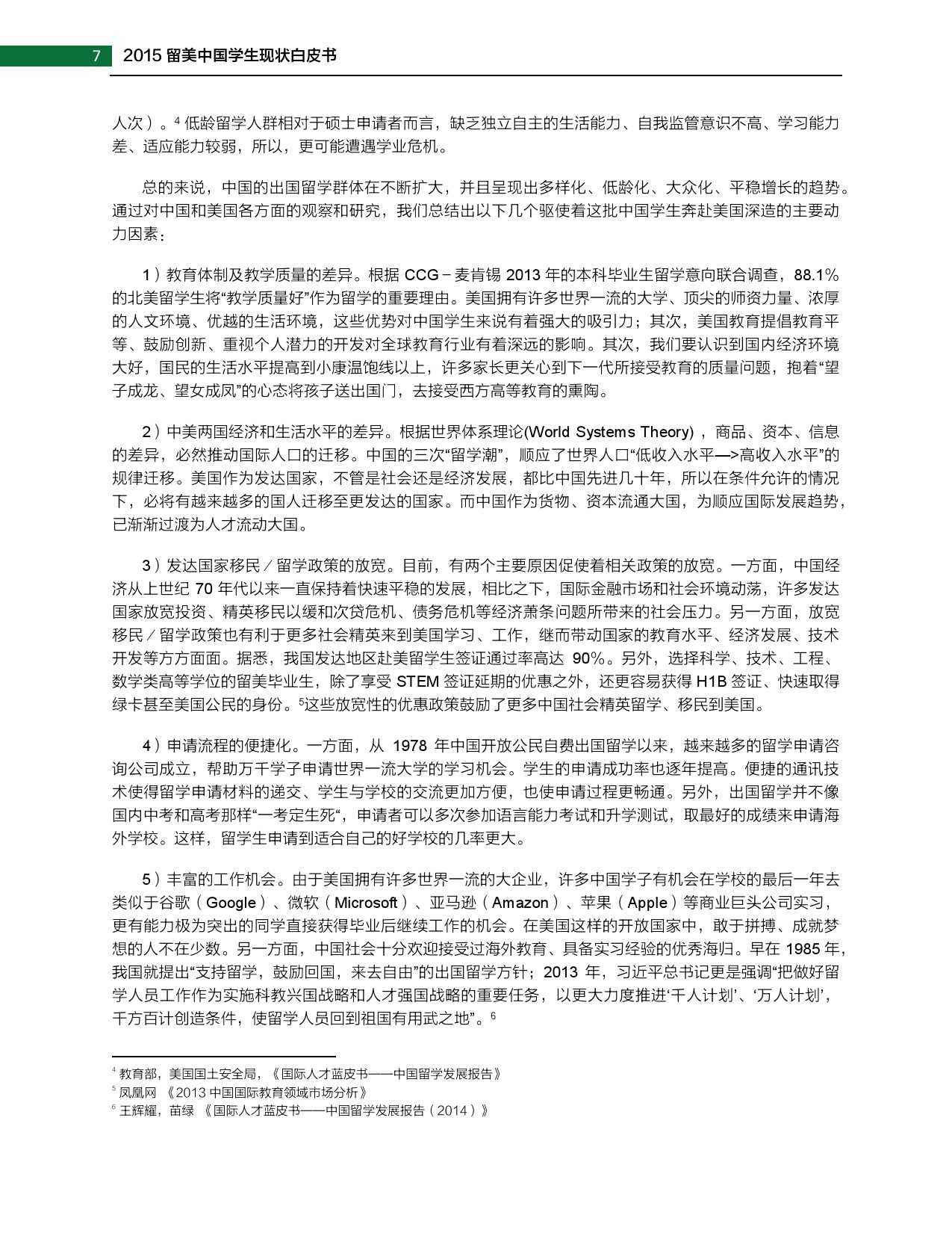 2015年留美中国学生现状白皮书 更多阅读:武书连:2015年中国大学排行榜2015年全球营养报告中怡康:2015年厨卫市场年中盘点联合国儿童基金会:2015年世界儿童状况西南财大&成都红娘:2015年成都婚恋调查2015年在线教育用户行为调查报告蚂蜂窝:2015年全球旅游购物报告阿里研究院:2015年网商发展研究报告世界银行:2015年世界发展报告中国信息通信研究院:2015年中国信息经济研究报告2015年中国专有云发展调查报告2015年中国公共云服务发展调查清研智库:2015年网络视频校园用户行为调查2015年生活服务类移动应用白皮书2015年上半年京东智能硬件行业报告(PPT完整版)